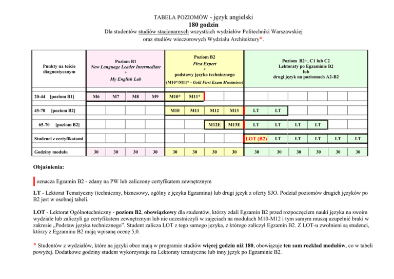 TABELA POZIOMÓW - język angielski 180 godzin Dla studentów studiów stacjonarnych wszystkich wydziałów Politechniki Warszawskiej oraz studiów wieczorowych Wydziału Architektury*. Punkty na teście diagnostycznym 20-44 [poziom B1] 45-70 [poziom B2] 65-70 Poziom B1 New Language Leader Intermediate + My English Lab M6 M7 M8 M9 Poziom B2 First Expert + podstawy języka technicznego (M10*/M11* - Gold First Exam Maximiser) M10* M11* M10 M11 [poziom B2] M12 M13 LT LT M12E M13E LT LT LT LT LOT (B2) LT LT LT LT LT 30 30 30 30 30 30 Studenci z certyfikatami Godziny modułu 30 30 30 30 Poziom B2+, C1 lub C2 Lektoraty po Egzaminie B2 lub drugi język na poziomach A2-B2 30 30 30 30 Objaśnienia: oznacza Egzamin B2 - zdany na PW lub zaliczony certyfikatem zewnętrznym LT - Lektorat Tematyczny (techniczny, biznesowy, ogólny z języka Egzaminu) lub drugi język z oferty SJO. Podział poziomów drugich języków po B2 jest w osobnej tabeli. LOT - Lektorat Ogólnotechniczny - poziom B2, obowiązkowy dla studentów, którzy zdali Egzamin B2 przed rozpoczęciem nauki języka na swoim wydziale lub zaliczyli go certyfikatem zewnętrznym lub nie uczestniczyli w zajęciach na modułach M10-M12 i tym samym muszą uzupełnić braki w zakresie „Podstaw języka technicznego”. Student zalicza LOT z tego samego języka, z którego zaliczył Egzamin B2. Z LOT-u zwolnieni są studenci, którzy z Egzaminu B2 mają wpisaną ocenę 5,0. * Studentów z wydziałów, które na języki obce mają w programie studiów więcej godzin niż 180, obowiązuje ten sam rozkład modułów, co w tabeli powyżej. Dodatkowe godziny student wykorzystuje na Lektoraty tematyczne lub inny język po Egzaminie B2.