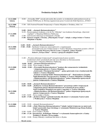 Świdnicka Kolęda 2008 13.12.2008 Sobota 10.00 – „Gwiazdka 2008” zawody pływackie dla uczniów ze świdnickich szkół podstawowych na basenie ŚOSiR przy ul. Równej organizowane przez Uczniowski Klub Sportowy „SVIDA” 16.12.2008 Wtorek 17.00 – XIX Festiwal Piosenki Świątecznej w Teatrze Miejskim w Świdnicy, bilet 3 zł 17.12.2008 środa 18.12.2008 czwartek 19.12.2008 piątek 20.12.2008 sobota 21.12.2008 niedziela 14.00 – 18.00 – „Jarmark BoŜonarodzeniowy” 16.30 – Rozstrzygnięcie konkursu „List do Św. Mikołaja” oraz konkursu literackiego „Opowieść wigilijna” w Miejskiej Bibliotece Publicznej 17.00 – Zaświecenie dekoracji na fontannach w Rynku 17.00 – Koncert zespołu z Ukrainy „Pikardyjska Tercja” – kolędy z całego świata w Teatrze Miejskim w Rynku 14.00 – 18.00 – „Jarmark BoŜonarodzeniowy” 17.00 – 19.00 – Spotkanie świąteczne samorządowców z organizacjami pozarządowymi oraz świdniczanami w Teatrze Miejskim z koncertem uczniów z III LO oraz Gwiazdą Wieczoru Marcia Leone z zespołem „Zakaz Wjazdu” – koncert „Gorąca Zima” – utwory z gorących zakątków świata 11.00 – „Wystawa dekoracji świątecznych” przygotowanych przez uczniów świdnickich szkół i przedszkoli jako dar serca dla dzieci ze Stowarzyszenia Ut Unum Sint w Miejskiej Bibliotece Publicznej 14.00 – 18.00 – „Jarmark BoŜonarodzeniowy” 15.00 – 18.00 – śywa szopka w Rynku 16.00 – 19.00 – „Przysmaki BoŜonarodzeniowe” konkurs dla restauratorów świdnickich z degustacją potraw w Teatrze Miejskim „Gotowanie z Maciejem Kuroniem” – pokaz gotowania wraz z konkursami dla widzów w Teatrze Miejskim „Festiwal AranŜacji Stołów BoŜonarodzeniowych” – finał konkursu Zespołu Szkół Hotelarsko-Turystycznych w Świdnicy w Teatrze Miejskim w Świdnicy „Międzynarodowy stół BoŜonarodzeniowy” pokaz i degustacja egzotycznych potraw świątecznych w Teatrze Miejskim 14.00 – 18.00 – „Jarmark BoŜonarodzeniowy” 14.00 – 16.00 – „Kulinarne wariacje BoŜonarodzeniowe” prezentacje stołów świątecznych i degustacja potraw BoŜonarodzeniowych wykonanych przez szkoły i Koła Gospodyń Wiejskich oraz gości z zagranicy w Teatrze Miejskim „Międzynarodowy stół BoŜonarodzeniowy” pokaz i degustacja egzotycznych potraw świątecznych w Teatrze Miejskim 15.00 - 18.00 – śywa szopka w Rynku 16.00 – 17.00 – „Królowa Śniegu” spektakl teatralny dla dzieci w wykonaniu Teatru Lalek z Wałbrzycha w Teatrze Miejskim 14.00 – 18.00 – „Jarmark BoŜonarodzeniowy” 12.00 – 13.00 – „Małe Misterium BoŜonarodzeniowe” kolędy i pieśni świąteczne na motywach kolęd i pastorałek Jana Górskiego w wykonaniu MłodzieŜowego Domu Kultury w Teatrze Miejskim 15.00 - 18.00 – śywa szopka w Rynku 17.00 – 17.30 - Inscenizacja „Kolędujmy Małemu” w wykonaniu Samorządowców z Gminy Świdnica w Rynku z śywą szopką 16.00 – 18.00 – Święty Mikołaj z reniferami dla dzieci w Rynku Rynek scena: 15.00 – 15.45 – Turniej kolędników na najlepszy strój 15.45 – 16.00 – Rozstrzygnięcie konkursu „Rodzinne Szopki BoŜonarodzeniowe” 16.00 – 16.05 – Odsłonięcie „Szopki Świdnickiej” wykonanej przez pracownie plastyczną i modelarską z MłodzieŜowego Domu Kultury w Galerii Fotografii 16.05 – 17.00 – Wspólne kolędowanie dzieci ze świetlic środowiskowych, Ut Unum Sint, TPD, „Serce”, Studio MDK 17.30 – 18.00 – Koncert kolęd i pastorałek w wykonaniu chóru „Cantilena” 14.00 – 18.00 – „Jarmark BoŜonarodzeniowy” 16.00 – 18.00 – Wypalanie w piecu metodą „RACU” wyrobów wykonanych przez świdniczan podczas warsztatów Mistrza Garncarstwa Andrzeja Czerniec w Rynku 17.00 – 18.00 – Anioły rozdające cukierki w Rynku 22.12.2008 poniedziałek Rynek scena: 15.30 – 15.45 – „Kolędowanie” Studio Piosenki „La Chanson” 15.45 – 16.00 – „Pastorałki dla Świdniczan” w wykonaniu samorządowców z miasta, gminy i powiatu 16.00 – 16.30 – Występ laureatów Festiwalu Piosenki Świątecznej 16.30 – 17.15 – Występ Zespołu Tańca Narodowego i Estradowego „Krąg” 17.15 – 17.30 – Odczytanie fragmentów nagrodzonych prac w konkursie „Opowieść Wigilijna” 17.30 – 17.45 – „Kolędy z całego świata” koncert Marcii Leone z zespołem „Zakaz Wjazdu” 17.45 – 18.15 – Taniec Ognia 14.00 – 18.00 – „Jarmark BoŜonarodzeniowy” 17.00 – Wspólnie kosztujemy największe ciasto świąteczne w Rynku 16.15 – 17.15 – „Spacer Aniołów” na szczudłach w Rynku 17.00 – 18.00 – Anioły rozdające cukierki w Rynku 23.12.2008 wtorek 27-30.12.2008 Rynek scena: 15.30 - 16.10 – Kolędy w wykonaniu zespołu dziecięcego „Serduszka” 16.10 – 16.20 – Rozstrzygnięcie konkursów: fotograficznego „BoŜonarodzeniowa Świdnica” plastycznego „Kartka Świąteczna” oraz na najładniej przystrojony dom 16.20 – 17.20 – Występ zespołu Pieśni i Tańca „Jubilat” i jego gości 17.20 – 18.00 – „Wigilia wszystkich Świdniczan” - przekazanie Gospodarzom światła betlejemskiego przez harcerzy - Ŝyczenia od Gospodarzy oraz przedstawicieli wyznań religijnych Świdnicy dla zebranych gości, dzielenie się opłatkiem i gorący barszczyk - wspólne kolędowanie z zespołem „Jubilat” 18.00 – 18.30 – Koncert pastorałek zespołu „Amatorzy Tabasco Club” - „Rodzinne kolędowanie” 18.30 – Zakończenie uroczystości 9.00 – 16.00 – V Międzynarodowy Turniej Piłkarski „Silesian Winter Cup”, Hala sportowa Zawiszów, ul. Galla Anonima 1 Informacje dodatkowe 17-23 grudnia Rynek 14.00-18.00 – „Opłatki świdnickie” sprzedaŜ opłatków świątecznych przez młodzieŜ z Diecezji Świdnickiej 17-23 grudnia Rynek 14.00-18.00 – „Gospoda Zagłoba” w Rynku z potrawami oraz napojami świątecznymi 17-21 grudnia Rynek 16:00-17:00 – Warsztaty garncarskie dla ś