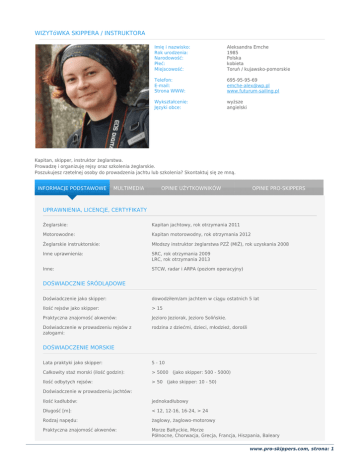 WIZYTóWKA SKIPPERA / INSTRUKTORA Imię i nazwisko: Rok urodzenia: Narodowość: Płeć: Miejscowość: Aleksandra Emche 1985 Polska kobieta Toruń / kujawsko-pomorskie Telefon: E-mail: Strona WWW: 695-95-95-69 [email protected] www.futurum-sailing.pl Wykształcenie: Języki obce: wyższe angielski Kapitan, skipper, instruktor żeglarstwa. Prowadzę i organizuję rejsy oraz szkolenia żeglarskie. Poszukujesz rzetelnej osoby do prowadzenia jachtu lub szkolenia? Skontaktuj się ze mną. INFORMACJE PODSTAWOWE MULTIMEDIA OPINIE UŻYTKOWNIKÓW OPINIE PRO-SKIPPERS UPRAWNIENIA, LICENCJE, CERTYFIKATY Żeglarskie: Kapitan jachtowy, rok otrzymania 2011 Motorowodne: Kapitan motorowodny, rok otrzymania 2012 Żeglarskie instruktorskie: Młodszy instruktor żeglarstwa PZŻ (MIŻ), rok uzyskania 2008 Inne uprawnienia: SRC, rok otrzymania 2009 LRC, rok otrzymania 2013 Inne: STCW, radar i ARPA (poziom operacyjny) DOŚWIADCZNIE ŚRÓDLĄDOWE Doświadczenie jako skipper: dowodziłem/am jachtem w ciągu ostatnich 5 lat Ilość rejsów jako skipper: > 15 Praktyczna znajomość akwenów: Jezioro Jeziorak, Jezioro Solińskie. Doświadczenie w prowadzeniu rejsów z załogami: rodzina z dziećmi, dzieci, młodzież, dorośli DOŚWIADCZENIE MORSKIE Lata praktyki jako skipper: 5 - 10 Całkowity staż morski (ilość godzin): > 5000 (jako skipper: 500 - 5000) Ilość odbytych rejsów: > 50 (jako skipper: 10 - 50) Doświadczenie w prowadzeniu jachtów: Ilość kadłubów: jednokadłubowy Długość [m]: < 12, 12-16, 16-24, > 24 Rodzaj napędu: żaglowy, żaglowo-motorowy Praktyczna znajomość akwenów: Morze Bałtyckie, Morze Północne, Chorwacja, Grecja, Francja, Hiszpania, Baleary www.pro-skippers.com, strona: 1 Doświadczenie w prowadzeniu rejsów z załogami: rodzina z dziećmi, dzieci, młodzież, dorośli DOŚWIADCZNIE SZKOLENIOWE Łączna ilość odbytych szkoleń w charakterze kadry instruktorskiej: 5 - 15 W tym w ostatnich 5 latach: <5 Pełnione funkcje szkoleniowe: instruktor DOŚWIADCZENIE REGATOWE Rodzaj doświadczenia regatowego: turystyczne Rodzaj regat ze względu na akwen: morskie Ilość udziałów w regatach: <5 w tym w ostatnich 5 latach: <5 Pełnione funkcje podczas regat: skipper, załoga Pozostałe informacje: TTSR 2013, Bitwa o Gotland 2015 www.pro-skippers.com, strona: 2