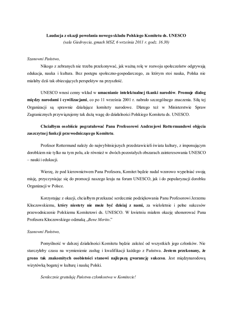 Laudacja z okazji powołania nowego składu Polskiego Komitetu ds. UNESCO (sala Giedroycia, gmach MSZ, 6 września 2011 r. godz. 16.30) Szanowni Państwo, Nikogo z zebranych nie trzeba przekonywać, jak waŜną rolę w rozwoju społeczeństw odgrywają edukacja, nauka i kultura. Bez postępu społeczno-gospodarczego, za którym stoi nauka, Polska nie miałaby dziś tak obiecujących perspektyw na przyszłość. UNESCO wnosi cenny wkład w umacnianie intelektualnej tkanki narodów. Promuje dialog między narodami i cywilizacjami, co po 11 września 2001 r. nabrało szczególnego znaczenia. Siłą tej Organizacji są sprawnie działające komitety narodowe. Dlatego teŜ w Ministerstwie Spraw Zagranicznych przywiązujemy tak duŜą wagę do działalności Polskiego Komitetu ds. UNESCO. Chciałbym osobiście pogratulować Panu Profesorowi Andrzejowi Rottermundowi objęcia zaszczytnej funkcji przewodniczącego Komitetu. Profesor Rottermund naleŜy do najwybitniejszych przedstawicieli świata kultury, z imponującym dorobkiem nie tylko na tym polu, ale równieŜ w dwóch pozostałych obszarach zainteresowania UNESCO – nauki i edukacji. Wierzę, Ŝe pod kierownictwem Pana Profesora, Komitet będzie nadal wzorowo wypełniać swoją misję, przyczyniając się do promocji naszego kraju na forum UNESCO, jak i do popularyzacji dorobku Organizacji w Polsce. Korzystając z okazji, chciałbym przekazać serdecznie podziękowania Panu Profesorowi Jerzemu Kłoczowskiemu, który niestety nie moŜe być dzisiaj z nami, za wieloletnie i pełne sukcesów przewodniczenie Polskiemu Komitetowi ds. UNESCO. W kwietniu miałem okazję uhonorować Pana Profesora Kłoczowskiego odznaką „Bene Merito.” Szanowni Państwo, Pomyślność w dalszej działalności Komitetu będzie zaleŜeć od wszystkich jego członków. Nie starczyłoby czasu na wymienienie zasług i kwalifikacji kaŜdego z Państwa. Jestem przekonany, Ŝe grono tak znakomitych osobistości stanowi najlepszą gwarancję sukcesu. Jest międzynarodową wizytówką bogatej w kulturę i naukę Polski. Serdecznie gratuluję Państwu członkostwa w Komitecie!