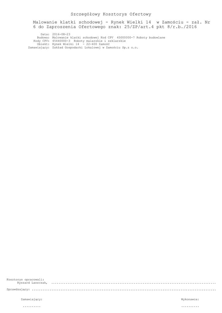 Szczegółowy Kosztorys Ofertowy Malowanie klatki schodowej - Rynek Wielki 14 w Zamościu - zał. Nr 6 do Zaproszenia Ofertowego znak: 25/ZP/art.4 pkt 8/r.b./2016 Data: Budowa: Kody CPV: Obiekt: Zamawiający: Kosztorys opracowali: Ryszard Laszczak, 2016-08-23 Malowanie klatki schodowej Kod CPV 45000000-7 Roboty budowlane 45440000-3 Roboty malarskie i szklarskie Rynek Wielki 14 - 22-400 Zamość Zakład Gospodarki Lokalowej w Zamościu Sp.z o.o. ................................................................................................ Sprawdzający: ........................................................................................................... Zamawiający: Wykonawca: .......... .......... Ofertowy - Malowanie klatek schodowych - Rynek Wielki 14 Zuzia (C) DataComp 1994-2007(lic. 9382) strona nr: 2 Przedmiar Podstawa nakładu, opis pozycji, wyliczenie ilości robót 1 ELEMENT - Remont klatki schodowej 1.2 KNR 401/711/1 (1) Uzupełnienie tynków zwykłych wewnętrznych kat. III, (ściany płaskie, słupy prostokątne, z cegły, pustaków ceramicznych, gazo- i pianobetonu) zaprawa cem-wap, do 1·m2 (w 1 miejscu) (5,95*2,98)*2+(3,25*2,98)*2 = 54,832 54,832 1.3 KNR 401/1202/9 Malowanie farbami klejowymi starych tynków wewnętrznych, zeskrobanie i zmycie starej farby, pomieszczenia o powierzchni podłogi ponad 5·m2 ściany (5,95*2,98)*2+(3,25*2,98)*2+ (8,80*2,98)*2+(3,35*0,80)*2+ (2,37*1,10)*2+(1,36*1,80)+ (3,77*2,42)+(1,60*2,42)+(6,05* 2,42)+(3,80*1,55)+(6,25*2,0)+ (3,50*2,0)+(5,85*5,0)+(3,46* 1,02) = 206,1076 sufity (3,25*5,95)+(8,80*1,53)+(3,35* 1,18)+(2,37*1,50)+(3,80*5,0)+ (6,43*3,50)+(3,77*2,0)+(4,10* 1,10)+(3,80*1,10)+(5,25*1,10)+ (3,50*1,50)+(3,46*3,03) = 119,5533 325,6609 1.4 KNR 17/2608/3 Przygotowanie podłoża pod malowanie gruntowanie preparatem wzmacniającym CT17 1-krotnie 325,66 = 325,66 325,66 1.5 KNR 401/1204/8 Malowanie farbami emulsyjnymi starych tynków, przygotowanie powierzchni z poszpachlowaniem nierówności (sfalowań) powierzchni tynku 325,66 = 325,66 325,66 1.6 KNR 401/1204/1 Malowanie farbami emulsyjnymi starych tynków, 2-krotne, sufity wewnętrzne 119,55 = 119,55 119,55 1.7 KNR 401/1204/2 Malowanie farbami emulsyjnymi starych tynków, 2-krotne, ściany wewnętrzne 206,11 = 206,11 206,11 1.8 KNR 401/1212/2 (1) Malowanie farbą olejną elementów metalowych, powierzchnie pełne, szpachlowane 1-krotnie, 2-krotne - drzwi metalowe (1,95*1,19) = 2,3205 2,3205 1.9 KNR 401/1212/2 (1) Malowanie farbą olejną elementów metalowych, powierzchnie pełne, szpachlowane 1-krotnie, 2-krotne - drzwiczki i szafki drzwiczki, szafki gazowe (0,57*0,77)+(0,57*0,28)+(1,37* 0,42)+(3,50*2,20)+(1,50*1,50) = 11,1239 11,1239 1.10 KNR 401/1212/5 (1) Malowanie farbą olejną elementów metalowych, kraty i balustrady z prętów prostych, 2-krotne - kraty kraty (2,10*1,48)+(2,10*1,26) = 5,754 5,754 1.11 KNR 401/1209/10 (1) Malowanie farbą olejną stolarki uprzednio malowanej, drzwi, ścianki, szafki, 2-krotne, ponad 1,0·m2 drzwi (1,95*1,19)+(2,10*0,90) = 4,2105 4,2105 1.12 KNR 401/1212/28 (1) Malowanie farbą olejną elementów metalowych, rury wodociągowe i gazowe, średnica 50·mm, 2-krotne rury 2,50+38,0+8,0+18,0 = 66,5 66,5 ie klatki schodowej - Rynek Wielki 14 Ilość Krot Jedn. . ~54,832 m2 ~325,661 m2 ~325,660 m2 ~325,660 m2 ~119,550 m2 ~206,110 m2 ~2,321 m2 ~11,124 m2 ~5,754 m2 ~4,211 m2 ~66,500 m w Zamościu - zał. Nr 6 do Zaproszenia Ofertowego znak: 25/ZP/art.4 pkt 8/r.b./2016 Ofertowy - Malowanie klatek schodowych - Rynek Wielki 14 Zuzia (C) DataComp 1994-2007(lic. 9382) strona nr: 3 Podstawa nakładu, opis pozycji, wyliczenie ilości robót Ilość 1.13 KNR 401/1206/4 (1) Malowanie farbami olejnymi starych tynków wewnętrznych, ściany, z 1-krotnym szpachlowaniem, 2-krotne lamperie (4,93+1,80+1,98+1,70+1,20+ 3,10+2,70+1,67+2,64+2,70+1,70+ 4,0+0,85+4,12+1,55+2,40+2,80+ 1,55+4,20+1,58+1,40+2,0+1,80+ 4,30)*1,40 = 82,138 2,06*1,90 = 3,914 86,052 1.14 KNR 401/1212/5 (1) Malowanie farbą olejną elementów metalowych, kraty i balustrady z prętów prostych, 2-krotne balustrady schodowe (5,0+5,0+2,40+5,0+3,90)*1,10 = 23,43 23,43 1.15 KNR 401/1210/10 (1) Lakierowanie powierzchni drewnianych, stolarka drzwiowa, ścianki i szafki, ponad 1,0·m2, 2-krotne - jednostronnie drzwi (2,0*1,10)*7 = 15,4 15,4 1.16 KNR 401/1210/8 (1) Lakierowanie powierzchni drewnianych, stolarka drzwiowa, ścianki i szafki, do 1,0·m2, 2-krotne schody (1,34*0,50*6)+(1,11*0,50*13) = 11,235 spocznik 1,40*1,06 = 1,484 barierka (1,80+2,97)*0,15 = 0,7155 13,4345 Krot Jedn. . ~86,052 m2 ~23,430 m2 ~15,400 m2 ~13,435 m2 Kosztorys Opis pozycji podstawy nakładów wyliczenie ilości robót Jedn. Norma Ilość Cena Wartość R M S 1 ELEMENT - Remont klatki schodowej 1.2 KNR 401/711/1 (1) Uzupełnienie tynków zwykłych wewnętrznych kat. III, (ściany płaskie, słupy prostokątne, z cegły, pustaków ceramicznych, gazo- i pianobetonu) zaprawa cem-wap, do 1·m2 (w 1 miejscu) (5,95*2,98)*2+(3,25*2,98)*2 = 54,832 54,832 ~54,832 m2 Robotnicy grupa I (R= 1,150) r-g 0,54 34,05067 Robotnicy grupa II (R= 1,150) r-g 0,09 5,67511 Tynkarze grupa III (R= 1,150) r-g 0,88 55,48998 Cement portlandzki "25" z dodatkami t 0,0052 0,28513 Piasek do zapraw m3 0,0266 1,45853 Wapno gaszone (ciasto wapienne) m3 0,0048 0,26319 Woda m3 0,0067 0,36737 Materiały inne (Materiały) % 1,5 Betoniarka wolnospadowa elektryczna m-g 0,04 2,19328 Wyciąg jednomasztowy z napędem elektrycznym 0.5·t m-g 0,05 2,7416 1.3 KNR 401/1202/9 Malowanie farbami klejowymi starych tynków wewnętrznych, zeskrobanie i zmycie starej farby, pomieszczenia o powierzchni podłogi ponad 5·m2 ściany (5,95*2,98)*2+(3,25*2,98)*2+(8,80*2,98)* 2+(3,35*0,80)*2+(2,37*1,10)*2+(1,36* 1,80)+(3,77*2,42)+(1,60*2,42)+(6,05* 2,42)+(3,80*1,55)+(6,25*2,0)+(3,50*2,0)+ (5,85*5,0)+(3,46*1,02) = 206,1076 sufity (3,25*5,95)+(8,80*1,53)+(3,35*1,18)+ (2,37*1,50)+(3,80*5,0)+(6,43*3,50)+ (3,77*2,0)+(4,10*1,10)+(3,80*1,10)+ (5,25*1,10)+(3,50*1,50)+(3,46*3,03) = 119,5533 325,6609 