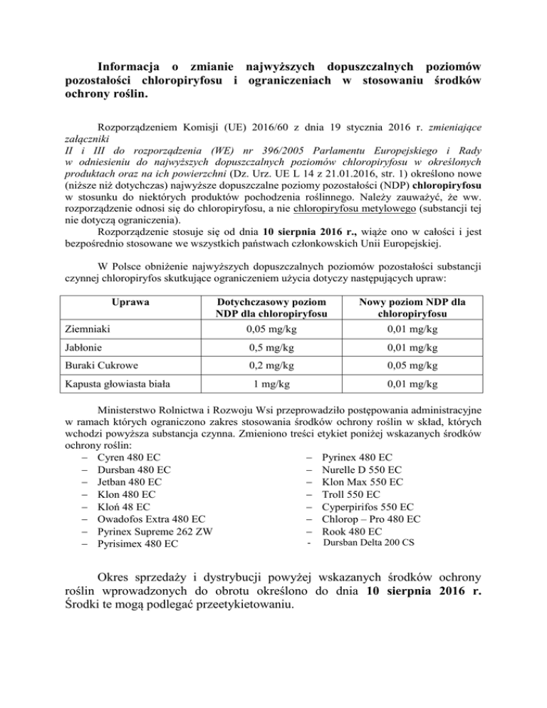 Informacja o zmianie najwyższych dopuszczalnych poziomów pozostałości chloropiryfosu i ograniczeniach w stosowaniu środków ochrony roślin. Rozporządzeniem Komisji (UE) 2016/60 z dnia 19 stycznia 2016 r. zmieniające załączniki II i III do rozporządzenia (WE) nr 396/2005 Parlamentu Europejskiego i Rady w odniesieniu do najwyższych dopuszczalnych poziomów chloropiryfosu w określonych produktach oraz na ich powierzchni (Dz. Urz. UE L 14 z 21.01.2016, str. 1) określono nowe (niższe niż dotychczas) najwyższe dopuszczalne poziomy pozostałości (NDP) chloropiryfosu w stosunku do niektórych produktów pochodzenia roślinnego. Należy zauważyć, że ww. rozporządzenie odnosi się do chloropiryfosu, a nie chloropiryfosu metylowego (substancji tej nie dotyczą ograniczenia). Rozporządzenie stosuje się od dnia 10 sierpnia 2016 r., wiąże ono w całości i jest bezpośrednio stosowane we wszystkich państwach członkowskich Unii Europejskiej. W Polsce obniżenie najwyższych dopuszczalnych poziomów pozostałości substancji czynnej chloropiryfos skutkujące ograniczeniem użycia dotyczy następujących upraw: Uprawa Dotychczasowy poziom NDP dla chloropiryfosu Nowy poziom NDP dla chloropiryfosu Ziemniaki 0,05 mg/kg 0,01 mg/kg Jabłonie 0,5 mg/kg 0,01 mg/kg Buraki Cukrowe 0,2 mg/kg 0,05 mg/kg 1 mg/kg 0,01 mg/kg Kapusta głowiasta biała Ministerstwo Rolnictwa i Rozwoju Wsi przeprowadziło postępowania administracyjne w ramach których ograniczono zakres stosowania środków ochrony roślin w skład, których wchodzi powyższa substancja czynna. Zmieniono treści etykiet poniżej wskazanych środków ochrony roślin: Cyren 480 EC Pyrinex 480 EC Dursban 480 EC Nurelle D 550 EC Jetban 480 EC Klon Max 550 EC Klon 480 EC Troll 550 EC Kloń 48 EC Cyperpirifos 550 EC Owadofos Extra 480 EC Chlorop – Pro 480 EC Pyrinex Supreme 262 ZW Rook 480 EC - Dursban Delta 200 CS Pyrisimex 480 EC Okres sprzedaży i dystrybucji powyżej wskazanych środków ochrony roślin wprowadzonych do obrotu określono do dnia 10 sierpnia 2016 r. Środki te mogą podlegać przeetykietowaniu.