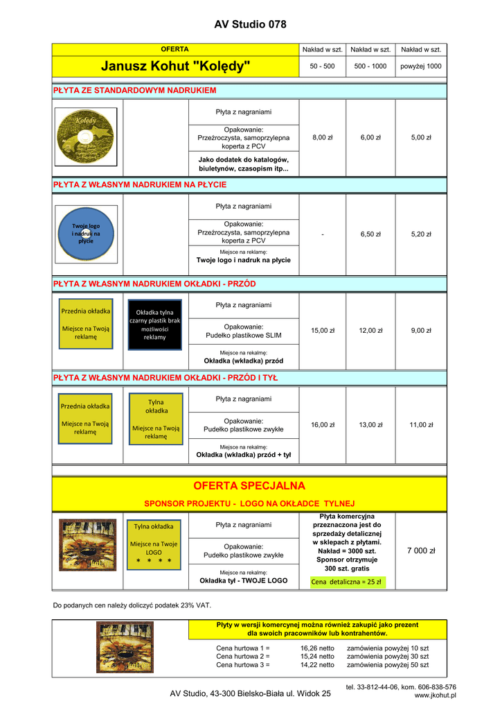 AV Studio 078 OFERTA Nakład w szt. Nakład w szt. Nakład w szt. Janusz Kohut "Kolędy" 50 - 500 500 - 1000 powyżej 1000 8,00 zł 6,00 zł 5,00 zł - 6,50 zł 5,20 zł 15,00 zł 12,00 zł 9,00 zł 16,00 zł 13,00 zł 11,00 zł PŁYTA ZE STANDARDOWYM NADRUKIEM Płyta z nagraniami Opakowanie: Przeźroczysta, samoprzylepna koperta z PCV Jako dodatek do katalogów, biuletynów, czasopism itp... PŁYTA Z WŁASNYM NADRUKIEM NA PŁYCIE Płyta z nagraniami Opakowanie: Przeźroczysta, samoprzylepna koperta z PCV Twoje logo i nadruk na płycie Miejsce na reklamę: Twoje logo i nadruk na płycie PŁYTA Z WŁASNYM NADRUKIEM OKŁADKI - PRZÓD Płyta z nagraniami Przednia okładka Okładka tylna czarny plastik brak Miejsce na Twoją reklamę możliwości reklamy Opakowanie: Pudełko plastikowe SLIM Miejsce na rekalmę: Okładka (wkładka) przód PŁYTA Z WŁASNYM NADRUKIEM OKŁADKI - PRZÓD I TYŁ Płyta z nagraniami Przednia okładka Tylna okładka Miejsce na Twoją reklamę 2 OKŁADKI Miejsce na Twoją reklamę Opakowanie: Pudełko plastikowe zwykłe Miejsce na rekalmę: Okładka (wkładka) przód + tył OFERTA SPECJALNA SPONSOR PROJEKTU - LOGO NA OKŁADCE TYLNEJ Tylna okładka Płyta z nagraniami Miejsce na Twoje LOGO Opakowanie: Pudełko plastikowe zwykłe * * * * Miejsce na rekalmę: Okładka tył - TWOJE LOGO Płyta komercyjna przeznaczona jest do sprzedaży detalicznej w sklepach z płytami. Nakład = 3000 szt. Sponsor otrzymuje 300 szt. gratis 7 000 zł Cena detaliczna = 25 zł Do podanych cen należy doliczyć podatek 23% VAT. Płyty w wersji komercynej można również zakupić jako prezent dla swoich pracowników lub kontrahentów. Cena hurtowa 1 = Cena hurtowa 2 = Cena hurtowa 3 = 16,26 netto 15,24 netto 14,22 netto AV Studio, 43-300 Bielsko-Biała ul. Widok 25 zamówienia powyżej 10 szt zamówienia powyżej 30 szt zamówienia powyżej 50 szt tel. 33-812-44-06, kom. 606-838-576 www.jkohut.pl