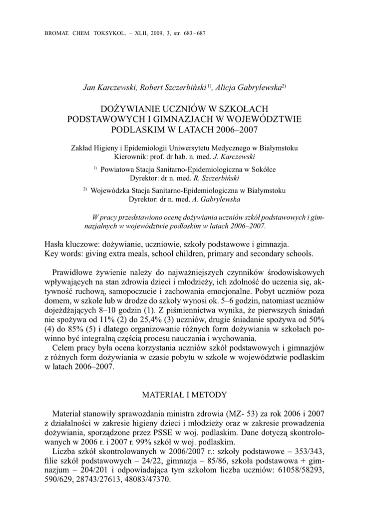 BROMAT. CHEM. TOKSYKOL. – XLII, 2009, 3, str. 683 – 687 Jan Karczewski, Robert Szczerbiński 1), Alicja Gabrylewska2) DOŻYWIANIE UCZNIÓW W SZKOŁACH PODSTAWOWYCH I GIMNAZJACH W WOJEWÓDZTWIE PODLASKIM W LATACH 2006–2007 Zakład Higieny i Epidemiologii Uniwersytetu Medycznego w Białymstoku Kierownik: prof. dr hab. n. med. J. Karczewski 1) 2) Powiatowa Stacja Sanitarno-Epidemiologiczna w Sokółce Dyrektor: dr n. med. R. Szczerbiński Wojewódzka Stacja Sanitarno-Epidemiologiczna w Białymstoku Dyrektor: dr n. med. A. Gabrylewska W pracy przedstawiono ocenę dożywiania uczniów szkół podstawowych i gimnazjalnych w województwie podlaskim w latach 2006–2007. Hasła kluczowe: dożywianie, uczniowie, szkoły podstawowe i gimnazja. Key words: giving extra meals, school children, primary and secondary schools. Prawidłowe żywienie należy do najważniejszych czynników środowiskowych wpływających na stan zdrowia dzieci i młodzieży, ich zdolność do uczenia się, aktywność ruchową, samopoczucie i zachowania emocjonalne. Pobyt uczniów poza domem, w szkole lub w drodze do szkoły wynosi ok. 5–6 godzin, natomiast uczniów dojeżdżających 8–10 godzin (1). Z piśmiennictwa wynika, że pierwszych śniadań nie spożywa od 11% (2) do 25,4% (3) uczniów, drugie śniadanie spożywa od 50% (4) do 85% (5) i dlatego organizowanie różnych form dożywiania w szkołach powinno być integralną częścią procesu nauczania i wychowania. Celem pracy była ocena korzystania uczniów szkół podstawowych i gimnazjów z różnych form dożywiania w czasie pobytu w szkole w województwie podlaskim w latach 2006–2007. MATERIAŁ I METODY Materiał stanowiły sprawozdania ministra zdrowia (MZ- 53) za rok 2006 i 2007 z działalności w zakresie higieny dzieci i młodzieży oraz w zakresie prowadzenia dożywiania, sporządzone przez PSSE w woj. podlaskim. Dane dotyczą skontrolowanych w 2006 r. i 2007 r. 99% szkół w woj. podlaskim. Liczba szkół skontrolowanych w 2006/2007 r.: szkoły podstawowe – 353/343, filie szkół podstawowych – 24/22, gimnazja – 85/86, szkoła podstawowa + gimnazjum – 204/201 i odpowiadająca tym szkołom liczba uczniów: 61058/58293, 590/629, 28743/27613, 48083/47370. 684 Nr 3 J. Karczewski i inni Do analizy statystycznej danych wykorzystano nieparametryczny test Chi2 przyjmując poziom istotności p ≤ 0,05. WYNIKI I ICH OMÓWIENIE Ciepłe posiłki były wydawane jako posiłki pełne i posiłki jednodaniowe. Pełne posiłki wydawało 36,5% szkół w 2006 r. i 39,1% w 2007 r., a posiłki jednodaniowe 11,26% w 2006 r. i 11,96% w 2007 r. Ta b e l a I. Wydawanie ciepłych posiłków w szkołach podstawowych i gimnazjalnych w województwie podlaskim w latach 2006–2007 Ta b l e I. Giving extra meals in primary and secondary schools in Podlaskie province in 2006-2007 Liczba/odsetek szkół wydających ciepłe posiłki 2006 r. 2007 r. 2006 r. 2007 r. Posiłki jednodaniowe 2007 r. Posiłki pełne 2006 r. Posiłki jednodaniowe 2007 r. Posiłki pełne 2006 r. Typ szkoły Liczba/odsetek uczniów korzystających z ciepłych posiłków (106) 30,0 (110) 32,1 (46) 13,0 (52) 15,2 (17385) 28,5A (17131) 29,4A (3493) 5,7 (3195) 5,5 Filie szkół podstawowych (2) 8,3 (2) 10,0 (1) 4,2 (1) 4,5 (42) 7,1B (72) 11,4B (28) 4,7 (26) 4,1 Gimnazja (58) 68,2 (60) 69,8 (8) 9,4 (7) 8,1 (5877) 20,4C (6429) 23,3C (812) 2,8 (854) 3,1 Szkoły podstawowe i gimnazja funkcjonujące w zespołach szkół (77) 37,7 (83) 41,3 (20) 9,8 (18) 8,9 (12938) 26,9D (14458) 30,5D (4394) 9,1 (4506) 9,5 Ogółem (243) 36,5 (255) 39,1 (75) 11,3 (78) 12,0 (36242) 26,2E (38090) 28,4E (8727) 6,3 (8581) 6,4 Szkoły podstawowe A,B,C,D,E – różnice istotne statystycznie (p ≤ 0,05) Wg typu szkoły najwyższy odsetek szkół wydających posiłki pełne zarówno w 2006 r., jak i 2007 r. (68,23% i 69,77%) to gimnazja. Natomiast najwyższy odsetek szkół wydających posiłki jednodaniowe stwierdzono zarówno w roku 2006, jak i 2007 (13,03% i 15,16%) w szkołach podstawowych. Stwierdzono, że odsetek szkół wydających posiłki pełne był wyższy w 2007 r. w porównaniu z 2006 r. Również odsetek poszczególnych typów szkół, za wyjątkiem gimnazjów oferujących posiłki jednodaniowe, był nieznacznie wyższy w 2007 r. w porównaniu do 2006 r. Ogółem z posiłków pełnych korzystało 26,17% uczniów w 2006 r. i 28,44% uczniów w 2007 r. (różnice istotne statystycznie). Wg typu szkoły najwyższy odsetek uczniów w 2006 r. korzystających z pełnych posiłków był w szkołach podstawowych, zaś w 2007 r. w szkołach podstawowych i gimnazjach funkcjonujących w zespołach szkół, przy czym w poszczególnych typach szkół odsetek osób korzystających z posiłków pełnych był w 2007 r. istotnie wyższy niż w 2006 r. Z posiłków Nr 3 Dożywianie uczniów w województwie podlaskim w latach 2006–2007 685 jednodaniowych korzystało w 2006 r. 6,3% uczniów, a w 2007 r. 6,4% uczniów. Według typu szkoły, zarówno w 2006 r., jak i 2007 r., najwyższy odsetek uczniów korzystających z posiłków jednodaniowych był w szkołach podstawowych i gimnazjach funkcjonujących w zespołach szkół (9,1% i 9,5%). Natomiast odsetek uczniów szkół podstawowych i fili szkół podstawowych korzystających z posiłków jednodaniowych nieznacznie zmalał w 2007 r. w porównaniu z 2006 r. Wyniki badań własnych były wyższe od wyników badań uzyskanych przez Gajewską i Ignar-Golimowską (6) oraz zbliżone do wyników własnych z 2003 r. (7). Z ofertą organizowania II śniadań wystąpiło w 2006 r. 23,9% szkół, zaś w 2007 r. 23,6%. Ta b e l a II. Organizowanie II śniadań i podawanie napojów w szkołach podstawowych i gimnazjach w województwie podlaskim w latach 2006- 2007 Ta b l e II. Organizing lunches and providing school children with drinks in primary and secondary schools in Podlaskie province in 2006-2007 Organizowanie II śniadań szkolnych Podawanie napoju 2007 r. 2006 r. 2007 r. 2006 r. 200
