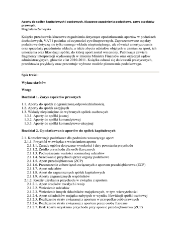 Aporty do spółek kapitałowych i osobowych. Kluczowe zagadnienia podatkowe, zarys aspektów prawnych. Magdalena Zamoyska Książka przedstawia kluczowe zagadnienia dotyczące opodatkowania aportów w podatkach dochodowych, VAT i podatku od czynności cywilnoprawnych. Zaprezentowane aspekty podatkowe dotyczą nie tylko samego wkładu niepieniężnego, ale również amortyzowania oraz sprzedaży przedmiotu wkładu, a także zbycia udziałów objętych w zamian za aport, ich umorzenia oraz likwidacji spółki, do której aport został wniesiony. Publikacja zawiera fragmenty interpretacji wydawanych w imieniu Ministra Finansów oraz orzeczeń sądów administracyjnych, głównie z lat 2010-2011. Książka odnosi się do kwestii praktycznych, przedstawia przykłady oraz prezentuje wybrane modele planowania podatkowego. Spis treści: Wykaz skrótów Wstęp Rozdział 1. Zarys aspektów prawnych 1.1. Aporty do spółek z ograniczoną odpowiedzialnością 1.2. Aporty do spółek akcyjnych 1.3. Wkłady niepieniężne do wybranych spółek osobowych 1.3.1. Aporty do spółki jawnej 1.3.2. Aporty do spółki komandytowej 1.3.3. Aporty do spółki komandytowo-akcyjnej Rozdział 2. Opodatkowanie aportów do spółek kapitałowych 2.1. Konsekwencje podatkowe dla podmiotu wnoszącego aport 2.1.1. Przychód w związku z wniesieniem aportu 2.1.1.1. Zasady ogólne dotyczące wysokości i daty powstania przychodu 2.1.1.2. Źródło przychodu dla osób fizycznych 2.1.1.3. Podwyższenie wartości nominalnej udziałów 2.1.1.4. Szacowanie przychodu przez organy podatkowe 2.1.1.5. Aport przedsiębiorstwa (ZCP) 2.1.1.6. Przenoszenie zobowiązań związanych z aportem przedsiębiorstwa (ZCP) 2.1.1.7. Aport udziałów 2.1.1.8. Aport do zagranicznych spółek kapitałowych 2.1.1.9. Aporty zagranicznych wspólników 2.1.2. Koszty uzyskania przychodu w związku z aportem 2.1.2.1. Aport środków trwałych i wnip 2.1.2.2. Wniesienie udziałów 2.1.2.3. Wniesienie innych składników majątkowych, w tym wierzytelności 2.1.2.4. Aport składników majątku nabytych w wyniku likwidacji spółki osobowej 2.1.2.5. Rozliczenie straty związanej z aportem w przypadku osób prawnych 2.1.2.6. Rozliczenie straty związanej z aportem przez osoby fizyczne 2.1.2.7. Brak kosztu uzyskania przychodu przy aporcie przedsiębiorstwa (ZCP) 2.1.2.8. Zaliczenie do kosztu uzyskania przychodu pozostałych wydatków związanych z aportem 2.1.3. Przychody i koszty podatkowe w dacie zbycia udziałów objętych w zamian za aport, ich umorzenia albo likwidacji spółki 2.1.3.1. Przychód przy odpłatnym zbyciu udziałów objętych w zamian za aport 2.1.3.2. Koszty podatkowe przy odpłatnym zbyciu udziałów objętych w zamian za aport w innej postaci niż przedsiębiorstwo (ZCP) 2.1.3.3. Koszty podatkowe przy odpłatnym zbyciu udziałów objętych w wyniku przekształcenia spółki osobowej w kapitałową 2.1.3.4. Koszty podatkowe przy odpłatnym zbyciu udziałów objętych w zamian za przedsiębiorstwo (ZCP) 2.1.3.5. Koszty podatkowe przy odpłatnym zbyciu udziałów objętych za inne udziały 2.1.3.6. Zbycie udziałów objętych w zamian za aport przez podmiot zagraniczny 2.1.3.7. Zbycie udziałów objętych w zamian za aport przez polskiego rezydenta w zagranicznej spółce 2.1.3.8. Umorzenie udziałów objętych w zamian za aport 2.1.3.9. Likwidacja spółki kapitałowej 2.1.4. Podatek VAT 2.1.4.1. Kiedy podmiot wnoszący aport działa jako podatnik VAT 2.1.4.2. Kwalifikacja aportów w podatku VAT 2.1.4.3. Podstawa opodatkowania podatkiem VAT 2.1.4.4. Data powstania obowiązku podatkowego 2.1.4.5. Aport wierzytelności 2.1.4.6. Czy wartość aportu powinna uwzględniać podatek VAT, czy też podatek VAT powinien być rozliczony gotówką? 2.1.4.7. Dokumentowanie aportu z punktu widzenia przepisów VAT 2.1.4.8. Wyłączenie z VAT aportów przedsiębiorstwa (ZCP) 2.1.4.9. Konsekwencje w VAT wniesienia aportu przed 1 grudnia 2008 r. 2.2. Konsekwencje podatkowe dla spółki otrzymującej aport 2.2.1. Podatek dochodowy 2.2.1.1. Brak opodatkowania wartości otrzymanego aportu 2.2.1.2. Podstawa amortyzacji wniesionych aportem środków trwałych i wnip oraz koszt podatkowy przy ich odpłatnym zbyciu 2.2.1.3. Koszt podatkowy w przypadku odpłatnego zbycia składników majątkowych (innych niż środki trwałe i wnip) otrzymanych aportem 2.2.1.4. Amortyzacja środków trwałych i wnip wniesionych aportem w ramach przedsiębiorstwa (ZCP) do 31 grudnia 2006 r. 2.2.1.5. Kontynuowanie amortyzacji środków trwałych i wnip wniesionych aportem w ramach przedsiębiorstwa (ZCP) od 1 stycznia 2007 r. 2.2.1.6. Amortyzacja środków trwałych i wnip wniesionych aportem do 31 grudnia 2010 r. w ramach przedsiębiorstwa (ZCP) 2.2.1.6.1. Wartość firmy 2.2.1.6.2. Przykłady planowania podatkowego 2.2.1.6.3. Odpisy amortyzacyjne od wartości środków trwałych i wnip wniesionych w ramach przedsiębiorstwa (ZCP) przekazanej na kapitał zapasowy 2.2.1.7. Zasady kontynuacji amortyzacji środków trwałych i wnip od 1 stycznia 2011 r. 2.2.1.8. Koszt podatkowy przy odpłatnym zbyciu środków trwałych i wnip wniesionych aportem w ramach przedsiębiorstwa lub zcp do 31 grudnia 2010 r. 2.2.1.9. Koszt podatkowy przy zbyciu składników majątkowych (innych niż środki trwałe i wnip) wniesionych w ramach przedsiębiorstwa (ZCP) do 31 grudnia 2010 r. 2.2.1.10. Koszt podatkowy przy odpłatnym zbyciu składników majątkowych wniesionych w ramach przedsiębiorstwa lub zcp od 1 stycznia 2011 r. 2.2.1.11. Omówienie przepisów przejściowych 2.2.1.12. Pozostałe wybrane aspekty związane z aportem przedsiębiorstwa lub zcp 2.2.1.12.1. Otrzymanie należności i rozliczanie związanych z nimi różnic kursowych 2.2.1.12.2. Zapłata zobowiązań, w tym odsetek i rozliczanie różnic kursowych od zobowiązań 2.2.1.12.3. Kwalifikacja wydatków poniesionych w związku z podwyższeniem kapitału 2.2.2. Podatek VAT 2.2.2.1. Odliczenie i zwrot podatku VAT wykazanego na fakturze po