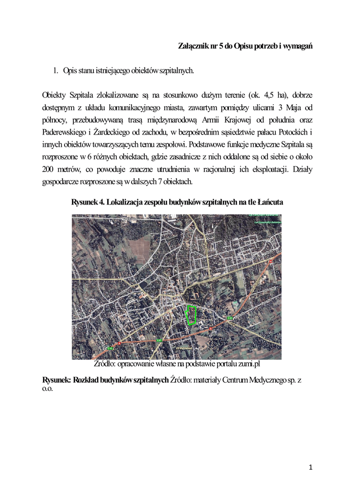 Załącznik nr 5 do Opisu potrzeb i wymagań 1. Opis stanu istniejącego obiektów szpitalnych. Obiekty Szpitala zlokalizowane są na stosunkowo dużym terenie (ok. 4,5 ha), dobrze dostępnym z układu komunikacyjnego miasta, zawartym pomiędzy ulicami 3 Maja od północy, przebudowywaną trasą międzynarodową Armii Krajowej od południa oraz Paderewskiego i Żardeckiego od zachodu, w bezpośrednim sąsiedztwie pałacu Potockich i innych obiektów towarzyszących temu zespołowi. Podstawowe funkcje medyczne Szpitala są rozproszone w 6 różnych obiektach, gdzie zasadnicze z nich oddalone są od siebie o około 200 metrów, co powoduje znaczne utrudnienia w racjonalnej ich eksploatacji. Działy gospodarcze rozproszone są w dalszych 7 obiektach. Rysunek 4. Lokalizacja zespołu budynków szpitalnych na tle Łańcuta Źródło: opracowanie własne na podstawie portalu zumi.pl Rysunek: Rozkład budynków szpitalnych Źródło: materiały Centrum Medycznego sp. z o.o. 1 Nr budynku 1 2 2a 3 4 5 6 7 8 8a 8b 9 10 11 12 13 13a 14 Tabela: Przeznaczenie budynków Szpitala Oddział / dział Oddziały: chorób wewnętrznych, kardiologiczny, medycyny paliatywnej Oddziały: chirurgiczny (I piętro) i urazowo-ortopedyczny (parter) Oddziały: ginekologiczno (parter) - położniczy (I piętro), neonatologiczny (I piętro) Oddziały: pediatryczny, chorób zakaźnych Zakład Pielęgnacyjno-Opiekuńczy Dział diagnostyki laboratoryjnej Poradnie specjalistyczne Centralna sterylizatornia Kuchnia Tlenownia Piwnica Oddział psychiatryczny dla dzieci i młodzieży Zespół transportu sanitarnego Magazyn główny Budynek administracji Gabinety poradni specjalistycznych i podstawowej opieki zdrowotnej Oddziały: neurologiczny, udarowy (parter), rehabilitacji (I piętro), Oddział opieki doraźnej (parter) Magazyn Źródło: materiały Centrum Medycznego sp. z o.o. Szpital św. Michała Archanioła w Łańcucie liczy obecnie 263 łóżka + 11 łóżeczek noworodkowych . Świadczenia udzielane są w następujących oddziałach: Oddział Chirurgiczny + OIT, Oddział Urazowo-Ortopedyczny, Oddział Chorób Wewnętrznych, Oddział Kardiologiczny, Oddział Neurologiczny, Oddział Medycyny Paliatywnej, 2 Oddział Udarowy Oddział rehabilitacji neurologicznej Oddział Chorób Zakaźnych z pododdziałem hepatologicznym, Oddział Pediatryczny, Oddział Ginekologiczno-Położniczy, Oddział Neonatologiczny, Oddział Rehabilitacyjny, Oddział Dzienny Rehabilitacji, Oddział Dzienny Psychiatrii dla Dzieci i Młodzieży, Oddział Psychiatrii dla Dzieci i Młodzieży. Oddział Geriatryczny W zakres działalności Centrum Medycznego wchodzi także zarządzanie: Zakładami Opieki Długoterminowej, liczącymi łącznie łóżka, w tym: Zakładem Pielęgnacyjno-Opiekuńczym Zakładem Opiekuńczo-Leczniczym w Handzlówce Działem specjalistyki ambulatoryjnej, w tym: Poradnią chirurgii ogólnej Poradnią chirurgii urazowo– ortopedycznej Poradnią chorób sutka Poradnią chorób zakaźnych Poradnią dermatologiczną Poradnią diabetologiczną Poradnią endokrynologiczną Poradnią geriatryczną Poradnią ginekologiczno– położniczą Poradnią gruźlicy i chorób płuc Poradnią kardiologiczną Poradnią leczenia uzależnień Poradnią logopedyczną Poradnią neonatologiczną 3 Poradnią neurologiczną Poradnią okulistyczną Poradnią otolaryngologiczną Poradnią preluksacyjną Poradnią rehabilitacyjną Poradnią reumatologiczną Poradnią urologiczną Poradnią wad postawy Poradnią zdrowia psychicznego Poradnią zdrowia psychicznego dla dzieci, młodzieży i ich rodzin Poradnią gastroenterologiczną Poradnią hepatologiczną A ponadto: Hospicjum Domowym Pielęgniarską Opieką Długoterminową Pracownią fizykoterapii w Łańcucie Pracownią fizjoterapii w Krzemienicy Szkołą Rodzenia. Oddziałem Opieki Doraźnej Działem Podstawowej Opieki Zdrowotnej: Gabinety Lekarzy POZ Gabinety Pielęgniarek i Położnych Rodzinnych Gabinety Medycyny Szkolnej Działami diagnostyki: Laboratoryjnej Obrazowej: ( RTG, USG i Mammografia) Endoskopowej Kardiologicznej Działy pomocnicze Sterylizacja 4 Ośrodkiem Nowoczesnej Terapii Apteką szpitalną (wewnętrzną) Kuchnią Pralnią Magazynami Odprawą zwłok – patomorfologia Innymi usługami Na terenie Szpitala funkcjonuje obecnie także sklepik ogólnospożywczy w budynku nr 13a oraz sklep spożywczy (obok pawilonu nr 3). W ramach współpracy z firmą zewnętrzną zapewniającą żywienie istnieje możliwość skorzystania z małej gastronomii i stołówki pracowniczej. W budynku nr 1 zlokalizowana jest kaplica szpitalna. W budynku „starej przychodni” znajduje się świetlica na ok. 70 osób. Część istniejących obiektów Szpitala, w szczególności budynki 2 i 2a, nie spełnia norm zawartych w formie rozporządzenia Ministra Zdrowia z dnia 10 listopada w sprawie wymagań, jakimi powinny odpowiadać pod względem fachowym i sanitarnym pomieszczenia i urządzenia zakładów opieki zdrowotnej1. Stan bieżący infrastruktury wymaga poniesienia wysokich nakładów modernizacyjnych, natomiast dla niektórych budynków (m.in. budynek 2 i 2a) oraz mieszczących się w nich oddziałów, modernizacja obiektów i ich dostosowanie do parametrów objętych rozporządzeniem Ministra jest niemożliwa. Przyczyną tego stanu rzeczy jest fakt, że zespół budynków szpitalnych tworzy kompleks infrastrukturalny obiektów zabytkowych, o powierzchniach i rozwiązaniach komunikacyjnych (np. brak wind i niemożność ich zainstalowania) przestarzałych względem potrzeb budynków świadczących usługi medyczne. Realizacja nowego obiektu jest zatem rozwiązaniem koniecznym do wdrożenia. 2. Charakterystyka oddziałów objętych częścią inwestycyjną Przedsięwzięcia A. Oddział chirurgiczny (budynek nr 2) Oddział chirurgiczny (20 łóżek) wykonuje szeroki profil zabiegów operacyjnych z różnych dziedzin medycyny, stosując się do obowiązujących obecnie trendów nakazujących dążenie do mi