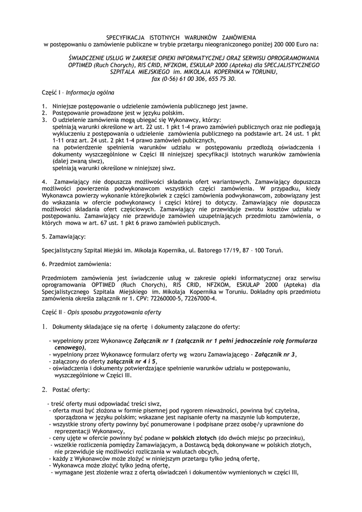 SPECYFIKACJA ISTOTNYCH WARUNKÓW ZAMÓWIENIA w postępowaniu o zamówienie publiczne w trybie przetargu nieograniczonego poniżej 200 000 Euro na: ŚWIADCZENIE USŁUG W ZAKRESIE OPIEKI INFORMATYCZNEJ ORAZ SERWISU OPROGRAMOWANIA OPTIMED (Ruch Chorych), RIS CRID, NFZKOM, ESKULAP 2000 (Apteka) dla SPECJALISTYCZNEGO SZPITALA MIEJSKIEGO im. MIKOŁAJA KOPERNIKA w TORUNIU, fax (0-56) 61 00 306, 655 75 30. Część I – Informacja ogólna 1. Niniejsze postępowanie o udzielenie zamówienia publicznego jest jawne. 2. Postępowanie prowadzone jest w języku polskim. 3. O udzielenie zamówienia mogą ubiegać się Wykonawcy, którzy: spełniają warunki określone w art. 22 ust. 1 pkt 1-4 prawo zamówień publicznych oraz nie podlegają wykluczeniu z postępowania o udzielenie zamówienia publicznego na podstawie art. 24 ust. 1 pkt 1-11 oraz art. 24 ust. 2 pkt 1-4 prawo zamówień publicznych, na potwierdzenie spełnienia warunków udziału w postępowaniu przedłożą oświadczenia i dokumenty wyszczególnione w Części III niniejszej specyfikacji istotnych warunków zamówienia (dalej zwaną siwz), spełniają warunki określone w niniejszej siwz. 4. Zamawiający nie dopuszcza możliwości składania ofert wariantowych. Zamawiający dopuszcza możliwości powierzenia podwykonawcom wszystkich części zamówienia. W przypadku, kiedy Wykonawca powierzy wykonanie którejkolwiek z części zamówienia podwykonawcom, zobowiązany jest do wskazania w ofercie podwykonawcy i części której to dotyczy. Zamawiający nie dopuszcza możliwości składania ofert częściowych. Zamawiający nie przewiduje zwrotu kosztów udziału w postępowaniu. Zamawiający nie przewiduje zamówień uzupełniających przedmiotu zamówienia, o których mowa w art. 67 ust. 1 pkt 6 prawo zamówień publicznych. 5. Zamawiający: Specjalistyczny Szpital Miejski im. Mikołaja Kopernika, ul. Batorego 17/19, 87 – 100 Toruń. 6. Przedmiot zamówienia: Przedmiotem zamówienia jest świadczenie usług w zakresie opieki informatycznej oraz serwisu oprogramowania OPTIMED (Ruch Chorych), RIS CRID, NFZKOM, ESKULAP 2000 (Apteka) dla Specjalistycznego Szpitala Miejskiego im. Mikołaja Kopernika w Toruniu. Dokładny opis przedmiotu zamówienia określa załącznik nr 1. CPV: 72260000-5, 72267000-4. Część II – Opis sposobu przygotowania oferty 1. Dokumenty składające się na ofertę i dokumenty załączone do oferty: - wypełniony przez Wykonawcę Załącznik nr 1 (załącznik nr 1 pełni jednocześnie rolę formularza cenowego), - wypełniony przez Wykonawcę formularz oferty wg wzoru Zamawiającego - Załącznik nr 3, - załączony do oferty załącznik nr 4 i 5, - oświadczenia i dokumenty potwierdzające spełnienie warunków udziału w postępowaniu, wyszczególnione w Części III. 2. Postać oferty: - treść oferty musi odpowiadać treści siwz, - oferta musi być złożona w formie pisemnej pod rygorem nieważności, powinna być czytelna, sporządzona w języku polskim; wskazane jest napisanie oferty na maszynie lub komputerze, - wszystkie strony oferty powinny być ponumerowane i podpisane przez osobę/y uprawnione do reprezentacji Wykonawcy, - ceny ujęte w ofercie powinny być podane w polskich złotych (do dwóch miejsc po przecinku), - wszelkie rozliczenia pomiędzy Zamawiającym, a Dostawcą będą dokonywane w polskich złotych, nie przewiduje się możliwości rozliczania w walutach obcych, - każdy z Wykonawców może złożyć w niniejszym przetargu tylko jedną ofertę, - Wykonawca może złożyć tylko jedną ofertę, - wymagane jest złożenie wraz z ofertą oświadczeń i dokumentów wymienionych w części III, - wymagane jest przedłożenie: wypełnionego formularza oferty wg wzoru – załącznik nr 3 oraz wypełnionego przez Wykonawcę załącznika nr 1, - brak kompletu wymaganych oświadczeń i dokumentów potwierdzających spełnienie udziału w postępowaniu spowoduje wykluczenie Wykonawcy, - brak wypełnionych załączników określonych w siwz, sporządzonego formularza ofertowego i cenowego spowoduje odrzucenie oferty, - Wykonawca może nie później niż w terminie składania ofert zastrzec informacje, które stanowią tajemnicę przedsiębiorstwa w rozumieniu ustawy o zwalczaniu nieuczciwej konkurencji oprócz informacji, o których mowa w art. 86 ust.4 prawo zamówień publicznych, - W przypadku przedstawienia przez Wykonawcę informacji, które stanowią tajemnicę przedsiębiorstwa w rozumieniu ustawy o zwalczaniu nieuczciwej konkurencji, powinien wyodrębnić z oferty dokumenty zawierające te informacje i je dokładnie oznaczyć: „dokumenty tajne”, - zastrzeżenie informacji, które nie są tajemnicą przedsiębiorstwa w rozumieniu ustawy o zwalczaniu nieuczciwej konkurencji skutkować będzie wyłączeniem zakazu ujawnienia informacji. 3. Opakowanie i oznakowanie ofert : - ofertę należy składać w nieprzejrzystej i zamkniętej kopercie, - na kopercie powinny znajdować się dane Wykonawcy: nazwa, adres, ulica, miejscowość, - koperta powinna być zaadresowana do Zamawiającego, na adres: Specjalistyczny Szpital Miejski im. Mikołaja Kopernika, ul. Batorego 17/19, 87 – 100 Toruń – pok. nr 030 – kancelaria szpitala oraz powinna posiadać następujące oznaczenie: Opieka informatyczna oraz serwis oprogramowania Optimed, RIS CRID, NFZKOM. Eskulap – przetarg, nr sprawy SSM.DZP.200.08.2013 - Wykonawca ponosi pełną odpowiedzialność za właściwe oznakowanie i dostarczenie koperty z ofertą. Część III – Oświadczenia i dokumenty potwierdzające spełnienie warunków udziału w postępowaniu, załączone do oferty. 1. 2. a) b) c) d) e) f) Wykonawca załącza do oferty oświadczenie, że spełnia warunki określone w art. 22 ust.1 pkt 1-4 prawo zamówień publicznych – załącznik nr 4. W celu wykazania braku podstaw do wykluczenia z postępowania o udzielenie zamówienia Wykonawcy w okolicznościach, o których mowa w art. 24 ustawy prawo zamówień publicznych załącza