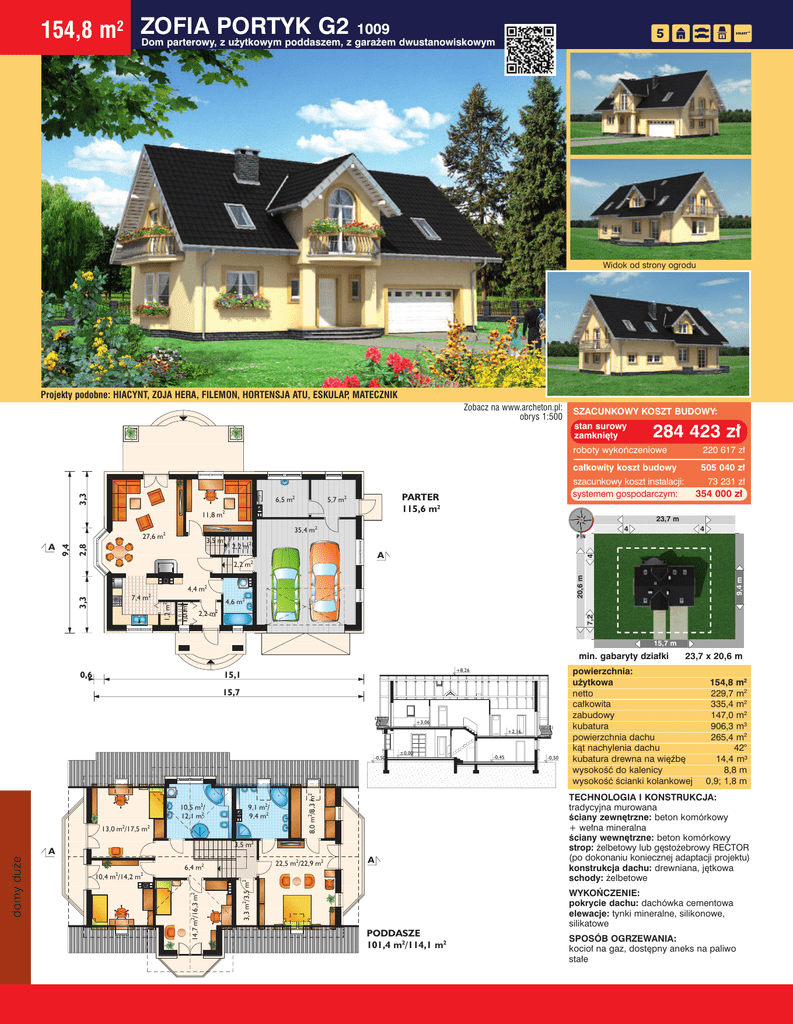 PORTYK G2 1009 154,8 m2 ZOFIA Dom parterowy, z użytkowym poddaszem, z garażem dwustanowiskowym Widok od strony ogrodu Projekty podobne: HIACYNT, ZOJA HERA, FILEMON, HORTENSJA ATU, ESKULAP, MATECZNIK 3,3 Zobacz na www.archeton.pl: obrys 1:500 2 6,5 m 5,7 m 11,8 m2 2,2 m2 A 73 231 zł 354 000 zł 23,7 m 4 9,4 m 20,6 m 4,6 m2 2,2 m2 7,2 1,0 m2 4,4 m2 1,2 m2 3,3 505 040 zł 4 2,2 m2 7,4 m2 220 617 zł całkowity koszt budowy 4 9,4 2,8 3,5 m2 284 423 zł roboty wykończeniowe 35,4 m2 27,6 m2 A stan surowy zamknięty szacunkowy koszt instalacji: systemem gospodarczym: PARTER 115,6 m2 2 SZACUNKOWY KOSZT BUDOWY: 15,7 m min. gabaryty działki 0,6 +8,26 15,1 15,7 +3,06 +2,16 10,5 m2/ 12,1 m2 9,1 m2/ 9,4 m2 3,5 m2 A 22,5 m2/22,9 m2 6,4 m2 A 3,3 m2/3,5 m2 10,4 m2/14,2 m2 14,7 m2/16,3 m2 domy duże 13,0 m2/17,5 m2 ±0,00 8,0 m2/8,3 m2 -0,50 PODDASZE 101,4 m2/114,1 m2 -0,45 -0,50 23,7 x 20,6 m powierzchnia: użytkowa netto całkowita zabudowy kubatura powierzchnia dachu kąt nachylenia dachu kubatura drewna na więźbę wysokość do kalenicy wysokość ścianki kolankowej 154,8 m2 229,7 m2 335,4 m2 147,0 m2 906,3 m3 265,4 m2 42° 14,4 m3 8,8 m 0,9; 1,8 m TECHNOLOGIA I KONSTRUKCJA: tradycyjna murowana ściany zewnętrzne: beton komórkowy + wełna mineralna ściany wewnętrzne: beton komórkowy strop: żelbetowy lub gęstożebrowy RECTOR (po dokonaniu koniecznej adaptacji projektu) konstrukcja dachu: drewniana, jętkowa schody: żelbetowe WYKOŃCZENIE: pokrycie dachu: dachówka cementowa elewacje: tynki mineralne, silikonowe, silikatowe SPOSÓB OGRZEWANIA: kocioł na gaz, dostępny aneks na paliwo stałe