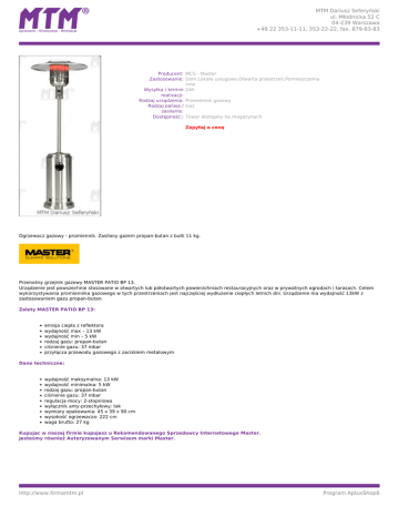 MTM Dariusz Seferyński ul. Młodnicka 52 C 04-239 Warszawa +48 22 353-11-11, 353-22-22, fax. 879-83-83 Producent: MCS - Master Zastosowanie: Dom,Lokale usługowe,Otwarta przestrzeń,Pomieszczenia inne Wysyłka / termin 24h realizacji: Rodzaj urządzenia: Promiennik gazowy Rodzaj paliwa / Gaz zasilanie: Dostępność:: Towar dostępny na magazynach Zapytaj o cenę Ogrzewacz gazowy - promiennik. Zasilany gazem propan-butan z butli 11 kg. Przenośny grzejnik gazowy MASTER PATIO BP 13. Urządzenie jest powszechnie stosowane w otwartych lub półotwartych powierzchniach restauracyjnych oraz w prywatnych ogrodach i tarasach. Celem wykorzystywania promiennika gazowego w tych przestrzeniach jest najczęściej wydłużenie ciepłych letnich dni. Urządzenie ma wydajność 13kW z zastosowaniem gazu propan-butan. Zalety MASTER PATIO BP 13: emisja ciepła z reflektora wydajność max – 13 kW wydajność min – 5 kW rodzaj gazu: propan-butan ciśnienie gazu: 37 mbar przyłącza przewodu gazowego z zaciskiem metalowym Dane techniczne: wydajność maksymalna: 13 kW wydajność minimalna: 5 kW rodzaj gazu: propan-butan ciśnienie gazu: 37 mbar regulacja mocy: 2-stopniowa wyłącznik anty-przechyłowy: tak wymiary opakowania: 45 x 39 x 90 cm wysokość ogrzewacza: 222 cm waga brutto: 27 kg Kupując w naszej firmie kupujesz u Rekomendowanego Sprzedawcy Internetowego Master. Jesteśmy również Autoryzowanym Serwisem marki Master. http://www.firmamtm.pl Program AptusShop6 MTM Dariusz Seferyński ul. Młodnicka 52 C 04-239 Warszawa +48 22 353-11-11, 353-22-22, fax. 879-83-83 Opis pochodzi ze strony www.firmamtm.pl autoryzowanego dystrybutora marki MASTER w Polsce. Kopiowanie, dystrybucja, modyfikacja i publikacja bez zgody firmy MTM Dariusz Seferyński są zabronione. http://www.firmamtm.pl Powered by TCPDF (www.tcpdf.org) Program AptusShop6