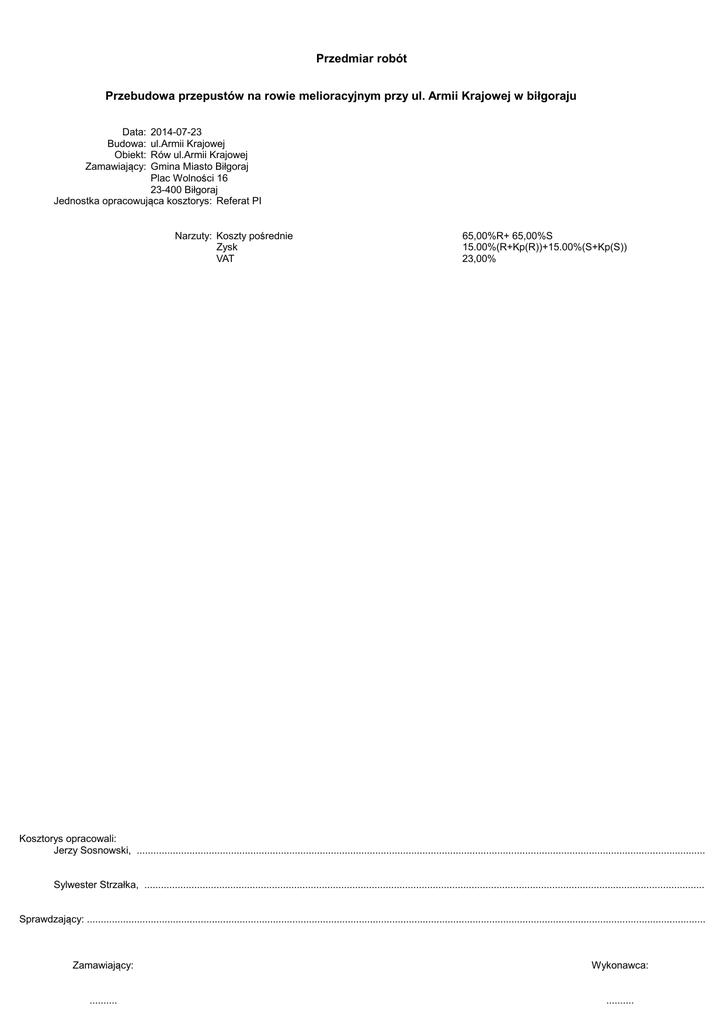 Przedmiar robót Przebudowa przepustów na rowie melioracyjnym przy ul. Armii Krajowej w biłgoraju Data: Budowa: Obiekt: Zamawiający: 2014-07-23 ul.Armii Krajowej Rów ul.Armii Krajowej Gmina Miasto Biłgoraj Plac Wolności 16 23-400 Biłgoraj Jednostka opracowująca kosztorys: Referat PI Narzuty: Koszty pośrednie Zysk VAT 65,00%R+ 65,00%S 15.00%(R+Kp(R))+15.00%(S+Kp(S)) 23,00% Kosztorys opracowali: Jerzy Sosnowski, .................................................................................................................................................................................................................... Sylwester Strzałka, ................................................................................................................................................................................................................. Sprawdzający: ...................................................................................................................................................................................................................................... Zamawiający: Wykonawca: .......... .......... Zuzia (C) DataComp 1994-2009(lic. 667) Przedmiar robót Podstawa nakładu, opis pozycji, wyliczenie ilości robót Ilość Krot. Jedn. 1 Przepusty drogowe ul.Armi Krajowej 1.1 KNR 201/119/3 Roboty pomiarowe przy liniowych robotach ziemnych, trasa dróg w terenie równinnym 0,2 1.2 KNR 231/805/3 Rozebranie nawierzchni z kostki betonowej, na podsypce cementowo-piaskowej, ręcznie, wysokość kostki 8·cm - kostka do ponownego ułożenia zjazd do posesji nr 4 - chodnik 1,2*3,7 = 4,440000 zjazd do poseski nr 2h 5,5*4,5 = 24,750000 zjazd do posesji nr 2f 8,9*3,6 = 32,040000 chodnik przy ul.Radzika 3*2*2 = 12,000000 73,23 73,23 1.3 KNR 231/814/2 Rozebranie krawężników wtopionych i obrzeży trawnikowych, obrzeża 8x30·cm na podsypce piaskowej - obrzeża do ponownego wbudowania 6*3,5+2*4 = 29,000000 29,00 29,00 1.4 KNR 231/813/3 Rozebranie krawężników, betonowych 15x30·cm na podsypce cementowo-piaskowej 5 1.5 KNR 231/804/3 Rozebranie nawierzchni, z tłucznia mechanicznie, grubość nawierzchni 15·cm zjazd do działki nr 33 4,0*3,7 = 14,800000 zjazd do działki nr 4 4,1*3,7 = 15,170000 zjazdy z kostki i chodnik 88,03 = 88,030000 118,00 118,00 1.6 KNR 231/803/3 Rozebranie nawierzchni z mieszanek mineralno-bitumicznych, mechanicznie, grubość nawierzchni 3·cm - krotność 2 ul.Południowa 4,5*2,0 = 9,000000 9,00 9,00 1.7 KNR 225/407/6 Nawierzchnie z płyt wielootworowych, rozebranie nawierzchni z płyt ażurowych o powierzchni ponad 1,0·m2 (187,2-8,5*3-18,5-17,6)*(0,4*4) = 200,960000 200,960 200,960 1.8 KNR 231/817/2 Rozebranie ścieków z elementów betonowych, podsypka piaskowa, elementy betonowe grubości 15·cm (187,2-8,5*3-18,9-17,6) = 125,200000 125,200 125,200 1.9 KNR 201/217/6 Wykopy oraz przekopy wykonywane koparkami podsiębiernymi na odkład, koparka 0,40·m3, grunt kategorii III 187,2*0,70 = 131,040000 131,040 131,040 1.10 KNR 231/803/4 Rozebranie nawierzchni z mieszanek mineralno-bitumicznych, mechanicznie, dodatek za każdy dalszy 1·cm 9,00 1.11 KNR 231/103/2 Profilowanie i zagęszczanie podłoża pod warstwy konstrukcyjne nawierzchni, ręcznie, grunt kategorii III-IV - odbudowa pod zjazdy, chodniki, jezdnię 118+9 = 127,000000 127,00 127,00 1.12 KNR 231/114/5 Podbudowy z kruszyw, tłuczeń, warstwa dolna, grubość warstwy po zagęszczeniu 15·cm - tłuczeń z odzysku w 50% 112,2 odbudowa 1.13 KNR 231/311/1 Nawierzchnie z mieszanek mineralno-bitumicznych grysowo-żwirowych, warstwa asfaltowa wiążąca, grubości 4·cmkrotność 1,5 do 6cm - odbudowa 9 1.14 KNR 231/311/5 Nawierzchnie z mieszanek mineralno-bitumicznych grysowo-żwirowych, warstwa asfaltowa ścieralna, grubości 3·cm krotność 1,5 do 4,5cm - odbudowa 9 1.15 KNR 231/706/5 Oznakowanie poziome jezdni farbą chlorokauczukową, linie na skrzyżowaniach i przejściach dla pieszych malowane ręcznie 4,0*0,5*4 = 8,000000 8,00 8,00 1.16 KNR 231/407/5 Obrzeża betonowe, 30x8·cm na podsypce cementowo-piaskowej z wypełnieniem spoin zaprawą cementową - obrzeża z odzysku- odbudowa 29 1.17 KNR 231/403/3 Krawężniki betonowe, wystające 15x30·cm na podsypce cementowo-piaskowej - odbudowa 5 1.18 KNR 231/9903/3 Zeszyt 5 1994r. Chodniki z kostki brukowej betonowej o grubości 6·cm, na podsypce cementowo-piaskowej, kostka prostokątna 20x10·cm - kostka z rozbiórki odbudowa 3*2*2 = 12,000000 12,00 12,00 1.19 KNR 231/9906/3 Zeszyt 8/9 1994r. Wjazdy do bram z kostki brukowej betonowej 20x10cm grubości 8·cm, na podsypce cementowo-piaskowej grubości 5·cm - kostka z rozbiórki - odbudowa 73,23-4,44-12,0 = 56,790000 56,79 56,79 Zuzia (C) DataComp 1994-2009(lic. 667) km m2 m m m2 2 m2 m2 m m3 4 m2 m2 m2 1,5 m2 1,5 m2 m2 m m m2 m2 Zuzia (C) DataComp 1994-2009(lic. 667) Podstawa nakładu, opis pozycji, wyliczenie ilości robót 1.20 KNR 231/816/3 Rozebranie przepustów rurowych, rury betonowe Fi·60·cm 8,5+8,5+8,5+18,9+17,6 Ilość = 62,000000 62,0 1.21 KNR 211/1103/8 (2) Transport lądowy materiałów na odległość do 0,5·km, elementy betonowe i żelbetowe o masie ponad 400kg, załadunek mechaniczny, samochód skrzyniowy 1.22 KNRW 218/513/5 (1) Studnie rewizyjne z kręgów betonowych w gotowym wykopie, Fi·1500·mm, głębokość 3·m 5 = 5,000000 5,000 1.23 KNRW 218/513/6 Studnie rewizyjne z kręgów betonowych w gotowym wykopie, Fi·1500·mm, za każde 0,5·m różnicy głębokości -5*2 = -10,000000 -10,000 1.24 Kalkulacja indywidualna Przejścia szczelne przez ściany studni betonowych fi150 1.25 Kalkulacja indywidualna Przejścia szczelne przez ściany studni betonowych fi250 1.26 Kalkulacja indywidualna Przejścia szczelne przez ściany studni betonowych fi600 1.27 Kalkulacja indywidualna Przejścia szczelne przez ściany studni betonowych fi1000 1.28 KNR 218/501/3 Podłoże z materiałów sypkich - pospółka lub kruszywo kamienne, grubość średnio 20·cm (187,2-5*1,5)