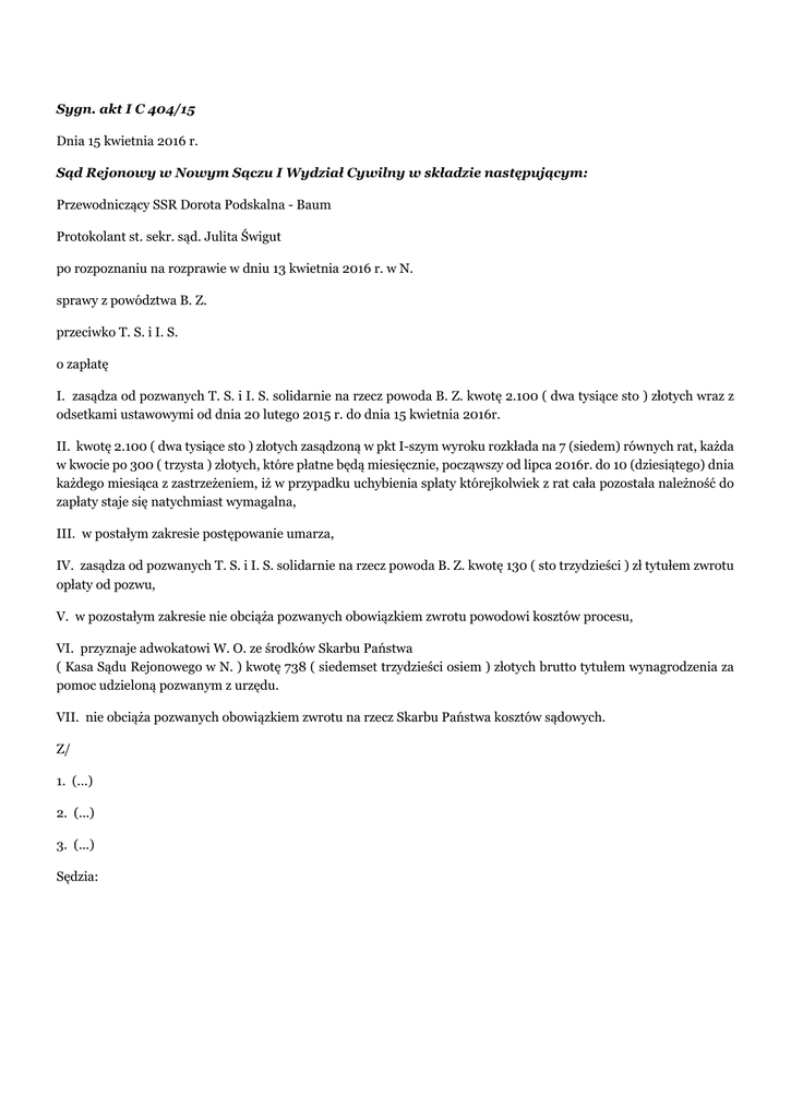 Sygn. akt I C 404/15 Dnia 15 kwietnia 2016 r. Sąd Rejonowy w Nowym Sączu I Wydział Cywilny w składzie następującym: Przewodniczący SSR Dorota Podskalna - Baum Protokolant st. sekr. sąd. Julita Świgut po rozpoznaniu na rozprawie w dniu 13 kwietnia 2016 r. w N. sprawy z powództwa B. Z. przeciwko T. S. i I. S. o zapłatę I. zasądza od pozwanych T. S. i I. S. solidarnie na rzecz powoda B. Z. kwotę 2.100 ( dwa tysiące sto ) złotych wraz z odsetkami ustawowymi od dnia 20 lutego 2015 r. do dnia 15 kwietnia 2016r. II. kwotę 2.100 ( dwa tysiące sto ) złotych zasądzoną w pkt I-szym wyroku rozkłada na 7 (siedem) równych rat, każda w kwocie po 300 ( trzysta ) złotych, które płatne będą miesięcznie, począwszy od lipca 2016r. do 10 (dziesiątego) dnia każdego miesiąca z zastrzeżeniem, iż w przypadku uchybienia spłaty którejkolwiek z rat cała pozostała należność do zapłaty staje się natychmiast wymagalna, III. w postałym zakresie postępowanie umarza, IV. zasądza od pozwanych T. S. i I. S. solidarnie na rzecz powoda B. Z. kwotę 130 ( sto trzydzieści ) zł tytułem zwrotu opłaty od pozwu, V. w pozostałym zakresie nie obciąża pozwanych obowiązkiem zwrotu powodowi kosztów procesu, VI. przyznaje adwokatowi W. O. ze środków Skarbu Państwa ( Kasa Sądu Rejonowego w N. ) kwotę 738 ( siedemset trzydzieści osiem ) złotych brutto tytułem wynagrodzenia za pomoc udzieloną pozwanym z urzędu. VII. nie obciąża pozwanych obowiązkiem zwrotu na rzecz Skarbu Państwa kosztów sądowych. Z/ 1. (...) 2. (...) 3. (...) Sędzia: