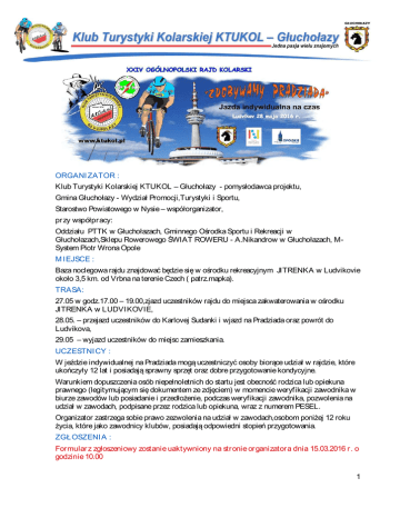 ORGANI ZATOR : Klub Turystyki Kolarskiej KTUKOL – Głuchołazy - pomysłodawca projektu, Gmina Głuchołazy - Wydział Promocji,Turystyki i Sportu, Starostwo Powiatowego w Nysie – współorganizator, pr zy współpracy: Oddziału PTTK w Głuchołazach, Gminnego Ośrodka Sportu i Rekreacji w Głuchołazach,Sklepu Rowerowego ŚWIAT ROWERU - A.Nikandrow w Głuchołazach, MSystem Piotr Wrona Opole M I EJSCE : Baza noclegowa rajdu znajdować będzie się w ośrodku rekreacyjnym JITRENKA w Ludvikovie około 3,5 km. od Vrbna na terenie Czech ( patrz.mapka). TRASA: 27.05 w godz.17.00 – 19.00,zjazd uczestników rajdu do miejsca zakwaterowania w ośrodku JITRENKA w LUDVIKOVIE, 28.05. – przejazd uczestników do Karlovej Sudanki i wjazd na Pradziada oraz powrót do Ludvikova, 29.05 – wyjazd uczestników do miejsc zamieszkania. UCZESTNI CY : W jeździe indywidualnej na Pradziada mogą uczestniczyć osoby biorące udział w rajdzie, które ukończyły 12 lat i posiadają sprawny sprzęt oraz dobre przygotowanie kondycyjne. Warunkiem dopuszczenia osób niepełnoletnich do startu jest obecność rodzica lub opiekuna prawnego (legitymującym się dokumentem ze zdjęciem) w momencie weryfikacji zawodnika w biurze zawodów lub posiadanie i przedłożenie, podczas weryfikacji zawodnika, pozwolenia na udział w zawodach, podpisane przez rodzica lub opiekuna, wraz z numerem PESEL. Organizator zastrzega sobie prawo zezwolenia na udział w zawodach,osobom poniżej 12 roku życia, które jako zawodnicy klubów, posiadają odpowiedni stopień przygotowania. ZGŁ OSZENI A : Formular z zgłoszeniowy zostanie uaktywniony na stronie organizatora dnia 15.03.2016 r. o godzinie 10.00 1 1.Zgłoszeń można dokonywać wyłącznie drogą elektroniczną poprzez formularz dostępny na stronie zawodów www.ktukol.pl, do wyczerpaniem puli zapisów limit zawodników – 200 osób, 2.Organizator rezerwuje sobie prawo dysponowania dodatkową pulą miejsc zgłoszeniowych w ilości 20 zawodników, 3.Organizator rezerwuje sobie prawo do zmiany limitu uczestników zawodów, 4.Po zgłoszeniu należy niezwłocznie dokonać opłaty startowej, a skan opłaty przesłać na adres organizatora e - mail : [email protected] 5.Lista zgłoszonych zawodników, wraz z informacją o wpłacie, będzie podawana i uaktualniana na bieżąco na stronie organizatora zawodów, po przesłaniu pocztą elektroniczną na adres organizatora e - mail : [email protected], skanu dowodu opłaty 6.Za zgłoszenie uważa się wypełniony przez uczestnika formularz zgłoszeniowy oraz wniesienie opłaty przelewem w określonych poniżej terminach. 7.Organizator nie zwraca pieniędzy za wniesioną opłatę startową. WPI SOWE : Wpisowe dla uczestników rajdu wynosi 45 złotych od osoby. Wpłaty należy dokonać do dnia 1 maja 2016 r. na konto : PTTK - Oddział Głuchołazy-Bank Spółdzielczy Nr rach. 38 8891 0000 0000 0983 2000 0010 z dopiskiem wpisowe na Raj d Zdobywamy Pradziada. Osoby, które nie dokonają wpłaty na poniższy rachunek bankowy do dnia 1 maja 2016 r., zostaną usunięte z listy zgłoszeniowej. Uwaga w przypadku wolnych miejsc np. po rezygnacji wcześniej zgłoszonych zawodników lub wykreśleniu ich przez organizatora, z powodu nieopłacenia wpisowego w podanym terminie, po 1 maja wpisowe wynosi 60 zł. od osoby. ŚWI ADCZENI A: W ramach wpisowego organizator przewiduje : 2 Odznaka wraz z imienną legitymacją przyznawana będzie uroczyście podczas podsumowania zawodów,po wcześniejszej weryfikacji ilości startów w bazie danych organizatora . Uroczyste podsumowanie zawodów nastąpi 28 maja 2016 r. w bazie noclegowej w ośrodku Jtrenka w Ludvikovie w godzinach 15.00 - 16.00 ŚWI ADCZENI E DODATK OWE : Pam iątkowa i niepowtarzalna koszulka kolarska - (zam ówienie do 28.04.2016) NOCL EGI : Za pośrednictwem organizatora,istnieje możliwość zarezerwowania noclegu w ośrodku rekreacyjnym JTRENKA w Ludvikovie k.Vrbna w 7-osobowych domkach kempingowych lub budynku z pościelą w cenie: 150 kćs – jedna noc, 240 kćs – 2 noce. Opłaty za noclegi w koronach czeskich przyjmowane będą od uczestników na terenie bazy noclegowej w dniu rajdu. Ilość miejsc noclegowych ograniczona. Zgłoszenie rezerwacji musi dotrzeć do organizatora wyłącznie na karcie zgłoszenia noclegu,najpóźniej do 10 maja 2016 r. na adres organizatora : Eligiusz Jędrysek : e - mail : [email protected], tel. 500082086 po godz. 18.00 Karta rezerwacji noclegu na stronie organizatora. Pr zed wypełnieniem karty zgłoszenia rezer wacj i noclegu, proszę sprawdzić elefonicznie lub na stronie www.ktukol.pl dostępność opcj i zakwaterowania domki lub budynek ( lista poniżej ). OCHRONA PRZYRODY : Uczestników na czas startu w Zawodach obowiązuje: - zachowanie szczególnej troski o przyrodę Euroregionu Pradziada, - zakaz poruszania się poza wyznaczoną trasą zawodów, - zakaz zaśmiecania – wszelkie opakowania po żelach, batonach, itp. należy zabierać ze sobą i wyrzucać tylko w miejscach do tego przeznaczonych, -zakaz niszczenia przyrody POSTANOWI ENI A OGÓL NE : - każdy zawodnik ma obowiązek zapoznać się z regulaminem zawodów i jest zobowiązany do jego przestrzegania, - organizator rajdu - zawodów, nie ubezpiecza uczestników od następstw nieszczęśliwych wypadków i zaleca indywidualne ubezpieczenie od NW i OC, - wszyscy uczestnicy biorą udział w rajdzie i zawodach na własną odpowiedzialność i nie mogą wnosić żadnych roszczeń w stosunku do organizatorów w razie zaistnienia zdarzeń losowych podczas trwania imprezy, - za kolizje i wypadki na trasie wyścigu ponosi odpowiedzialność zawodnik lub inny użytkownik drogi przyczyniając się wskutek naruszenia przepisów ruchu drogowego do zaistnienia zdarzenia, -zawodnicy wyścigu poruszają się po drodze prawym pasem jezdni, albo prawą stroną drogi zgodnie z przepisami ruchu drogowego, 3 - podczas wjazdu jak i zjazdu,zawodnicy muszą zachować szczególną ostrożność mając na uw