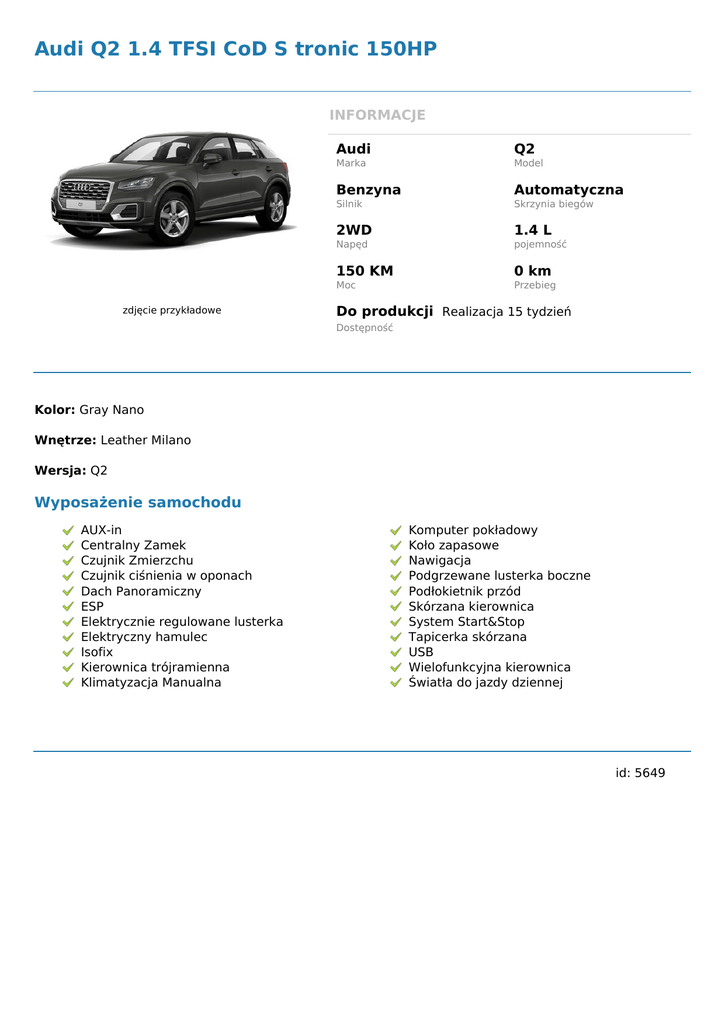 Audi Q2 1.4 TFSI CoD S tronic 150HP INFORMACJE zdjęcie przykładowe Audi Q2 Marka Model Benzyna Automatyczna Silnik Skrzynia biegów 2WD 1.4 L Napęd pojemność 150 KM 0 km Moc Przebieg Do produkcji Realizacja 15 tydzień Dostępność Kolor: Gray Nano Wnętrze: Leather Milano Wersja: Q2 Wyposażenie samochodu AUX-in Centralny Zamek Czujnik Zmierzchu Czujnik ciśnienia w oponach Dach Panoramiczny ESP Elektrycznie regulowane lusterka Elektryczny hamulec Isofix Kierownica trójramienna Klimatyzacja Manualna Komputer pokładowy Koło zapasowe Nawigacja Podgrzewane lusterka boczne Podłokietnik przód Skórzana kierownica System Start&Stop Tapicerka skórzana USB Wielofunkcyjna kierownica Światła do jazdy dziennej id: 5649 Powered by TCPDF (www.tcpdf.org)
