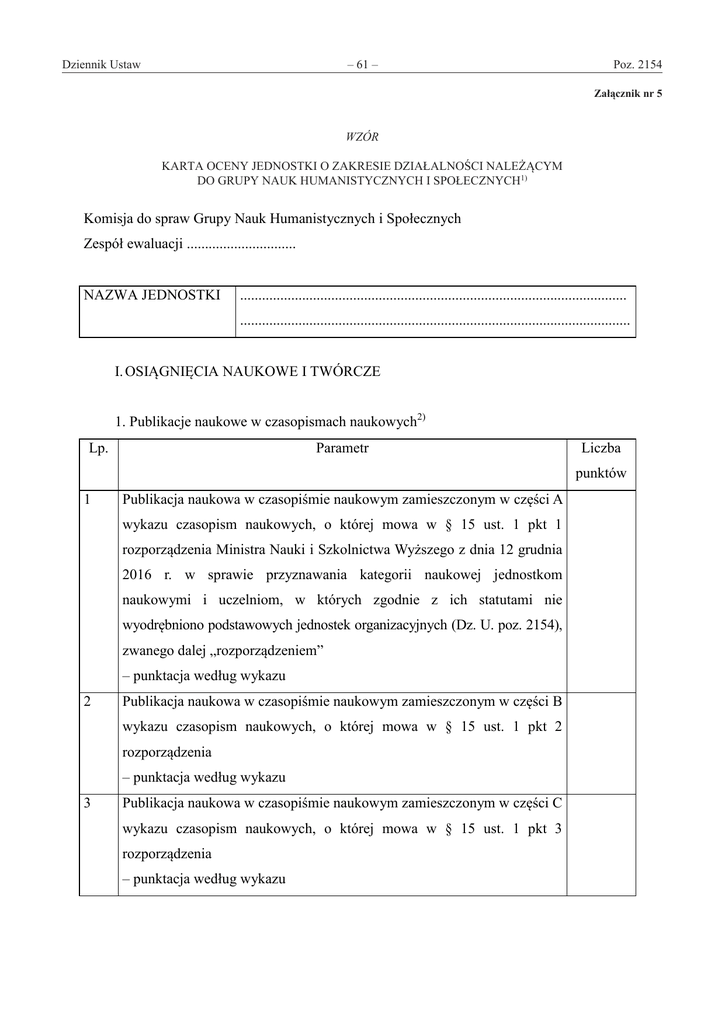 – 45 – Dziennik Ustaw – 61 – Poz. 2154 Załącznik nr 5 WZÓR Załącznik nr 5 WZÓR KARTA OCENY JEDNOSTKI O ZAKRESIE DZIAŁALNOŚCI NALEŻĄCYM DO 1) KARTA OCENY JEDNOSTKI O ZAKRESIE DZIAŁALNOŚCI NALEŻĄCYM GRUPY NAUK HUMANISTYCZNYCH I SPOŁECZNYCH 1) DO GRUPY NAUK HUMANISTYCZNYCH I SPOŁECZNYCH Komisja do spraw Grupy Nauk Humanistycznych i Społecznych Zespół ewaluacji .............................. NAZWA JEDNOSTKI .......................................................................................................... ........................................................................................................... I. OSIĄGNIĘCIA NAUKOWE I TWÓRCZE 1. Publikacje naukowe w czasopismach naukowych2) Lp. Parametr Liczba punktów 1 Publikacja naukowa w czasopiśmie naukowym zamieszczonym w części A wykazu czasopism naukowych, o której mowa w § 15 ust. 1 pkt 1 rozporządzenia Ministra Nauki i Szkolnictwa Wyższego z dnia 12 grudnia 2016 r. w sprawie przyznawania kategorii naukowej jednostkom naukowymi i uczelniom, w których zgodnie z ich statutami nie wyodrębniono podstawowych jednostek organizacyjnych (Dz. U. poz. 2154), zwanego dalej „rozporządzeniem” – punktacja według wykazu 2 Publikacja naukowa w czasopiśmie naukowym zamieszczonym w części B wykazu czasopism naukowych, o której mowa w § 15 ust. 1 pkt 2 rozporządzenia – punktacja według wykazu 3 Publikacja naukowa w czasopiśmie naukowym zamieszczonym w części C wykazu czasopism naukowych, o której mowa w § 15 ust. 1 pkt 3 rozporządzenia – punktacja według wykazu Dziennik Ustaw 4 –– 46 – 62 – Poz. 2154 Recenzowana publikacja naukowa w języku innym niż polski, o której mowa w § 10 ust. 1 pkt 4 rozporządzenia, zamieszczona w zagranicznym czasopiśmie naukowym niezamieszczonym w wykazie czasopism naukowych, o którym mowa w § 15 ust. 1 rozporządzenia – 5 pkt 5 Publikacja naukowa w recenzowanych materiałach z konferencji międzynarodowej, uwzględnionych w uznanej bazie publikacji naukowych o zasięgu międzynarodowym – liczba punktów odpowiada najniżej punktowanej publikacji naukowej w czasopiśmie naukowym zamieszczonym w części A wykazu czasopism naukowych, o której mowa w § 15 ust. 1 pkt 1 rozporządzenia RAZEM 2. Monografie naukowe Lp. Parametr Liczba punktów 1 Monografia naukowa, w której liczba autorów nie przekracza 3, a co najmniej jeden z nich wskazał jednostkę jako afiliację – 25 pkt – 50 pkt – w przypadku monografii naukowej uznanej za dzieło wybitne 2 Monografia naukowa lub monografia naukowa uznana za dzieło wybitne, w której liczba autorów wynosi co najmniej 4, a ich udział nie jest wyodrębniony – liczba punktów proporcjonalna do udziału liczby autorów, którzy wskazali jednostkę jako afiliację, w ogólnej liczbie autorów – monografia naukowa – 25 pkt∗Ajn/A – monografia naukowa uznana za dzieło wybitne – 50 pkt∗Ajn/A, gdzie: Ajn – oznacza liczbę autorów monografii naukowej, którzy wskazali jednostkę jako afiliację; A – oznacza ogólną liczbę autorów monografii naukowej 3 Monografia naukowa wieloautorska, w której autorstwo poszczególnych rozdziałów jest oznaczone, a liczba autorów wynosi co najmniej –– 47 – 63 – Dziennik Ustaw 4 i wszyscy wskazali jednostkę jako afiliację – 15 pkt – 30 pkt – w przypadku monografii naukowej uznanej za dzieło wybitne 4 Monografia naukowa wieloautorska, w której: 1) autorstwo poszczególnych rozdziałów jest oznaczone, 2) liczba autorów wynosi co najmniej 4, 3) łączna objętość rozdziałów autorstwa osób, które wskazały jednostkę jako afiliację (warunek ten dotyczy także redaktora naukowego tomu), obejmuje co najmniej 6 arkuszy wydawniczych – 15 pkt – 30 pkt – w przypadku monografii naukowej uznanej za dzieło wybitne 5 Rozdział w monografii naukowej wieloautorskiej, w której autorstwo poszczególnych rozdziałów jest oznaczone, a liczba autorów wynosi co najmniej 4, z wyłączeniem monografii naukowych, o których mowa w lp. 4 – 5 pkt – 10 pkt – w przypadku monografii naukowej uznanej za dzieło wybitne, ale łącznie za rozdziały w jednej monografii naukowej nie więcej niż: – 15 pkt – 30 pkt – w przypadku monografii naukowej uznanej za dzieło wybitne. Jeżeli liczba autorów rozdziału w monografii naukowej wynosi co najmniej 2, jednostka, którą autor rozdziału wskazał jako afiliację, otrzymuje: – 2,5 pkt – 10 pkt – w przypadku monografii naukowej uznanej za dzieło wybitne 6 Redakcja naukowa monografii naukowej wieloautorskiej, w której autorstwo poszczególnych rozdziałów jest oznaczone, a liczba autorów wynosi co najmniej 4, z wyłączeniem monografii naukowych, o których mowa w lp. 4, dokonana przez pracownika jednostki – 5 pkt – 10 pkt – w przypadku monografii naukowej uznanej za dzieło wybitne RAZEM Poz. 2154 – 48 – Dziennik Ustaw 3. Działalność – 64 – innowacyjna (dotyczy Poz. 2154 dyscypliny naukowej towaroznawstwo w dziedzinie nauk ekonomicznych) Lp. Parametr Liczba punktów 1 Patent na wynalazek udzielony w okresie objętym ankietą na rzecz ocenianej jednostki, której pracownikiem jest twórca albo współtwórca wynalazku: – przez Urząd Patentowy Rzeczypospolitej Polskiej – 30 pkt – za granicą – 40 pkt. Punktowany jest tylko jeden patent udzielony na dany wynalazek. 2 Wdrożenie po raz pierwszy w okresie objętym ankietą wynalazku, na który jednostce został udzielony patent w okresie objętym ankietą albo przed tym okresem – 30 pkt. Punktowane jest tylko jedno wdrożenie wynalazku. 3 Patent na wynalazek udzielony w okresie objętym ankietą przez Urząd Patentowy Rzeczypospolitej Polskiej lub za granicą na rzecz innego podmiotu niż oceniana jednostka, której pracownikiem jest twórca albo współtwórca wynalazku – 15 pkt. Punktowany jest tylko jeden patent udzielony na dany wynalazek. 4 Prawa ochronne na wzór użytkowy lub znak towar