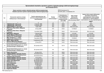 Sprawozdanie kwartalne operatora systemu dystrybucyjnego elektroenergetycznego za III kwartał 2015 r. Nazwa operatora systemu dystrybucyjnego elektroenergetycznego Siedziba operatora systemu dystrybucyjnego elektroenergetycznego Lp. 1 2 3 4 5 6 7 8 9 10 11 Oznaczenie wytwórcy energii elektrycznej w mikroinstalacji 1) 1 "MEWODLEW" R.Murawski "MEWODLEW" R.Murawski PRONTOPRINT A. Szuchnicki MEW Nowa Wieś Ełcka J.Matysiak, L.Kotarski MEW Nowa Wieś Ełcka J.Matysiak, L.Kotarski MEW Rygol J.Matysiak PLANT Mateusz Makarewicz PPHU STYK Tomasz Drażba Młyn Usługowy s.c. T.Ołów, W.Bujnowski, R.Bujnowska MEW - Stefan Stelmak Barbara Witkowska Naprawa i Konserwacja Urzadzeń Elektrycznych PGE Dystrybucja S.A. 20-340 Lublin, ul. Garbarska 21A Termin wytworzenia po raz pierwszy energii elektrycznej w mikroinstalacji Rodzaj mikroinstalacji 2) 2 2 styczeń 1999 5 sierpień 2003 1 lipiec 2002 3 WO WO WO 4 30,00 40,00 22,00 5 18,07 4 046,00 Brak ośw.wytw. Łączna ilość energii elektrycznej sprzedanej sprzedawcy zobowiązanemu, która została wytworzona w mikroinstalacji i wprowadzona do sieci dystrybucyjnej (kWh)3) 6 18,07 4 046,00 Brak ośw.wytw. 25 luty 2009 WO 40,00 12 948,00 12 948,00 4 grudzień 2000 WO 30,00 Brak ośw.wytw. Brak ośw.wytw. 1 styczeń 2015 25 luty 2009 23 listopad 2004 WO WO WO 24,00 11,00 15,00 4 212,00 Brak ośw.wytw. Brak ośw.wytw. 4 212,00 Brak ośw.wytw. Brak ośw.wytw. 8 grudzień 2000 WO 30,00 10 829,00 10 829,00 5 październik 2004 WO 30,00 Brak ośw.wytw. Brak ośw.wytw. 22 luty 2012 WO 34,00 Brak ośw.wytw. Brak ośw.wytw. Zainstalowana Ilość energii moc elektryczna elektrycznej mikroinstalacji wytworzonej w przyłączonej do mikroinstalacji (kWh)3) sieci (kW) 12 Zespół Szkół Elektrycznych im. Jausza Groszkowskiego w Białymstoku 26 czerwiec 2012 PV 20,16 Brak ośw.wytw. Brak ośw.wytw. 13 Zespół Szkół Elektrycznych im. Jausza Groszkowskiego w Białymstoku 26 czerwiec 2012 WI 9,00 Brak ośw.wytw. Brak ośw.wytw. 24 lipiec 2014 16 kwiecień 2014 PV PV 39,00 10,00 Brak ośw.wytw. Brak ośw.wytw. Brak ośw.wytw. Brak ośw.wytw. 30 kwiecień 2014 PV 5,00 Brak ośw.wytw. Brak ośw.wytw. 19 maj 2015 17 czerwiec 2014 26 czerwiec 2014 28 sierpień 2015 28 lipiec 2014 31 lipiec 2014 1 maj 2014 27 sierpień 2014 8 wrzesień 2014 PV PV PV PV PV PV PV PV PV 15,00 16,50 2,88 10,00 4,00 4,32 0,96 5,15 20,00 Brak ośw.wytw. Brak ośw.wytw. 497,00 Brak ośw.wytw. Brak ośw.wytw. 1 645,00 Brak ośw.wytw. Brak ośw.wytw. Brak ośw.wytw. Brak ośw.wytw. Brak ośw.wytw. 317,80 Brak ośw.wytw. Brak ośw.wytw. 941,00 Brak ośw.wytw. Brak ośw.wytw. Brak ośw.wytw. 14 15 16 17 18 19 20 21 22 23 24 25 Regina Szuchnicka "BIURO-SERWIS" Sylwester Pawłow "GRAF" Pracownia ArchitektonicznoGraficzna Piotr Kuczyński "BIURO-SERWIS" Sylwester Pawłow "BIURO-SERWIS" Sylwester Pawłow Aneta i Piotr Matuszczyk Partner Sp. z o.o. Leon Urbanowicz Zdzisław Mróz Stanisław Derehajło Grzegorz Stypułkowski Eugeniusz Płoński PGE Dystrybucja S.A. 1/24 Lp. 26 27 28 29 30 31 32 33 34 35 36 37 38 39 40 41 42 43 44 45 46 47 48 Oznaczenie wytwórcy energii elektrycznej w mikroinstalacji 1) Termin wytworzenia po raz pierwszy energii elektrycznej w mikroinstalacji Rodzaj mikroinstalacji 2) 1 Jan Szukajtys Hanna Kunicka Kuklo Krzysztof Wiesław Załuska Grzegorz Maciej Płoński Danuta Szotko, Niepubliczny Zakład Opieki Zdrowotnej PROMED-SCHOL Irena Falkowska-Błażewicz Gobczyńska Ewa Witold Konopka P.W.GOLIAT Tartak Katarzyna Rutkowska Kazimierz Mikołajewski Jan Olszewski Mnich Aleksandra Mazurek Stanisław Bibińska Żaneta Fotowoltaika Mazuchówka Sp. z o.o. Kulikowski Kazmierz Jabłonowski Zdzisław Wytwórnia Wód Gazowanych Makaronów i Sękaczy Ośrodek Wczasowy "Helena" Antoni Nietubyć Alfons Tałałaj Zagilski Sebastian Ryszard Ralicki 2 1 październik 2014 7 październik 2014 15 październik 2014 20 październik 2014 20 październik 2014 3 PV PV PV PV PV 4 12,00 4,50 3,00 4,14 15,00 5 Brak ośw.wytw. Brak ośw.wytw. Brak ośw.wytw. 1 606,31 Brak ośw.wytw. Łączna ilość energii elektrycznej sprzedanej sprzedawcy zobowiązanemu, która została wytworzona w mikroinstalacji i wprowadzona do sieci dystrybucyjnej (kWh)3) 6 Brak ośw.wytw. Brak ośw.wytw. Brak ośw.wytw. 1 009,70 Brak ośw.wytw. 17 styczeń 2015 PV 15,00 Brak ośw.wytw. Brak ośw.wytw. 12 listopad 2014 9 grudzień 2014 8 luty 2015 14 styczeń 2015 1 kwiecień 2015 20 styczeń 2015 1 kwiecień 2015 8 styczeń 2015 1 styczeń 2015 18 luty 2015 4 marzec 2015 1 czerwiec 2015 30 czerwiec 2015 PV PV PV PV PV PV PV PV PV PV PV PV PV 3,00 8,40 24,00 2,45 4,60 4,50 3,60 1,40 4,00 15,00 40,00 10,00 6,00 1 000,00 Brak ośw.wytw. 11 060,00 Brak ośw.wytw. 3 828,00 1 894,00 1 471,05 Brak ośw.wytw. Brak ośw.wytw. Brak ośw.wytw. Brak ośw.wytw. 4 693,00 20,00 918,00 Brak ośw.wytw. 9 791,00 Brak ośw.wytw. 3 358,70 1 441,07 852,55 Brak ośw.wytw. Brak ośw.wytw. Brak ośw.wytw. Brak ośw.wytw. 3 347,00 2 047,70 1 czerwiec 2015 PV 40,00 Brak ośw.wytw. Brak ośw.wytw. 4 lipiec 2015 1 czerwiec 2015 6 lipiec 2015 PV PV PV 3,00 4,00 5,00 1 160,00 Brak ośw.wytw. 1 155,00 789,00 Brak ośw.wytw. 1 155,00 8 czerwiec 2015 PV 40,00 Brak ośw.wytw. Brak ośw.wytw. 1 czerwiec 2015 1 lipiec 2015 19 sierpień 2015 25 sierpień 2015 28 wrzesień 2015 27 sierpień 2015 21 maj 2015 25 sierpień 2015 10 lipiec 2015 5 sierpień 2015 15 wrzesień 2015 PV PV PV PV PV PV PV PV PV PV PV 39,00 10,00 3,50 5,06 6,00 6,00 4,08 3,00 5,00 7,50 3,00 Brak ośw.wytw. Brak ośw.wytw. 511,00 665,00 Brak ośw.wytw. 568,00 Brak ośw.wytw. Brak ośw.wytw. Brak ośw.wytw. Brak ośw.wytw. 146,00 Brak ośw.wytw. Brak ośw.wytw. 316,00 468,60 Brak ośw.wytw. 568,00 Brak ośw.wytw. Brak ośw.wytw. Brak ośw.wytw. Brak ośw.wytw. 121,30 49 Przedsiębiorstwo Wytwórczo-HandlowoUsługowe "Zbyszko" Sp. z o.o. 50 51 52 53 54 55 56 57 58 59 60 AGWO-SERWIS Wojciech Śliwowski Tomas Consulting Olszewski Marian Abramczyk Andrzej Szaniawski Marcin Grochowska-Terpiał Aleksand