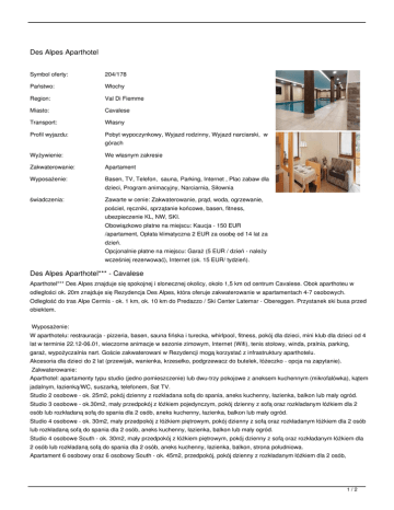 Des Alpes Aparthotel Symbol oferty: 204/178 Państwo: Włochy Region: Val Di Fiemme Miasto: Cavalese Transport: Własny Profil wyjazdu: Pobyt wypoczynkowy, Wyjazd rodzinny, Wyjazd narciarski, w Wyżywienie: We własnym zakresie Zakwaterowanie: Apartament Wyposażenie: Basen, TV, Telefon, sauna, Parking, Internet , Plac zabaw dla świadczenia: Zawarte w cenie: Zakwaterowanie, prąd, woda, ogrzewanie, górach dzieci, Program animacyjny, Narciarnia, Siłownia pościel, ręczniki, sprzątanie końcowe, basen, fitness, ubezpieczenie KL, NW, SKI. Obowiązkowo płatne na miejscu: Kaucja - 150 EUR /apartament, Opłata klimatyczna 2 EUR za osobę od 14 lat za dzień. Opcjonalnie płatne na miejscu: Garaż (5 EUR / dzień - należy wcześniej rezerwować), Internet (ok. 15 EUR/ tydzień). Des Alpes Aparthotel*** - Cavalese Aparthotel*** Des Alpes znajduje się spokojnej i słonecznej okolicy, około 1,5 km od centrum Cavalese. Obok aparthoteu w odległości ok. 20m znajduje się Rezydencja Des Alpes, która oferuje zakwaterowanie w apartamentach 4-7 osobowych. Odległość do tras Alpe Cermis - ok. 1 km, ok. 10 km do Predazzo / Ski Center Latemar - Obereggen. Przystanek ski busa przed obiektem. Wyposażenie: W aparthotelu: restrauracja - pizzeria, basen, sauna fińska i turecka, whirlpool, fitness, pokój dla dzieci, mini klub dla dzieci od 4 lat w terminie 22.12-06.01, wieczorne animacje w sezonie zimowym, Internet (Wifi), tenis stołowy, winda, pralnia, parking, garaż, wypożyczalnia nart. Goście zakwaterowani w Rezydencji mogą korzystać z infrastruktury aparthotelu. Akcesoria dla dzieci do 2 lat (przewijak, wanienka, krzesełko, podgrzewacz do butelek, łóżeczko - opcja na zapytanie). Zakwaterowanie: Aparthotel: apartamenty typu studio (jedno pomieszczenie) lub dwu-trzy pokojowe z aneksem kuchennym (mikrofalówka), kątem jadalnym, łazienką/WC, suszarką, telefonem, Sat TV. Studio 2 osobowe - ok. 25m2, pokój dzienny z rozkładana sofą do spania, aneks kuchenny, łazienka, balkon lub mały ogród. Studio 3 osobowe - ok.30m2, mały przedpokój z łóżkiem pojedynczym, pokój dzienny z sofą oraz rozkładanym łóżkiem dla 2 osób lub rozkładaną sofą do spania dla 2 osób, aneks kuchenny, łazienka, balkon lub mały ogród. Studio 4 osobowe - ok. 30m2, mały przedpokój z łóżkiem piętrowym, pokój dzienny z sofą oraz rozkładanym łóżkiem dla 2 osób lub rozkładaną sofą do spania dla 2 osób, aneks kuchenny, łazienka, balkon lub mały ogród. Studio 4 osobowe South - ok. 30m2, mały przedpokój z łóżkiem piętrowym, pokój dzienny z sofą oraz rozkładanym łóżkiem dla 2 osób lub rozkładaną sofą do spania dla 2 osób, aneks kuchenny, łazienka, balkon, strona południowa. Apartament 6 osobowy oraz 6 osobowy South - ok. 45m2, przedpokój, pokój dzienny z rozkładanym łóżkiem dla 2 osób, 1/2 sypialnia z łóżkiem podwójnym, sypialnia z 2 łóżkami pojedynczymi, aneks kuchenny, łazienka, balkon. South - strona południowa. Wyżywienie: We własnym zakresie. Zawarte w cenie: Zakwaterowanie, prąd, woda, ogrzewanie, pościel, ręczniki, sprzątanie końcowe, basen, fitness, ubezpieczenie KL, NW, SKI. Obowiązkowo płatne na miejscu: Kaucja - 150 EUR /apartament Opłata klimatyczna - ok. 2 EUR za osobę za dzień Dostawka dla dziecka do 2 lat - 70 EUR / tydzień (należy zgłaszać przy rezerwacji) Opcjonalnie płatne na miejscu: Garaż (5 EUR / dzień - należy wcześniej rezerwować), Internet (ok. 15 EUR/ tydzień). TERMINY: od: 2017-03-11 do: 2017-03-18 (8 dni), miejsca: zamów cena od: 922 PLN = 222 EUR od: 2017-03-18 do: 2017-03-25 (8 dni), miejsca: zamów cena od: 922 PLN = 222 EUR od: 2017-03-25 do: 2017-04-01 (8 dni), miejsca: zamów cena od: 922 PLN = 222 EUR CENNIK: Długość pobytu: 8 dni Grupa cenowa: I Ubezpieczenie (obligatoryjne) (*) Ubezpieczenie KL, NW, SKI 14 (*) Turystyczny Fundusz Gwarancyjny 2.5 Pobyt w obiekcie (do wyboru) Ap. 6 os. South standardowo dla osób: 6 minimalnie: 1 Apart. 5 os. standardowo dla osób: 5 minimalnie: 1 Apart. 4 os. standardowo dla osób: 4 minimalnie: 1 Studio 3 os. standardowo dla osób: 3 minimalnie: 1 (*) Studio 2 pers./ Studio 2 osobowe standardowo dla osób: 2 minimalnie: 1 Studio 4 pers. standardowo dla osób: 4 minimalnie: 1 715 603 571 484 417 506 Studio 4 south/ Studio 4 osobowe strona południowa standardowo dla osób: 4 minimalnie: 1 529 Ap. 6 pers Nord/ap. 6 osobowy Nord standardowo dla osób: 6 minimalnie: 1 685 Rodzaj osoby (do wyboru) Uczestnik (-) Waluta: EUR Aktualne ceny z systemu S.A.R.T. (-) - cena usługi, podatku kalkulowana przy osobie lub gratis (*) - kwota wliczona w cenę standardową 2/2