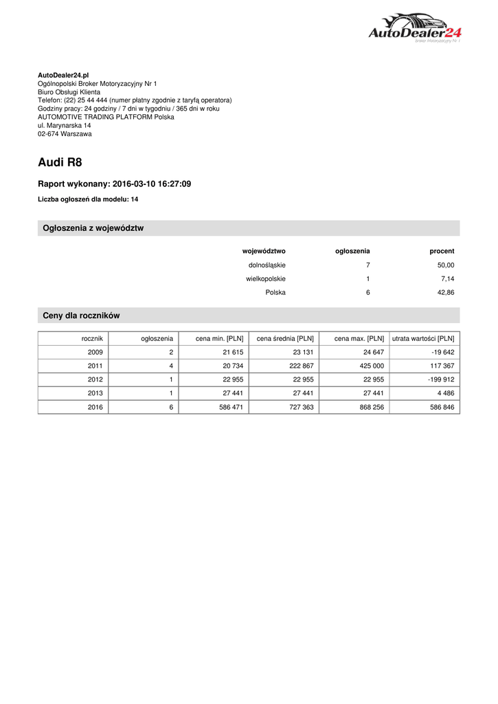AutoDealer24.pl Ogólnopolski Broker Motoryzacyjny Nr 1 Biuro Obsługi Klienta Telefon: (22) 25 44 444 (numer płatny zgodnie z taryfą operatora) Godziny pracy: 24 godziny / 7 dni w tygodniu / 365 dni w roku AUTOMOTIVE TRADING PLATFORM Polska ul. Marynarska 14 02-674 Warszawa Audi R8 Raport wykonany: 2016-03-10 16:27:09 Liczba ogłoszeń dla modelu: 14 Ogłoszenia z województw województwo ogłoszenia procent dolnośląskie 7 50,00 wielkopolskie 1 7,14 Polska 6 42,86 Ceny dla roczników rocznik ogłoszenia cena min. [PLN] cena średnia [PLN] cena max. [PLN] utrata wartości [PLN] 2009 2 21 615 23 131 24 647 -19 642 2011 4 20 734 222 867 425 000 117 367 2012 1 22 955 22 955 22 955 -199 912 2013 1 27 441 27 441 27 441 4 486 2016 6 586 471 727 363 868 256 586 846 Średnia utrata wartości w ciągu roku: 26 172 PLN Kolory nadwozia kolor ogłoszenia procent 6 42,86 szary 2 14,29 czarny 2 14,29 srebrny 2 14,29 szary metalik 1 7,14 biały 1 7,14 pojemność [cm] ogłoszenia procent 5200 5 35,71 5000 4 28,57 4150 2 14,29 4000 2 14,29 3000 1 7,14 Pojemności silnika Typy paliwa paliwo ogłoszenia procent benzyna 14 100,00 portal ogłoszenia procent 14 100,00 Portale ogłoszeniowe Powered by TCPDF (www.tcpdf.org)