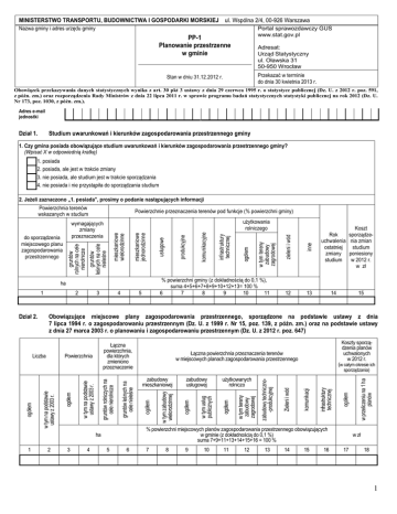 MINISTERSTWO TRANSPORTU, BUDOWNICTWA I GOSPODARKI MORSKIEJ ul. Wspólna 2/4, 00-926 Warszawa Nazwa gminy i adres urzędu gminy Portal sprawozdawczy GUS www.stat.gov.pl PP-1 Planowanie przestrzenne w gminie Adresat: Urząd Statystyczny ul. Oławska 31 50-950 Wrocław Przekazać w terminie do dnia 30 kwietnia 2013 r. Stan w dniu 31.12.2012 r. Obowiązek przekazywania danych statystycznych wynika z art. 30 pkt 3 ustawy z dnia 29 czerwca 1995 r. o statystyce publicznej (Dz. U. z 2012 r. poz. 591, z późn. zm.) oraz rozporządzenia Rady Ministrów z dnia 22 lipca 2011 r. w sprawie programu badań statystycznych statystyki publicznej na rok 2012 (Dz. U. Nr 173, poz. 1030, z późn. zm.). Adres e-mail jednostki Dział 1. Studium uwarunkowań i kierunków zagospodarowania przestrzennego gminy 1. Czy gmina posiada obowiązujące studium uwarunkowań i kierunków zagospodarowania przestrzennego gminy? (Wpisać X w odpowiednią kratkę) 1. posiada 2. posiada, ale jest w trakcie zmiany 3. nie posiada, ale studium jest w trakcie sporządzania 4. nie posiada i nie przystąpiła do sporządzania studium 2. Jeżeli zaznaczono „1. posiada”, prosimy o podanie następujących informacji Powierzchnia terenów wskazanych w studium Powierzchnie przeznaczenia terenów pod funkcje (% powierzchni gminy) w tym tereny zabudowy zagrodowej ogółem infrastruktury technicznej komunikacyjne 12 13 14 Koszt sporządzenia zmian studium poniesiony w 2012 r. w zł 15 2 3 4 Koszty sporządzenia planów uchwalonych w 2012 r. Łączna powierzchnia przeznaczenia terenów w miejscowych planach zagospodarowania przestrzennego (w całym okresie ich % powierzchni miejscowych planów zagospodarowania przestrzennego obowiązujących w gminie (z dokładnością do 0,1 %) suma 7+9+11+13+14+15+16 = 100 % 5 6 7 8 9 10 11 12 13 14 15 16 w przeliczeniu na 1 ha planów ogółem infrastruktury technicznej komunikacji Zieleni i wód w tym tereny zabudowy zagrodowej użytkowanych rolniczo ogółem w tym usług publicznych zabudowy usługowej ogółem w tym zabudowy wielorodzinnej zabudowy mieszkaniowej zabudowy techniczno-produkcyjnej sporządzania) ogółem gruntów rolniczych na cele nierolnicze w tym na podstawie ustawy z 2003 r. gruntów leśnych na cele nieleśne Łączna powierzchnia, dla których zmieniono przeznaczenie ha 1 inne 5 zieleni i wód 4 Powierzchnia w tym na podstawie ustawy z 2003 r. Liczba ogółem 3 Rok uchwalenia ostatniej zmiany studium Obowiązujące miejscowe plany zagospodarowania przestrzennego, sporządzone na podstawie ustawy z dnia 7 lipca 1994 r. o zagospodarowaniu przestrzennym (Dz. U. z 1999 r. Nr 15, poz. 139, z późn. zm.) oraz na podstawie ustawy z dnia 27 marca 2003 r. o planowaniu i zagospodarowaniu przestrzennym (Dz. U. z 2012 r. poz. 647) ogółem Dział 2. 2 produkcyjne % powierzchni gminy (z dokładnością do 0,1 %), suma 4+5+6+7+8+9+10+12+13= 100 % 6 7 8 9 10 11 ha 1 usługowe mieszkaniowe jednorodzinne gruntów leśnych na cele nieleśne gruntów rolnych na cele nierolnicze do sporządzenia miejscowego planu zagospodarowania przestrzennego mieszkaniowe wielorodzinne użytkowania rolniczego wymagających zmiany przeznaczenia w zł 17 18 1 Dział 3. Skutki finansowe uchwalenia miejscowych planów zagospodarowania przestrzennego sporządzonych na podstawie ustawy z dnia 27 marca 2003 r. o planowaniu i zagospodarowaniu przestrzennym (w zł bez znaku po przecinku) Rodzaj skutków finansowych 0 1. Prognozowane w prognozach skutków finansowych sporządzonych do planów miejscowych na podstawie art. 17 pkt 5 ustawy z dnia 27 marca 2003 r. o planowaniu i zagospodarowaniu przestrzennym (Dz. U. z 2012 r. poz. 647) uchwalonych: 1 przed rokiem sprawozdawczym 2 w roku sprawozdawczym, tj. do dnia 31.12.2012 r. 1 przed rokiem sprawozdawczym 2 w roku sprawozdawczym, tj. do dnia 31.12.2012 r. 2. Zrealizowane dochody i poniesione wydatki do dnia 31.12.2012 r. Wpływy do budżetu gminy (dochody) RAZEM 1 z tego z tytułu opłaty planistycznej wzrostu podatku od nieruchomości podatku od czynności cywilnoprawnych 2 3 4 inne ujęte w prognozie skutków finansowych 5 Wydatki (koszty) RAZEM 6 wykup gruntów pod drogi gminne 7 z tego budowa dróg gminnych budowa infrastruktury technicznej 8 9 inne ujęte w prognozie skutków finansowych 10 2 Dział 4. Miejscowe plany zagospodarowania przestrzennego w trakcie sporządzania na podstawie ustawy z dnia 7 lipca 1994 r. o zagospodarowaniu przestrzennym oraz na podstawie ustawy z dnia 27 marca 2003 r. o planowaniu i zagospodarowaniu przestrzennym Liczba Powierzchnia w tym planów, których sporządzanie trwa dłużej niż 3 lata ogółem w tym dla terenów objętych obowiązującym miejscowym planem zagospodarowania przestrzennego ogółem liczba ha 1 Dział 5. 2 3 4 Ocena aktualności studium uwarunkowań i kierunków zagospodarowania przestrzennego gminy oraz miejscowych planów zagospodarowania przestrzennego 1. Czy gmina posiada wieloletni program sporządzania planów miejscowych, o którym mowa w art. 32 ust.1 ustawy o planowaniu i zagospodarowaniu przestrzennym? (Wpisać X w odpowiednią kratkę) 1. posiada 2. nie posiada 2. Czy rada gminy podjęła uchwałę w sprawie aktualności studium i planów miejscowych, o której mowa w art. 32 ust.2 ustawy o planowaniu i zagospodarowaniu przestrzennym? (Wpisać X lub rok w odpowiednią kratkę) 1. ostatnio podjęła w roku (podać rok) 2. dotychczas nie podjęła Dział 6. Liczba decyzji o warunkach zabudowy i zagospodarowania terenu wydanych na podstawie ustawy z dnia 27 marca 2003 r. o planowaniu i zagospodarowaniu przestrzennym Decyzje o warunkach zabudowy Decyzje o ustaleniu lokalizacji inwestycji celu publicznego Łączna powierzchnia terenów (działek własnościowych lub innych powierzchni), dla których wydano decyzje o warunkach zabudowy i zagospodarowania terenu a) w tym dotyczące zabudowy ogółem mieszkaniowej wielorodzinnej mieszkaniowej jednorodzinnej usługowej innej Decyzje o ustaleniu lokalizacji inwest