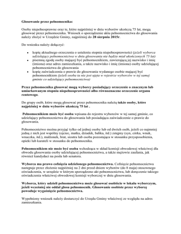Głosowanie przez pełnomocnika: Osoby niepełnosprawne oraz te, które najpóźniej w dniu wyborów ukończą 75 lat, mogą głosować przez pełnomocnika. Wniosek o sporządzenie aktu pełnomocnictwa do głosowania należy złożyć w Urzędzie Gminy, najpóźniej do 28 sierpnia 2015r. Do wniosku należy dołączyć: kopię aktualnego orzeczenia o ustaleniu stopnia niepełnosprawności (jeżeli wyborca udzielający pełnomocnictwa w dniu głosowania nie będzie miał ukończonych 75 lat) pisemną zgodę osoby mającej być pełnomocnikiem, zawierającą jej nazwisko i imię (imiona) oraz adres zamieszkania, a także nazwisko i imię (imiona) osoby udzielającej pełnomocnictwa do głosowania kopię zaświadczenia o prawie do głosowania wydanego osobie mającej być pełnomocnikiem (jeżeli osoba ta nie jest ujęta w rejestrze wyborców w tej samej gminie co udzielający pełnomocnictwa) Przez pełnomocnika głosować mogą wyborcy posiadający orzeczenie o znacznym lub umiarkowanym stopniu niepełnosprawności albo równoznaczne orzeczenie organu rentowego. Do grupy osób, które mogą głosować przez pełnomocnika należą także osoby, które najpóźniej w dniu wyborów ukończą 75 lat . Pełnomocnikiem może być osoba wpisana do rejestru wyborców w tej samej gminie, co udzielający pełnomocnictwa do głosowania lub posiadająca zaświadczenie o prawie do głosowania. Pełnomocnictwo można przyjąć tylko od jednej osoby lub od dwóch osób, jeżeli co najmniej jedną z nich jest wspólny (ojciec, matka, dziadek, babka, itd.) zstępny (syn, córka, wnuk, wnuczka, itd.), małżonek, brat, siostra lub osoba pozostająca w stosunku przysposobienia, opieki lub kurateli w stosunku do pełnomocnika. Pełnomocnikiem nie może być osoba wchodząca w skład komisji obwodowej właściwej dla obwodu głosowania osoby udzielającej pełnomocnictwa, a także mężowie zaufania, jak również kandydaci na posła lub senatora. Wyborca ma prawo cofnięcia udzielonego pełnomocnictwa. Cofnięcie pełnomocnictwa następuje przez złożenie najpóźniej na 2 dni przed dniem wyborów (do 8 maja) stosownego oświadczenia, w urzędzie w którym sporządzono akt pełnomocnictwa, lub doręczenie takiego oświadczenia właściwej obwodowej komisji wyborczej w dniu głosowania. Wyborca, który udzieli pełnomocnictwa może głosować osobiście w lokalu wyborczym, jeżeli wcześniej nie oddał głosu pełnomocnik. Głosowanie osobiste przez wyborcę powoduje wygaśnięcie pełnomocnictwa. Wypełniony wniosek należy dostarczyć do Urzędu Gminy właściwej ze względu na adres zamieszkania. Głosowanie korespondencyjne: Wyborca może głosować korespondencyjnie. Zamiar głosowania korespondencyjnego wyborca powinien zgłosić w Urzędzie Gminy, w której wpisany jest do rejestru wyborców do dnia 22 sierpnia 2015r. Zgłoszenie zamiaru głosowania korespondencyjnego może być dokonane: ustnie, pisemnie, telefaksem lub w formie elektronicznej. Zgłoszenie powinno zawierać: - nazwisko - imię (imiona), - imię ojca, - datę urodzenia, - numer ewidencyjny PESEL wyborcy, - oznaczenie wyborów, których dotyczy zgłoszenie - adres na który ma być wysłany pakiet wyborczy, albo deklarację osobistego odbioru pakietu wyborczego w urzędzie gminy - oświadczenie o wpisaniu wyborcy do rejestru wyborców w danej gminie, -prośbę o przesłania wraz z pakietem wyborczym nakładki na kartę do głosowania sporządzonej w alfabecie Braille’a, o ile wyborca sobie zażyczy, Doręczenie pakietu wyborczego: Wyborca, który zgłosił zamiar głosowania korespondencyjnego otrzymuje z urzędu pakiet wyborczy, nie później niż 7 dni przed dniem wyborów. Pakiet wyborczy jest doręczany do wyborcy wyłącznie do rąk własnych, po okazaniu dokumentu potwierdzającego tożsamość i pisemnym pokwitowaniu odbioru, chyba że zadeklarował osobisty odbiór pakietu w Urzędzie Gminy. W skład pakietu wyborczego wchodzą: koperta zwrotna, karta do głosowania, koperta na kartę do głosowania, instrukcja głosowania korespondencyjnego i nakładka na kartę do głosowania sporządzona w alfabecie Braille’a, o ile wyborca jej zażądał. Jak głosować: Na karcie do głosowania wyborca oddaje głos, zgodnie z informacją znajdującą się w dolnej części karty. Po oddaniu głosu kartę do głosowania wyborca umieszcza w kopercie oznaczonej "Koperta na kartę do głosowania", którą zakleja. Niezaklejenie koperty na kartę do głosowania spowoduje, że karta do głosowania nie będzie uwzględniona przy ustalaniu wyników głosowania. Zaklejoną kopertę należy włożyć do koperty zwrotnej zaadresowanej na adres obwodowej komisji wyborczej wraz z podpisanym oświadczeniem o osobistym i tajnym oddaniu głosu. Przed włożeniem oświadczenia do koperty zwrotnej należy wpisać na nim miejscowość i datę jego sporządzenia oraz własnoręcznie podpisać. Nie włożenie oświadczenia do koperty zwrotnej lub nie podpisanie go spowoduje, że karta do głosowania nie będzie uwzględniona przy ustalaniu wyników głosowania. Koperę zwrotną należy zakleić i nadać na adres obwodowej komisji wyborczej, Wyborca może przed dniem głosowania osobiście dostarczyć kopertę zwrotną do Urzędu Gminy ( w godzinach pracy urzędu) lub w dniu głosowania do czasu jego zakończenia osobiście dostarczyć kopertę zwrotną obwodowej komisji wyborczej, której adres znajduje się na kopercie zwrotnej. Zaświadczenie o prawie do głosowania: Wyborca, który będzie przebywał poza miejscem stałego zamieszkania w dniu wyborów ma możliwość pobrania specjalnego zaświadczenia o prawie do głosowani. Zaświadczenie wydawane jest w Urzędzie Gminy do dnia 4 września 2015r. Na podstawie zaświadczenia można zagłosować w każdym (również „swoim”) obwodzie do głosowania (lokalu wyborczym), utworzonym na terenie kraju i za granicą. Podczas głosowania należy okazać dokument tożsamości i oddać zaświadczenie członkow