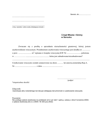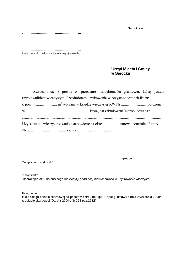 Serock, dn......................... ........................................................ ....................................................... ........................................................ ( imię, nazwisko i adres osoby składającej wniosek ) Urząd Miasta i Gminy w Serocku Zwracam się z prośbą o sprzedanie nieruchomości gruntowej, której jestem użytkownikiem wieczystym. Przedmiotem użytkowania wieczystego jest działka nr ............... o pow. ......................... m2 wpisana w księdze wieczystej KW Nr ........................... położona w ……………. ............................................. która jest zabudowana/niezabudowana* ..................................................................................................................................................... Użytkowanie wieczyste zostało ustanowione na okres ........... lat umową notarialną Rep.A. Nr ......................................... z dnia ....................................... .................................................................. /podpis/ *niepotrzebne skreślić Załącznik: -kserokopia aktu notarialnego lub decyzji oddającej nieruchomość w użytkowanie wieczyste. Pouczenie: Nie podlega opłacie skarbowej na podstawie art.2 ust.1pkt 1 ppkt.g ustawy z dnia 9 września 2000r. o opłacie skarbowej (Dz.U.z 2004r. Nr 253 poz.2532)