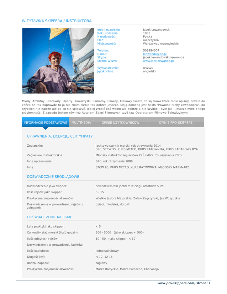 WIZYTóWKA SKIPPERA / INSTRUKTORA Imię i nazwisko: Rok urodzenia: Narodowość: Płeć: Miejscowość: Jacek Lewandowski 1983 Polska mężczyzna Warszawa / mazowieckie Telefon: E-mail: Skype: Strona WWW: 509284007 [email protected] jacek.lewandowski-leewanda www.jackleewanda.pl Wykształcenie: Języki obce: wyższe angielski Młody, Ambitny, Pracowity, Uparty, Towarzyski, Samotny, Dziwny, Ciekawy świata, to są słowa które mnie opisują prawie do końca bo tak naprawde to ja nie znam siebie tak dobrze jeszcze. Moją domeną jest hasło "Powolne ruchy zawodowca", do szybkich nie należe ale po co się spieszyć, lepiej zrobić coś wolno ale dobrze a nie szybko i byle jak i jeszcze mieć z tego przyjemność. Z zawodu jestem również Autorem Zdjęć Filmowych czyli tzw Operatorem Filmowo Telewizyjnym INFORMACJE PODSTAWOWE MULTIMEDIA OPINIE UŻYTKOWNIKÓW OPINIE PRO-SKIPPERS UPRAWNIENIA, LICENCJE, CERTYFIKATY Żeglarskie: Jachtowy sternik morski, rok otrzymania 2014 SRC, STCW 95. KURS METEO, KURS RATOWNIKA, KURS RADAROWY RYA Żeglarskie instruktorskie: Młodszy instruktor żeglarstwa PZŻ (MIŻ), rok uzyskania 2005 Inne uprawnienia: SRC, rok otrzymania 2009 Inne: STCW 95, KURS METEO, KURS RATOWNIKA, MŁODSZY MARYNARZ DOŚWIADCZNIE ŚRÓDLĄDOWE Doświadczenie jako skipper: dowodziłem/am jachtem w ciągu ostatnich 5 lat Ilość rejsów jako skipper: 5 - 15 Praktyczna znajomość akwenów: Wielkie Jeziora Mazurskie, Zalew Zegrzyński, Jez Wdzydzkie Doświadczenie w prowadzeniu rejsów z załogami: dzieci, młodzież, dorośli DOŚWIADCZENIE MORSKIE Lata praktyki jako skipper: <5 Całkowity staż morski (ilość godzin): 500 - 5000 (jako skipper: < 500) Ilość odbytych rejsów: 10 - 50 (jako skipper: < 10) Doświadczenie w prowadzeniu jachtów: Ilość kadłubów: jednokadłubowy Długość [m]: < 12, 12-16 Rodzaj napędu: żaglowy Praktyczna znajomość akwenów: Morze Bałtyckie, Morze Północne, Chorwacja www.pro-skippers.com, strona: 1 Doświadczenie w prowadzeniu rejsów z załogami: młodzież, dorośli DOŚWIADCZNIE SZKOLENIOWE Łączna ilość odbytych szkoleń w charakterze kadry instruktorskiej: 5 - 15 W tym w ostatnich 5 latach: 5 - 15 Pełnione funkcje szkoleniowe: instruktor, KWZ DOŚWIADCZENIE REGATOWE Brak danych www.pro-skippers.com, strona: 2