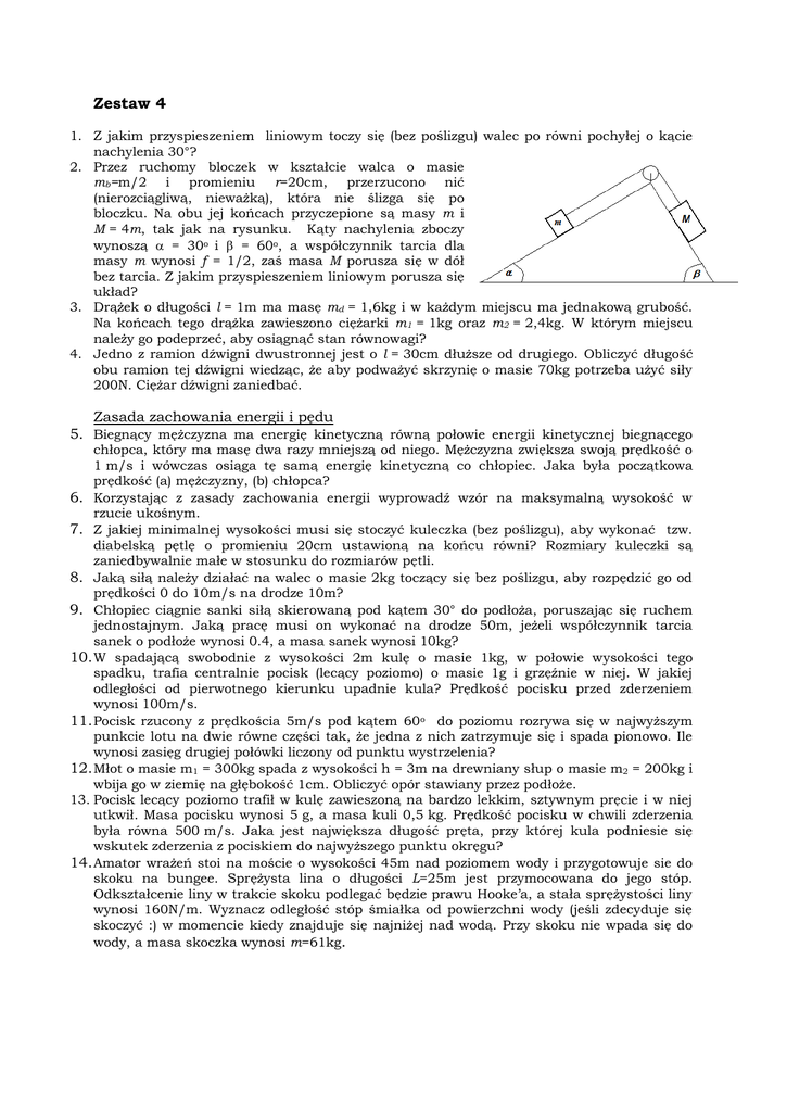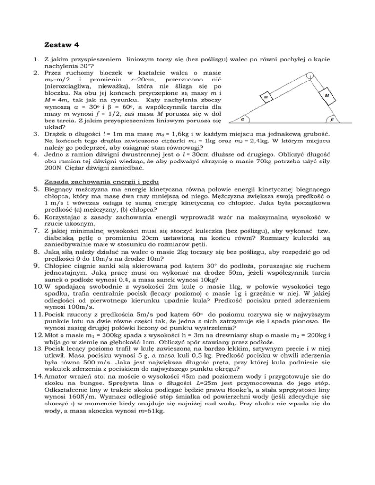 Zestaw 4 1. Z jakim przyspieszeniem liniowym toczy się (bez poślizgu) walec po równi pochyłej o kącie nachylenia 30°? 2. Przez ruchomy bloczek w kształcie walca o masie mb=m/2 i promieniu r=20cm, przerzucono nić (nierozciągliwą, nieważką), która nie ślizga się po bloczku. Na obu jej końcach przyczepione są masy m i M = 4m, tak jak na rysunku. Kąty nachylenia zboczy wynoszą = 30o i = 60o, a współczynnik tarcia dla masy m wynosi f = 1/2, zaś masa M porusza się w dół bez tarcia. Z jakim przyspieszeniem liniowym porusza się układ? 3. Drążek o długości l = 1m ma masę md = 1,6kg i w każdym miejscu ma jednakową grubość. Na końcach tego drążka zawieszono ciężarki m1 = 1kg oraz m2 = 2,4kg. W którym miejscu należy go podeprzeć, aby osiągnąć stan równowagi? 4. Jedno z ramion dźwigni dwustronnej jest o l = 30cm dłuższe od drugiego. Obliczyć długość obu ramion tej dźwigni wiedząc, że aby podważyć skrzynię o masie 70kg potrzeba użyć siły 200N. Ciężar dźwigni zaniedbać. Zasada zachowania energii i pędu 5. Biegnący mężczyzna ma energię kinetyczną równą połowie energii kinetycznej biegnącego chłopca, który ma masę dwa razy mniejszą od niego. Mężczyzna zwiększa swoją prędkość o 1 m/s i wówczas osiąga tę samą energię kinetyczną co chłopiec. Jaka była początkowa prędkość (a) mężczyzny, (b) chłopca? 6. Korzystając z zasady zachowania energii wyprowadź wzór na maksymalną wysokość w rzucie ukośnym. 7. Z jakiej minimalnej wysokości musi się stoczyć kuleczka (bez poślizgu), aby wykonać tzw. diabelską pętlę o promieniu 20cm ustawioną na końcu równi? Rozmiary kuleczki są zaniedbywalnie małe w stosunku do rozmiarów pętli. 8. Jaką siłą należy działać na walec o masie 2kg toczący się bez poślizgu, aby rozpędzić go od prędkości 0 do 10m/s na drodze 10m? 9. Chłopiec ciągnie sanki siłą skierowaną pod kątem 30° do podłoża, poruszając się ruchem jednostajnym. Jaką pracę musi on wykonać na drodze 50m, jeżeli współczynnik tarcia sanek o podłoże wynosi 0.4, a masa sanek wynosi 10kg? 10. W spadającą swobodnie z wysokości 2m kulę o masie 1kg, w połowie wysokości tego spadku, trafia centralnie pocisk (lecący poziomo) o masie 1g i grzęźnie w niej. W jakiej odległości od pierwotnego kierunku upadnie kula? Prędkość pocisku przed zderzeniem wynosi 100m/s. 11. Pocisk rzucony z prędkościa 5m/s pod kątem 60o do poziomu rozrywa się w najwyższym punkcie lotu na dwie równe części tak, że jedna z nich zatrzymuje się i spada pionowo. Ile wynosi zasięg drugiej połówki liczony od punktu wystrzelenia? 12. Młot o masie m1 = 300kg spada z wysokości h = 3m na drewniany słup o masie m2 = 200kg i wbija go w ziemię na głębokość 1cm. Obliczyć opór stawiany przez podłoże. 13. Pocisk lecący poziomo trafił w kulę zawieszoną na bardzo lekkim, sztywnym pręcie i w niej utkwił. Masa pocisku wynosi 5 g, a masa kuli 0,5 kg. Prędkość pocisku w chwili zderzenia była równa 500 m/s. Jaka jest największa długość pręta, przy której kula podniesie się wskutek zderzenia z pociskiem do najwyższego punktu okręgu? 14. Amator wrażeń stoi na moście o wysokości 45m nad poziomem wody i przygotowuje sie do skoku na bungee. Sprężysta lina o długości L=25m jest przymocowana do jego stóp. Odkształcenie liny w trakcie skoku podlegać będzie prawu Hooke’a, a stała sprężystości liny wynosi 160N/m. Wyznacz odległość stóp śmiałka od powierzchni wody (jeśli zdecyduje się skoczyć :) w momencie kiedy znajduje się najniżej nad wodą. Przy skoku nie wpada się do wody, a masa skoczka wynosi m=61kg.