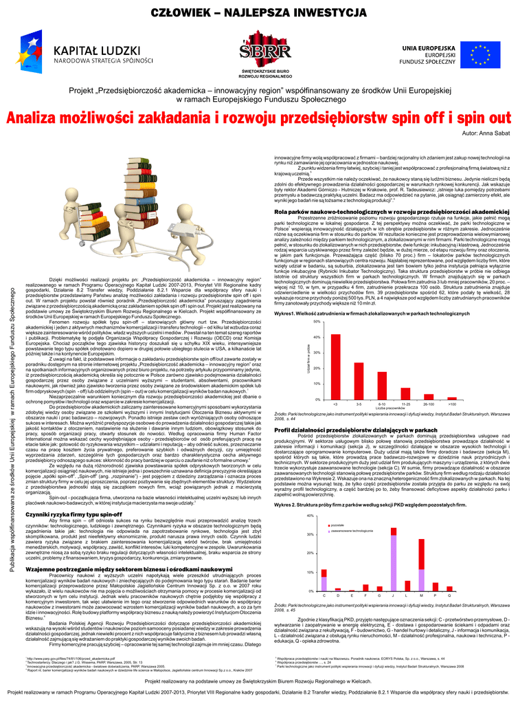 CZ£OWIEK – NAJLEPSZA INWESTYCJA ŒWIÊTOKRZYSKIE BIURO ROZWOJU REGIONALNEGO Projekt „Przedsiêbiorczoœæ akademicka – innowacyjny region” wspó³finansowany ze œrodków Unii Europejskiej w ramach Europejskiego Funduszu Spo³ecznego Analiza mo¿liwoœci zak³adania i rozwoju przedsiêbiorstw spin off i spin out Autor: Anna Sabat innowacyjne firmy wol¹ wspó³pracowaæ z firmami – bardziej racjonalny ich zdaniem jest zakup nowej technologii na rynku ni¿ zamawianie jej opracowania w jednostce naukowej. Z punktu widzenia firmy ³atwiej, szybciej i taniej jest wspó³pracowaæ z profesjonaln¹ firm¹ œwiatow¹ ni¿ z 5 krajow¹ uczelni¹. Przede wszystkim nie nale¿y oczekiwaæ, ¿e naukowcy stan¹ siê ludŸmi biznesu. Jedynie nieliczni bêd¹ zdolni do efektywnego prowadzenia dzia³alnoœci gospodarczej w warunkach rynkowej konkurencji. Jak wskazuje by³y rektor Akademii Górniczo - Hutniczej w Krakowie, prof. R. Tadeusiewicz: „istnieje luka pomiêdzy potrzebami przemys³u a badawcz¹ praktyk¹ uczelni. Badacz ma odpowiedzieæ na pytanie, jak osi¹gn¹æ zamierzony efekt, ale 6 wyniki jego badañ nie s¹ to¿same z technologi¹ produkcji”. Dziêki mo¿liwoœci realizacji projektu pn: „Przedsiêbiorczoœæ akademicka – innowacyjny region” realizowanego w ramach Programu Operacyjnego Kapita³ Ludzki 2007-2013, Priorytet VIII Regionalne kadry gospodarki, Dzia³anie 8.2 Transfer wiedzy, Poddzia³anie 8.2.1 Wsparcie dla wspó³pracy sfery nauki i przedsiêbiorstw przedstawiamy Pañstwu analizê mo¿liwoœci zak³adania i rozwoju przedsiêbiorstw spin off i spin out. W ramach projektu powsta³ równie¿ poradnik „Przedsiêbiorczoœæ akademicka” poruszaj¹cy zagadnienia zwi¹zane z przedsiêbiorczoœci¹ akademick¹ oraz zak³adaniem spó³ek spin off i spin out. Projekt jest realizowany na podstawie umowy ze Œwiêtokrzyskim Biurem Rozwoju Regionalnego w Kielcach. Projekt wspó³finansowany ze œrodków Unii Europejskiej w ramach Europejskiego Funduszu Spo³ecznego. Fenomen rozwoju spó³ek typu spin-off – stanowi¹cych g³ówny nurt tzw. Przedsiêbiorczoœci akademickiej i jeden z aktywnych mechanizmów komercjalizacji i transferu technologii – od kilku lat wzbudza coraz wiêksze zainteresowanie wœród polityków, w³adz wy¿szych uczelni i mediów . Powsta³ na ten temat szereg raportów i publikacji. Problematykê tê podjê³a Organizacja Wspó³pracy Gospodarczej i Rozwoju (OECD) oraz Komisja Europejska. Chocia¿ pocz¹tków tego zjawiska historycy doszukali siê u schy³ku XIX wieku, intensywniejsze powstawanie tego typu spó³ek odnotowano dopiero w drugiej po³owie ubieg³ego stulecia w USA, a kilkanaœcie lat póŸniej tak¿e i na kontynencie Europejskim. Z uwagi na fakt, i¿ podstawowe informacje o zak³adaniu przedsiêbiorstw spin off/out zawarte zosta³y w poradniku dostêpnym na stronie internetowej projektu „Przedsiêbiorczoœæ akademicka – innowacyjny region” oraz na spotkaniach informacyjnych organizowanych przez biuro projektu, na potrzeby artyku³u przypominamy jedynie, i¿ przedsiêbiorczoœci¹ akademick¹ okreœla siê potocznie w Polsce zarówno zjawisko podejmowania dzia³alnoœci gospodarczej przez osoby zwi¹zane z uczelniami wy¿szymi – studentami, absolwentami, pracownikami naukowymi, jak równie¿ jako zjawisko tworzenia przez osoby zwi¹zane ze œrodowiskiem akademickim spó³ek lub 1 firm odpryskowych (spin - off) lub oddzielnych (spin – out) w celu komercjalizacji wyników badan naukowych. Niezaprzeczalnie warunkiem koniecznym dla rozwoju przedsiêbiorczoœci akademickiej jest dbanie o ochronê pomys³ów i technologii oraz wsparcie w zakresie komercjalizacji. Do przedsiêbiorców akademickich zaliczamy zainteresowane komercyjnymi sposobami wykorzystania zdobytej wiedzy osoby zwi¹zane ze szko³ami wy¿szymi i innymi Instytucjami Otoczenia Biznesu aktywnymi w obszarze nauki i prac badawczo – rozwojowych. Ponadto istnieje zestaw cech wyró¿niaj¹cych osoby odnosz¹ce sukces w interesach. Mo¿na wyró¿niæ predyspozycje osobowe do prowadzenia dzia³alnoœci gospodarczej takie jak jakoœæ kontaktów z otoczeniem, nastawienie na s³u¿enie i dawanie innym ludziom, obowi¹zkowy stosunek do pracy, sposób organizacji pracy, otwarty stosunek do nowoœci. Wed³ug opracowania firmy Human Factor International mo¿na wskazaæ cechy wyodrêbniaj¹ce osoby - przedsiêbiorców od osób preferuj¹cych pracê na etacie takie jak: gotowoœæ do ryzykowania wszystkim – udzia³ami i reputacj¹ – aby odnieœæ sukces, przeznaczanie czasu na pracê kosztem ¿ycia prywatnego, preferowanie szybkich i odwa¿nych decyzji, czy umiejêtnoœæ wyprzedzania zdarzeñ, szczególnie tych gospodarczych oraz bardzo charakterystyczna cecha aktywnego 2 przedsiêbiorcy odnosz¹cego sukces: sk³onnoœæ do pracy bardziej w oparciu o zaufanie ni¿ o formalne umowy. Ze wzglêdu na du¿¹ ró¿norodnoœæ zjawiska powstawania spó³ek odpryskowych tworzonych w celu komercjalizacji osi¹gniêæ naukowych, nie istnieje jedna i powszechnie uznawana definicja precyzyjnie okreœlaj¹ca pojêcie „spó³ki spin-off”. „Spin-off” (ang. „rozpinanie”) - jest pojêciem z dziedziny zarz¹dzania i oznacza proces zmian struktury firmy w celu jej uproszczenia, poprzez pozbywanie siê zbêdnych elementów struktury. Wydzielone z przedsiêbiorstwa jednostki staj¹ siê zacz¹tkiem nowych firm, wci¹¿ powi¹zanych jednak z macierzyst¹ organizacj¹. Spin-out - pocz¹tkuj¹ca firma, utworzona na bazie w³asnoœci intelektualnej uczelni wy¿szej lub innych 3 placówek naukowo-badawczych, w której instytucja macierzysta ma swoje udzia³y. Przestrzenne zró¿nicowanie poziomu rozwoju gospodarczego rzutuje na funkcje, jakie pe³niæ mog¹ parki technologiczne w lokalnej gospodarce. Z tej perspektywy mo¿na oczekiwaæ, ¿e parki technologiczne w 7 Polsce wspieraj¹ innowacyjnoœæ dzia³aj¹cych w ich obrêbie przedsiêbiorstw w ró¿nym zakresie. Jednoczeœnie 
