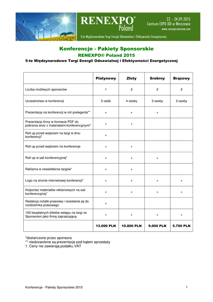 Konferencje - Pakiety Sponsorskie RENEXPO® Poland 2015 5-te Międzynarodowe Targi Energii Odnawialnej i Efektywności Energetycznej Platynowy Złoty Srebrny Brązowy 1 2 2 2 5 osób 4 osoby 3 osoby 2 osoby Prezentacja na konferencji w roli prelegenta** + + + Prezentacja firmy w formacie PDF do pobrania wraz z materiałami konferencyjnymi* + + Roll up przed wejściem na targi w dniu konferencji* + Roll up przed wejściem na konferencje + + Roll up w sali konferencyjnej* + + Reklama w newsletterze targów* + + Logo na stronie internetowej konferencji* + + + + Kolportaż materiałów reklamowych na sali konferencyjnej* + + + + Redakcja notatki prasowej i rozesłanie jej do rozdzielnika prasowego + 100 bezpłatnych biletów wstępu na targi ze Sponsorem jako firmą zapraszającą + + + + 13.000 PLN 10.800 PLN 9.000 PLN 5.700 PLN Liczba możliwych sponsorów Uczestnictwo w konferencji + *dostarczone przez sponsora ** niedozwolone są prezentacje pod kątem sprzedaży 1. Ceny nie zawierają podatku VAT Konferencje - Pakiety Sponsorskie 2015 1 Dodatkowe możliwosci sponsoringu Przerwa obiadowa, 2 przerwy kawowe 2 przerwy kawowe Get-Together, spotkanie towarzyskie po konferencji - rozpoznawalność Sponsora poprzez banner, roll up albo plakat w dziale gastronomicznym, logo na serwetkach itp. * - logo na stronie internetowej i w programie konferencji - rozpoznawalność Sponsora poprzez banner, roll up albo plakat w dziale gastronomicznym, logo na serwetkach itp. * - logo na stronie internetowej i w programie konferencji - rozpoznawalność Sponsora poprzez banner, roll up albo plakat w dziale gastronomicznym, logo na serwetkach itp. * - logo na stronie internetowej i w programie konferencji 14.000 PLN 8.000 PLN 9.400 PLN *dostarczone przez sponsora Proszę zakreślić wybrany przez Państwa pakiet sponsorski Platynowy Pakiet Sponsorski 13.000 PLN Złoty Pakiet Sponsorski 10.800 PLN Srebrny Pakiet Sponsorski 9.000 PLN Brązowy Pakiet Sponsorski 5.700 PLN Dodatkowe możliwości Sponsoringu (proszę zakreślić) Przerwa obiadowa, 2 przerwy kawowe 14.000 PLN 2 przerwy kawowe 8.000 PLN Get-Together, spotkanie towarzyskie po konferencji 9.400 PLN Konferencje - Pakiety Sponsorskie 2015 2 Dane kontaktowe: Nazwa Firmy: ........................................................................................................................................... Dział: ........................................................................................................................................................ Ulica/skrytka pocztowa: ......................................................................................................................... Kraj/kod pocztowy/miejscowość: ......................................................................................................... Numer telefonu: ...................................................................................................................................... Fax:........................................................................................................................................................... Email: .............................................@...................................................................................................... Strona internetowa: ................................................................................................................................ NIP: ........................................................................................................................................................... 1. Ceny nie zawierają podatku VAT Dyrektor/Prezes: ..................................................................................................................................... Tel.: .......................................................................................................................................................... Fax: .......................................................................................................................................................... Email: ......................................................@.............................................................................................. Osoba kontaktowa w kwestii sponsoringu: ......................................................................................... Tel.: .......................................................................................................................................................... Numer komórkowy: ................................................................................................................................ Fax: .......................................................................................................................................................... Email: .......................................................@............................................................................................. Proszę przygotować mi indywidualny pakiet sponsorski, w tym celu proszę o kontakt. Niniejszym zamawiam wybrany/e pakiet/y sponsorski/e. Pakiety sponsorskie nie zawierają kosztów produkcji materiałów reklamowych. Przyznanie i wyrażenie ugody na sponsoring następuje po sprawdzeniu możliwości sponsoringu. Odpowiednie warunki handlowe, które są częścią umowy są mi znane i akceptuje je. Aby umowa była ważna wymagana jest zgoda Organizatora. Miejscowość, data: ........................................................... Prawnie wiążący podpis: .......................... Pieczątka: Wypełniony formularz prosze wysłać na adres email [email protected] lub faxem na numer +48 (0)22-379-78-60. Konferencje - Pakiety Sponsorskie 2015 3