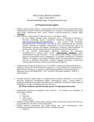POLITYKA PRYWATNOŚCI z dnia 10.02 2015 r. Portalu Internetowego Twoja-pozyczka.com §1 Postanowienia ogólne 1. Polityka określa zasady ochrony i przetwarzania Danych Osobowych Użytkowników przez Administratora Danych Osobowych (Usługodawcę) w związku ze świadczeniem przez niego usług drogą elektroniczną przy użyciu Portalu Twoja-Pozyczak.com zwanego dalej: „Portalem”. 2. Dane osobowe Użytkowników Portalu używane są w dwojakich celach: a. W celu nadania dalszego biegu złożonemu przez Użytkownika Wnioskowi o Pożyczkę, składanego poprzez wypełnienie formularza, dostępnego na stronie: http://twoja-pozyczka.com/wniosek.php - dane osobowe będą przekazane Pożyczkodawcom. Przetwarzanie tych danych przez Administratora ma charakter doraźny, wyłącznie ze względów technicznych, a po ich wykorzystaniu dane te są niezwłocznie usuwane lub poddane anonimizacji. Wyłączną odpowiedzialność za przetwarzanie danych Użytkownika po ich przekazaniu ponosi Pożyczkodawca. b. W celu wysyłki Użytkownikom informacji handlowej lub materiałów marketingowych, zwanymi dalej łącznie „Informacjami Handlową” przez Administratora lub jego Partnerów – w tym zakresie dane osobowe Użytkowników mogą być przetwarzane przez Usługodawcę, na zasadach określonych w niniejszej Polityce. W związku z tym niniejsza Polityka odnosi się do przetwarzania danych w tym celu, a określenie „korzystanie z Portalu” obejmuje korzystanie z niego przez Użytkownika na potrzeby otrzymywania Informacji Handlowej. 3. Administratorem Danych Osobowych jest: NA2 spółka z ograniczoną odpowiedzialnością z siedzibą w Warszawie, 00-807 Warszawa, Equator II - Al. Jerozolimskie 96, zarejestrowana w Sądzie Rejonowym dla m. st. Warszawy, XII Wydział Gospodarczy Krajowego Rejestru Sądowego, pod nr KRS 0000529281, NIP: 701-044-67-06 kapitał zakładowy: 5000 zł, w całości pokryty 4. Wszelkie zdarzenia mające wpływ na bezpieczeństwo przekazu informacji, w tym również dotyczące podejrzenia udostępniania plików zawierających wirusy i innych plików o podobnym charakterze lub innych aniżeli pliki treści o podobnym charakterze, należy zgłaszać Usługodawcy na adres: [email protected] §2 Dane osobowe przetwarzane przez Twoja-pozyczka.com 1. Administrator przetwarza następujące dane osobowe – ich podanie jest niezbędne do korzystania z Portalu; Imię Nazwisko Adres e-mail Numer telefonu 2. Każdemu Użytkownikowi Portal nadaje unikalny numer Użytkownika (numer ID), który jest przyporządkowany do adresu e-mail Użytkownika. 3. Ponadto możemy przetwarzać (jak każdy Portal) tzw. dane eksploatacyjne, które charakteryzują sposób korzystania przez Ciebie z Portalu, takie jak: a. Adres IP; b. c. d. e. f. Logi cyfrowe; Informację o skorzystaniu z Ciebie z Portalu Typ przeglądarki; Nazwa domeny; Typ systemu operacyjnego. §3 Zgoda na otrzymywanie informacji handlowej 1. Użytkownik może wyrazić zgodę na otrzymywanie od Portalu Informacji Handlowej. Te informacje handlowe będą wysyłane na adres e-mail Użytkownika. Użytkownik może w każdym czasie odwołać tę zgodę poprzez wysłanie do Portalu wiadomości a email:[email protected] lub poprzez kliknięcie pod otrzymaną mailem z otrzymywaną informacją handlową. 2. Zgoda, o której mowa w ust. 1, jest wyrażana odrębnie od akceptacji Regulaminu korzystania z Portalu twoja-pozyczka.com §4 W jakich celach są przetwarzane moje dane osobowe? Twoje dane osobowe będą przetwarzane w celu wysyłania Ci informacji handlowej przez nas oraz podmioty z Nami współpracujące. §5 Kto może mieć dostęp do moich danych osobowych? 1. Dostęp do Twoich Danych Osobowych mają: o Administrator o Jego pracownicy lub osoby świadczące usługi na jego rzecz związane z Portalem (np. programiści, informatycy, administratorzy bezpieczeństwa, podmiot administrujący i konserwujący system) – w zakresie określonym przez Administratora; o Organy państwa na potrzeby prowadzone przez nich postępowań, jeżeli organy te są do tego uprawnione na podstawie odrębnych przepisów (np. prokuratura, sąd, Policja, Rzecznik Praw Obywatelskich) oraz w innych sytuacjach, gdy zobowiązują Nas do tego bezwzględnie obowiązujące przepisy prawa; o Podmiot obsługujący serwer – OVH spółka z ograniczoną odpowiedzialnością 2. Użytkownicy zobowiązani są nie ujawniać osobom trzecim informacji dotyczących innych Użytkowników, które otrzymali w ramach działania Portalu (w tym także ich Danych Osobowych), chyba że uzyskali zgodę od Użytkownika, którego dane dotyczą. Usługodawca zwraca uwagę, że przetwarzanie (w tym udostępnianie) przez Użytkownika w Portalu danych osobowych innych osób, niestanowiące przetwarzania wyłącznie w celach osobistych lub domowych, może wiązać się z obowiązkiem spełnienia przez Użytkownika obowiązków wynikających z ustawy o ochronie danych osobowych. §6 Czy moje Dane Osobowe są bezpieczne? Tak, Twoje Dane Osobowe są należycie zabezpieczone. Serwer dedykowany, na którym znajduje się Portal jest wydzierżawiany przez OVH spółkę z ograniczoną odpowiedzialnością ul. Karola Miarki 610, lok. 3-4 we Wrocławiu, KRS Numer 0000 2202 86. Serwer ten znajduje się pod adresem SAS OVH 2, rue Kellerman 59 100 Roubaix, Francja . 2 OVH stosuje następujące środki ochrony danych osobowych Środki ochrony fizycznej - Zbiór Danych Osobowych przechowywany jest w pomieszczeniu zabezpieczonym drzwiami o podwyższonej odporności na włamanie – drzwi klasy C; - Pomieszczenia, w których przetwarzany jest Zbiór Danych Osobowych wyposażone są w system alarmowy przeciwwłamaniowy; - Dostęp do pomieszczeń, w których przetwarzany jest Zbiór Danych Osobowych, objęte są systemem kontroli dostępu – urządzenia SAGEM MophoAccess; - Dostęp do pomieszczeń, w których przetwarzany jest Zbiór Danych Osobowych, kontrolowany jest przez system monitoringu z zastosowaniem ka