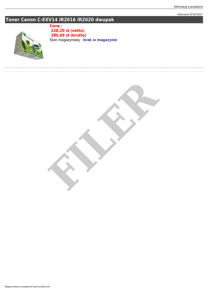 Informacje o produkcie Utworzono 07-03-2017 Toner Canon C-EXV14 IR2016 IR2020 dwupak Cena : 228,20 zł (netto) 280,69 zł (brutto) FI LE R Stan magazynowy : brak w magazynie Wygenerowano w programie www.oscGold.com