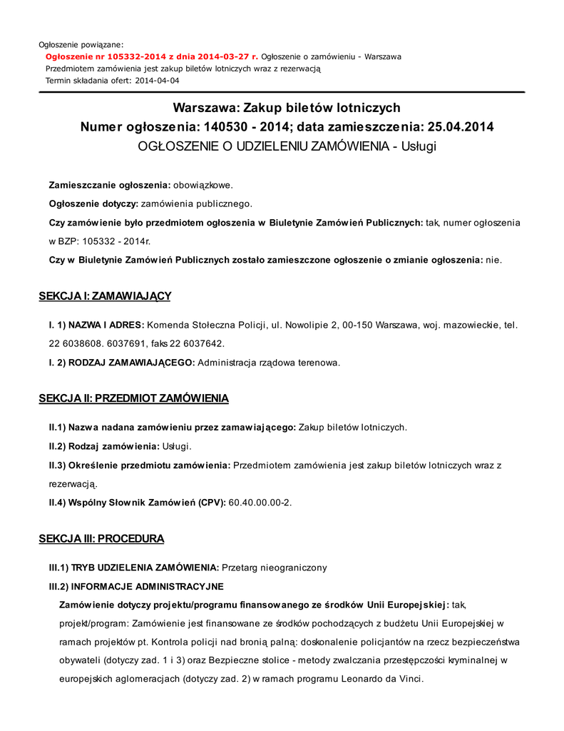Ogłoszenie powiązane: Ogłoszenie nr 105332-2014 z dnia 2014-03-27 r. Ogłoszenie o zamówieniu - Warszawa Przedmiotem zamówienia jest zakup biletów lotniczych wraz z rezerwacją Termin składania ofert: 2014-04-04 Warszawa: Zakup biletów lotniczych Numer ogłoszenia: 140530 - 2014; data zamieszczenia: 25.04.2014 OGŁOSZENIE O UDZIELENIU ZAMÓWIENIA - Usługi Zamieszczanie ogłoszenia: obowiązkowe. Ogłoszenie dotyczy: zamówienia publicznego. Czy zamów ienie było przedmiotem ogłoszenia w Biuletynie Zamów ień Publicznych: tak, numer ogłoszenia w BZP: 105332 - 2014r. Czy w Biuletynie Zamów ień Publicznych zostało zamieszczone ogłoszenie o zmianie ogłoszenia: nie. SEKCJA I: ZAMAWIAJĄCY I. 1) NAZWA I ADRES: Komenda Stołeczna Policji, ul. Nowolipie 2, 00-150 Warszawa, woj. mazowieckie, tel. 22 6038608. 6037691, faks 22 6037642. I. 2) RODZAJ ZAMAWIAJĄCEGO: Administracja rządowa terenowa. SEKCJA II: PRZEDMIOT ZAMÓWIENIA II.1) Nazw a nadana zamów ieniu przez zamaw iaj ącego: Zakup biletów lotniczych. II.2) Rodzaj zamów ienia: Usługi. II.3) Określenie przedmiotu zamów ienia: Przedmiotem zamówienia jest zakup biletów lotniczych wraz z rezerwacją. II.4) Wspólny Słow nik Zamów ień (CPV): 60.40.00.00-2. SEKCJA III: PROCEDURA III.1) TRYB UDZIELENIA ZAMÓWIENIA: Przetarg nieograniczony III.2) INFORMACJE ADMINISTRACYJNE Zamów ienie dotyczy proj ektu/programu finansow anego ze środków Unii Europej skiej : tak, projekt/program: Zamówienie jest finansowane ze środków pochodzących z budżetu Unii Europejskiej w ramach projektów pt. Kontrola policji nad bronią palną: doskonalenie policjantów na rzecz bezpieczeństwa obywateli (dotyczy zad. 1 i 3) oraz Bezpieczne stolice - metody zwalczania przestępczości kryminalnej w europejskich aglomeracjach (dotyczy zad. 2) w ramach programu Leonardo da Vinci. SEKCJA IV: UDZIELENIE ZAMÓWIENIA Część NR: 1 Nazw a: Zakup biletów lotniczych na trasie Warszawa-Madryt-W15.04.2014arszawa IV.1) DATA UDZIELENIA ZAMÓWIENIA: 15.04.2014. IV.2) LICZBA OTRZYMANYCH OFERT: 2. IV.3) LICZBA ODRZUCONYCH OFERT: 0. IV.4) NAZWA I ADRES WYKONAWCY, KTÓREMU UDZIELONO ZAMÓWIENIA: DELTA TOUR Sp. z o.o., ul. Czerska 18, 00-732 Warszawa, kraj/woj. mazowieckie. IV.5) Szacunkow a w artość zamów ienia (bez VAT): 11000,00 PLN. IV.6) INFORMACJA O CENIE WYBRANEJ OFERTY ORAZ O OFERTACH Z NAJNIŻSZĄ I NAJWYŻSZĄ CENĄ Cena w ybranej oferty: 8976,00 Oferta z naj niższą ceną: 8976,00 / Oferta z naj w yższą ceną: 10618,80 Waluta: PLN. Część NR: 2 Nazw a: Zakup biletów lotniczych na trasie Warszawa - Praga - Warszawa IV.1) DATA UDZIELENIA ZAMÓWIENIA: 15.04.2014. IV.2) LICZBA OTRZYMANYCH OFERT: 2. IV.3) LICZBA ODRZUCONYCH OFERT: 0. IV.4) NAZWA I ADRES WYKONAWCY, KTÓREMU UDZIELONO ZAMÓWIENIA: DELTA TOUR Sp. z o.o., ul. Czerska 18, 00-732 Warszawa, kraj/woj. mazowieckie. IV.5) Szacunkow a w artość zamów ienia (bez VAT): 11000,00 PLN. IV.6) INFORMACJA O CENIE WYBRANEJ OFERTY ORAZ O OFERTACH Z NAJNIŻSZĄ I NAJWYŻSZĄ CENĄ Cena w ybranej oferty: 8600,00 Oferta z naj niższą ceną: 8600,00 / Oferta z naj w yższą ceną: 10800,00 Waluta: PLN. Część NR: 3 Nazw a: Zakup biletów lotniczych na trasie Warszawa - Tallin - Warszawa IV.1) DATA UDZIELENIA ZAMÓWIENIA: 23.04.2014. IV.2) LICZBA OTRZYMANYCH OFERT: 2. IV.3) LICZBA ODRZUCONYCH OFERT: 0. IV.4) NAZWA I ADRES WYKONAWCY, KTÓREMU UDZIELONO ZAMÓWIENIA: TOP PODRÓŻE Ewa Koś, Plac Zbawiciela 1, 70-233 Szczecin, kraj/woj. zachodniopomorskie. IV.5) Szacunkow a w artość zamów ienia (bez VAT): 7800,00 PLN. IV.6) INFORMACJA O CENIE WYBRANEJ OFERTY ORAZ O OFERTACH Z NAJNIŻSZĄ I NAJWYŻSZĄ CENĄ Cena w ybranej oferty: 7075,08 Oferta z naj niższą ceną: 7075,08 / Oferta z naj w yższą ceną: 8190,00 Waluta: PLN.