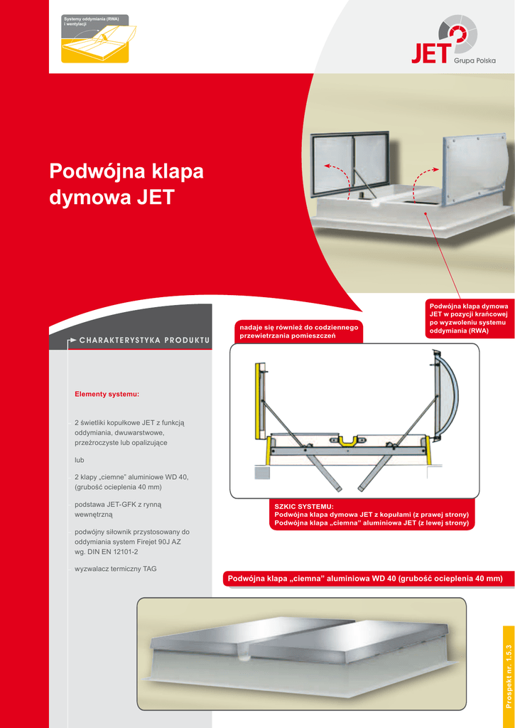Systemy oddymiania (RWA) i wentylacji Podwójna klapa dymowa JET CHARAKTERYSTYKA PRODUKTU nadaje się również do codziennego przewietrzania pomieszczeń Podwójna klapa dymowa JET w pozycji krańcowej po wyzwoleniu systemu oddymiania (RWA) Elementy systemu: świetliki kopułkowe JET z funkcją 2 oddymiania, dwuwarstwowe, przeźroczyste lub opalizujące lub 2 klapy „ciemne” aluminiowe WD 40, (grubość ocieplenia 40 mm) podstawa JET-GFK z rynną wewnętrzną odwójny siłownik przystosowany do p oddymiania system Firejet 90J AZ wg. DIN EN 12101-2 w yzwalacz termiczny TAG SZKIC SYSTEMU: Podwójna klapa dymowa JET z kopułami (z prawej strony) Podwójna klapa „ciemna” aluminiowa JET (z lewej strony) Podwójna klapa „ciemna” aluminiowa WD 40 (grubość ocieplenia 40 mm) Prospekt nr. 1.5.3 BUDOWNICTWO PRZEMYSŁOWE ARCHITEKTURA TECHNIKA ODDYMIANIA (RWA) I SERWIS Wielkości i wartości A a podwójnych klap dymowych JET cm x cm wartość A a bez spoilerów klapami „ciemnymi” kopułami aluminiowymi dwuwarstwowymi WD 40 m² 150 x 250 2,438 180 x 240 2,800 180 x 250 2,925 200 x 250 3,250 250 x 250 4,063* • • • • • • • • • • opcje podstaw obwodowy kołnierz z żywicy poliestrowej łącznik z PVC • • • • • • • • • • „ciepła“ stopa podstawy • • • • • * ze spojlerami Zalety podwójnych klap dymowych JET 1 2 3 Wydajne urządzenie systemu oddymiania dla ochrony przeciwpożarowej, stosowane w obiektach, gdzie dużą rolę odgrywa naturalna wentylacja. Po otwarciu klap na 90º osiągana jest maksymalna powierzchnia przewietrzania. Przy jednoczesnym uruchomieniu systemów dopowietrzania (np. wywietrzaków grawitacyjnych JET) następuje skuteczne dopowietrzenie i / lub oddymianie. 4 Po uruchomieniu systemu oddymiania klapy można ponownie zamknąć przy pomocy ładunku CO2 ze skrzynki alarmowej (tylko opcja dwubutlowa otwarcie / zamknięcie). 5 Działanie urządzeń można w każdej chwili sprawdzić przy pomocy centrali 6 Naturalne oświetlenie przez zastosowanie świetlików kopułkowych. przewietrzania. JET Grupa Polska Sp. z o.o. JET Grupa Polska Sp. z o.o. ul. Kaliska 38 PL 62-300 Września Tel. +48 (0) 61 / 640 34-10 Faks +48 (0) 61 / 640 34-11 www.jet-polska.pl [email protected] ŚWIETLIKI KOPUŁKOWE ~ PASMA ŚWIETLNE ~ SYSTEMY ODDYMIANIA ~ SPECJALNE KONSTRUKCJE ZE SZKŁA I GRILLODURU ® ~ WYWIETRZAKI GRAWITACYJNE Obowiązuje od daty wydania aż do nowego nakładu. Stan: styczeń 2009 r. Za błędy w druku, pomyłki i zmiany techniczne nie ponosimy odpowiedzialności. wymiary do zamówienia otwór w świele komletne urządzenia z podstawą JET-GFK 40 cm, z płaską stopą podstawy i z