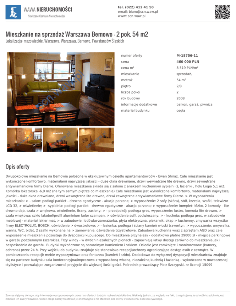 tel. (022) 412 41 50 email: [email protected] www: scn.waw.pl Mieszkanie na sprzedaż Warszawa Bemowo - 2 pok. 54 m2 Lokalizacja: mazowieckie, Warszawa, Warszawa, Bemowo, Powstanców Śląskich numer oferty M-18756-11 cena 460 000 PLN cena m 8 519 PLN/m2 mieszkanie sprzedaż, metraż 54 m2 piętro 2/8 liczba pokoi 2 rok budowy 2008 informacje dodatkowe balkon, garaż, piwnica materiał budynku cegła 2 Opis oferty Dwupokojowe mieszkanie na Bemowie położone w ekskluzywnym osiedlu apartamentowców - Ewen Shiraz. Całe mieszkanie jest wykończone komfortowo, materiałami najwyższej jakości - duże okna drewniane, drzwi wewnętrzne lite drewno, drzwi zewnętrzne antywłamaniowe firmy Dierre. Oferowane mieszkanie składa się z salonu z aneksem kuchennym sypialni (), łazienki , holu Logia 5,1 m2. Komórka lokatorska -6,9 m2 (na tym samym piętrze co mieszkanie) Całe mieszkanie jest wykończone komfortowo, materiałami najwyższej jakości - duże okna drewniane, drzwi wewnętrzne lite drewno, drzwi zewnętrzne antywłamaniowe firmy Dierre. > W wyposażeniu mieszkania: > - salon: podłogi parkiet - drewno egzotyczne - akacja parzona; > wyposażenie: 2 sofy (skóra), stół, krzesła, szafki, telewizor LCD 32, > oświetlenie; > -sypialnia: podłogi parkiet - drewno egzotyczne - akacja parzona; > wyposażenie: komplet: łóżko, 2 komody - lite drewno dąb, szafa > wnękowa, oświetlenie, firany, zasłony; > - przedpokój: podłoga gres, wyposażenie: lustro, komoda lite drewno, > szafa wnękowa: szkło lakobel/profil aluminium kolor szampan, > oświetlenie sufit podwieszany; > - kuchnia: podłoga gres, w zabudowie meblowej - materiał lakier mat, > w zabudowie: lodówko-zamrażarka, płyta elektryczna, piekarnik, okap > kuchenny, zmywarka wszystko firmy ELECTROLUX, BOSCH, oświetlenie > dwustrefowe; > - łazienka: podłoga i ściany kamień włoski trawertyn, > wyposażenie: umywalka, wanna, WC, bidet, 2 szafki wykonane na > zamówienie, oświetlenie trzystrefowe. Zabudowa kuchenna wraz z sprzętem AGD oraz całe wyposażenie mieszkania pozostaje do dyspozycji kupującego. Do mieszkania przynależy - dodatkowo płatne 29000 zł - miejsce parkingowe w garażu podziemnym (szerokie). Trzy windy - w dwóch niezależnych pionach - zapewniają łatwy dostęp zarówno do mieszkania jak i bezpośrednio do garażu. Budynki wykończone są naturalnym kamieniem i szkłem. Osiedle jest zamknięte i monitorowane (kamery, ochrona) przez 24 h. Przy wejściu do budynku znajduje się stanowisko recepcji/ochrony ograniczające dostęp osób z zewnątrz. W pomieszczeniu recepcji: meble wypoczynkowe oraz fontanna (kamień i szkło). Dodatkowo do wyłącznej dyspozycji mieszkańców znajduje się na parterze budynku sala konferencyjna/imprezowa z wyposażoną własną, niezależną kuchnią i łazienką - wykończone w nowoczesnej stylistyce i pozwalające zorganizować przyjęcie dla większej ilości gości. Pośrednik prowadzący Piotr Szczypski, nr licencji 15099 Zawsze dążymy do tego, aby informacje o proponowanych przez nas ofertach były jak najbardziej dokładne. Niekiedy jednak, ze względu na fakt, iż uzyskujemy je od osób trzecich nie jest możliwe ich zweryfikowanie, wobec czego należy traktować je orientacyjnie i nie stanowią one oferty w rozumieniu kodeksu cywilnego. tel. (022) 412 41 50 email: [email protected] www: scn.waw.pl Lokalizacja Osoba kontaktowa Zofia Grzybek województwo mazowieckie powiat Warszawa [email protected] miasto Warszawa dzielnica Bemowo ulica Powstanców Śląskich Chętnie udzielę dodatkowych informacji związanych z tą ofertą. Zapraszam do kontaktu! tel. 725 56 56 05 Zawsze dążymy do tego, aby informacje o proponowanych przez nas ofertach były jak najbardziej dokładne. Niekiedy jednak, ze względu na fakt, iż uzyskujemy je od osób trzecich nie jest możliwe ich zweryfikowanie, wobec czego należy traktować je orientacyjnie i nie stanowią one oferty w rozumieniu kodeksu cywilnego.