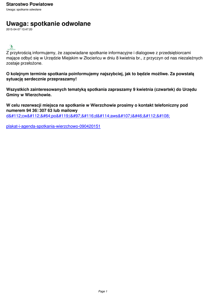 Starostwo Powiatowe Uwaga: spotkanie odwołane Uwaga: spotkanie odwołane 2015-04-07 13:47:20 Z przykrością informujemy, że zapowiadane spotkanie informacyjne i dialogowe z przedsiębiorcami mające odbyć się w Urzędzie Miejskim w Złocieńcu w dniu 8 kwietnia br., z przyczyn od nas niezależnych zostaje przełożone. O kolejnym terminie spotkania poinformujemy najszybciej, jak to będzie możliwe. Za powstałą sytuację serdecznie przepraszamy! Wszystkich zainteresowanych tematyką spotkania zapraszamy 9 kwietnia (czwartek) do Urzędu Gminy w Wierzchowie. W celu rezerwacji miejsca na spotkanie w Wierzchowie prosimy o kontakt telefoniczny pod numerem 94 36 307 63 lub mailowy dpcwp@powiatdrawski.pl plakat-i-agenda-spotkania-wierzchowo-090420151 Page 1