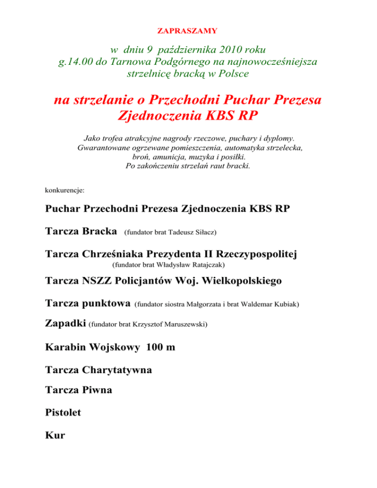 ZAPRASZAMY w dniu 9 października 2010 roku g.14.00 do Tarnowa Podgórnego na najnowocześniejsza strzelnicę bracką w Polsce na strzelanie o Przechodni Puchar Prezesa Zjednoczenia KBS RP Jako trofea atrakcyjne nagrody rzeczowe, puchary i dyplomy. Gwarantowane ogrzewane pomieszczenia, automatyka strzelecka, broń, amunicja, muzyka i posiłki. Po zakończeniu strzelań raut bracki. konkurencje: Puchar Przechodni Prezesa Zjednoczenia KBS RP Tarcza Bracka (fundator brat Tadeusz Siłacz) Tarcza Chrześniaka Prezydenta II Rzeczypospolitej (fundator brat Władysław Ratajczak) Tarcza NSZZ Policjantów Woj. Wielkopolskiego Tarcza punktowa (fundator siostra Małgorzata i brat Waldemar Kubiak) Zapadki (fundator brat Krzysztof Maruszewski) Karabin Wojskowy 100 m Tarcza Charytatywna Tarcza Piwna Pistolet Kur REGULAMIN ZAWODÓW STRZELECKICH O PUCHAR PRZECHODNI PREZESA ZJEDNOCZENIA KBS RP 1. Organizator: Organizatorem zawodów jest Kurkowe Bractwo Strzeleckie w Tarnowie Podgórnym 2. Cele: - krzewienie idei brackich, - nawiązywanie kontaktów między bractwami, - popularyzacja strzelectwa sportowego, - doskonalenie umiejętności strzeleckich; 3. Termin i miejsce zawodów: Zawody odbywać się będą cyklicznie, każdego roku, w październiku w celstacie KBS Tarnowo Podgórne w Tarnowie Podgórnym przy ul. Zachodniej 3. 4. Uczestnictwo: W rywalizacji o Puchar Przechodni Prezesa ZKBS RP oraz tarcze kołkowe mogą brać udział wyłącznie członkowie Bractw Kurkowych. W pozostałych konkurencjach dopuszcza się udział osób niezrzeszonych. 5. Zasady rozgrywania: - strzelec oddaje jeden strzał do tarczy sportowej, - strzały są powtarzalne, - zwycięzcą zawodów zostaje strzelec, która odda najcelniejszy strzał, - w przypadku identycznego wyniku zarządza się dogrywkę: po jednym strzale, 6. Postanowienia końcowe: - Sędziego głównego zawodów wyznacza KBS Tarnowo Podgórne, a ten powołuje sędziów pomocniczych, - organizator zapewnia broń i amunicję, - dopuszcza się korzystanie z własnej broni i amunicji po wcześniejszym okazaniu sędziemu głównemu pozwolenia na broń, - wszelkie kwestie sporne dotyczące zawodów rozstrzyga bezapelacyjnie sędzia główny, - zdobywca Przechodniego Pucharu Prezesa ZKBS RP jest zobowiązany do wykonania zawieszki z metalu kolorowego lub szlachetnego o wymiarach 2x 4 cm na łańcuszkach, na której wygrawerowane będzie imię i nazwisko zwycięzcy oraz nazwa macierzystego bractwa, - zdobywca Przechodniego Pucharu Prezesa ZKBS RP jest zobowiązany do współorganizowania w porozumieniu z KBS Tarnowo Podgórne kolejnej edycji zawodów - ceny strzelań ustala organizator, - nagrody funduje organizator strzelań wraz z fundatorami tarcz i pucharów, 7. Patronat: Prezes ZKBS RP Adam Gołębowski Honorowy: Wójt gminy Tarnowo Podgórne – Tadeusz Czajka