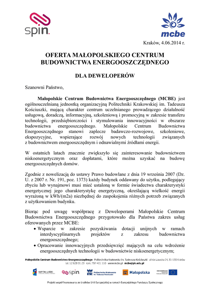 Kraków, 4.06.2014 r. OFERTA MAŁOPOLSKIEGO CENTRUM BUDOWNICTWA ENERGOOSZCZĘDNEGO DLA DEWELOPERÓW Szanowni Państwo, Małopolskie Centrum Budownictwa Energooszczędnego (MCBE) jest ogólnouczelnianą jednostką organizacyjną Politechniki Krakowskiej im. Tadeusza Kościuszki, mającą charakter centrum uczelnianego prowadzącego działalność usługową, doradczą, informacyjną, szkoleniową i promocyjną w zakresie transferu technologii, przedsiębiorczości i stymulowania innowacyjności w obszarze budownictwa energooszczędnego. Małopolskie Centrum Budownictwa Energooszczędnego stanowi zaplecze badawczo-rozwojowe, szkoleniowe, ekspozycyjne, wspierające rozwój nowych technologii związanych z budownictwem energooszczędnym i odnawialnymi źródłami energii. W ostatnich latach znacznie zwiększyło się zainteresowanie budownictwem niskoenergetycznym oraz dopłatami, które można uzyskać na budowę energooszczędnych domów. Zgodnie z nowelizacją do ustawy Prawo budowlane z dnia 19 września 2007 (Dz. U. z 2007 r. Nr. 191, poz. 1373) każdy budynek oddawany do użytku, podlegający zbyciu lub wynajmowi musi mieć ustaloną w formie świadectwa charakterystyki energetycznej jego charakterystykę energetyczną, określającą wielkość energii wyrażoną w kWh/(m2a) niezbędnej do zaspokojenia różnych potrzeb związanych z użytkowaniem budynku. Biorąc pod uwagę współpracę z Deweloperami Małopolskie Centrum Budownictwa Energooszczędnego przygotowało dla Państwa zakres usług oferowanych przez MCBE: Wsparcie w zakresie pozyskiwania dotacji unijnych w ramach interdyscyplinarnych projektów z zakresu budownictwa energooszczędnego; Opracowanie innowacyjnych przedsięwzięć mających na celu wdrożenie energooszczędnych technologii w budownictwie niskoenergetycznym; Wykonywanie ekspertyz, analiz oraz prac zleconych: o analizy efektywności energetycznej; o audyty energetyczne; o charakterystyki efektywności energetycznej; o badania szczelności powietrznej budynków; o badania mikroklimatu wnętrz; o badania współczynnika przewodzenia ciepła przegród budowlanych; o badania termowizyjne rejestrujące miejsca występowania wad termicznych w budynkach. Doradztwo techniczne w zakresie efektywności energetycznej, rozwiązań instalacyjnych źródeł ciepła, w tym źródeł odnawialnych; Wykonywanie symulacji cieplnych budynków w programie Design Builder; Analizy termicznych własności konstrukcji budowlanych z mostkami cieplnymi oraz mostkami dyfuzji pary wodnej za pomocą programy Antherm; Analizy dynamicznych cieplno-wilgotnościowych przegród budowlanych wykonywane w programie WUFI; Projektowanie budynków pasywnych w specjalistycznym programie komputerowym PHPP; Wykonywanie symulacji projektowych w budownictwie pasywnym za pomocą programu Trnsys. Nadrzędnym celem aktywności Małopolskiego Centrum Budownictwa Energooszczędnego jest pomoc w osiągnięciu efektywności energetycznej w projektowanych i istniejących obiektach budowanych. Zachęcamy Państwa do skorzystania z naszego wsparcia. Gwarantujemy pełen profesjonalizm oraz wysoką jakość oferowanych usług. Zapraszamy do bezpośredniego kontaktu: Joanna Lasek Broker MCBE e-mail: [email protected] tel. kom.: +48 797 401 110 Małopolskie Centrum Budownictwa Energooszczędnego ul. Szlak 65/207, 31-153 Kraków Uwaga! MCBE posiada pewną pulę pieniędzy przeznaczoną na realizację zleceń objętą dofinansowaniem z Unii Europejskiej.