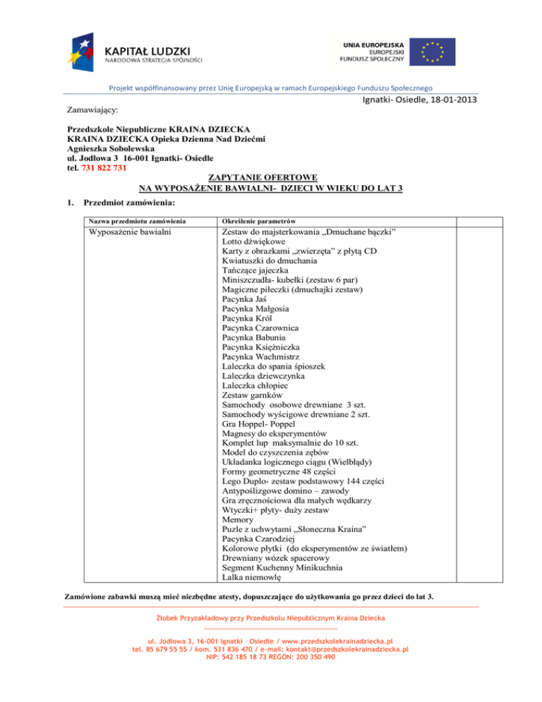 Projekt współfinansowany przez Unię Europejską w ramach Europejskiego Funduszu Społecznego Ignatki- Osiedle, 18-01-2013 Zamawiający: Przedszkole Niepubliczne KRAINA DZIECKA KRAINA DZIECKA Opieka Dzienna Nad Dziećmi Agnieszka Sobolewska ul. Jodłowa 3 16-001 Ignatki- Osiedle tel. 731 822 731 ZAPYTANIE OFERTOWE NA WYPOSAŻENIE BAWIALNI- DZIECI W WIEKU DO LAT 3 1. Przedmiot zamówienia: Nazwa przedmiotu zamówienia Określenie parametrów Wyposażenie bawialni Zestaw do majsterkowania „Dmuchane bączki” Lotto dźwiękowe Karty z obrazkami „zwierzęta” z płytą CD Kwiatuszki do dmuchania Tańczące jajeczka Miniszczudła- kubełki (zestaw 6 par) Magiczne piłeczki (dmuchajki zestaw) Pacynka Jaś Pacynka Małgosia Pacynka Król Pacynka Czarownica Pacynka Babunia Pacynka Księżniczka Pacynka Wachmistrz Laleczka do spania śpioszek Laleczka dziewczynka Laleczka chłopiec Zestaw garnków Samochody osobowe drewniane 3 szt. Samochody wyścigowe drewniane 2 szt. Gra Hoppel- Poppel Magnesy do eksperymentów Komplet lup maksymalnie do 10 szt. Model do czyszczenia zębów Układanka logicznego ciągu (Wielbłądy) Formy geometryczne 48 części Lego Duplo- zestaw podstawowy 144 części Antypoślizgowe domino – zawody Gra zręcznościowa dla małych wędkarzy Wtyczki+ płyty- duży zestaw Memory Puzle z uchwytami „Słoneczna Kraina” Pacynka Czarodziej Kolorowe płytki (do eksperymentów ze światłem) Drewniany wózek spacerowy Segment Kuchenny Minikuchnia Lalka niemowlę Zamówione zabawki muszą mieć niezbędne atesty, dopuszczające do użytkowania go przez dzieci do lat 3. Żłobek Przyzakładowy przy Przedszkolu Niepublicznym Kraina Dziecka ___________________________________ ul. Jodłowa 3, 16-001 Ignatki – Osiedle / www.przedszkolekrainadziecka.pl tel. 85 679 55 55 / kom. 531 836 470 / e-mail: [email protected] NIP: 542 185 18 73 REGON: 200 350 490 Projekt współfinansowany przez Unię Europejską w ramach Europejskiego Funduszu Społecznego 2. Termin realizacji zamówienia: Na okres 01 marca 2013 do 31 marca 2013 . 3. Kryterium oceny oferty: Zamawiający dokona wyboru najkorzystniejszej oferty według następujących kryteriów i znaczeń: cena (brutto, w tym VAT) – 100% 4. Miejsce, termin składania ofert: Ofertę wg załączonego wzoru oraz oświadczenie o braku powiązań należy złożyć w zamkniętej kopercie zaadresowanej na Przedszkole Niepubliczne Kraina Dziecka 16-001 Ignatki- Osiedle ul. Jodłowa 3 z dopiskiem na kopercie: odpowiedź na zapytanie ofertowe dotyczące wyposażenia bawialni , w terminie do 18-02-2013 do godz. 17.00 -osobiście w biurze Przedszkola Niepublicznego Kraina Dziecka. ul. Jodłowa 3 16-001 IgnatkiOsiedle, -przesłać pocztą(decyduje data wpływu do siedziby Zamawiającego). 5. Wykluczenia do złożenia ofert: Nie mogą składać ofert podmioty powiązane z zamawiającym osobowo lub kapitałowo, a w szczególności: a) uczestniczeniu w spółce jako wspólnik spółki osobowej; b) posiadaniu co najmniej 10% udziałów lub akcji; c) pełnieniu funkcji członka organu nadzorczego lub zarządzającego, prokurenta, pełnomocnika; d) pozostawaniu w związku małżeńskim, w stosunku pokrewieństwa lub powinowactwa w linii prostej, pokrewieństwa lub powinowactwa w linii bocznej do drugiego stopnia lub w stosunku przysposobienia, opieki lub kurateli. 6.Ocena ofert: Zamawiający informuje, iż w dniu 18-02-2013r. o godz. 17.10 odbędzie się ocena ofert. Wszyscy oferenci poinformowani zostaną o wynikach zapytania ofertowego. Z wybranymi podwykonawcami podpisana zostanie umowa określająca szczegółowe warunki realizacji zamówienia. Ignatki Osiele, 18-01-2013r. Załączniki: - wzór formularza oferty na jakim należy złożyć ofertę. - wzór oświadczenia o braku powiązań. Dyrektor Agnieszka Sobolewska Żłobek Przyzakładowy przy Przedszkolu Niepublicznym Kraina Dziecka ___________________________________ ul. Jodłowa 3, 16-001 Ignatki – Osiedle / www.przedszkolekrainadziecka.pl tel. 85 679 55 55 / kom. 531 836 470 / e-mail: [email protected] NIP: 542 185 18 73 REGON: 200 350 490