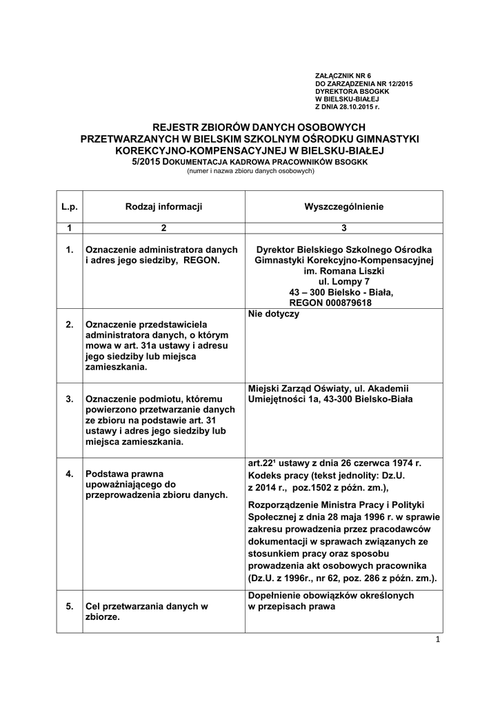 ZAŁĄCZNIK NR 6 DO ZARZĄDZENIA NR 12/2015 DYREKTORA BSOGKK W BIELSKU-BIAŁEJ Z DNIA 28.10.2015 r. REJESTR ZBIORÓW DANYCH OSOBOWYCH PRZETWARZANYCH W BIELSKIM SZKOLNYM OŚRODKU GIMNASTYKI KOREKCYJNO-KOMPENSACYJNEJ W BIELSKU-BIAŁEJ 5/2015 DOKUMENTACJA KADROWA PRACOWNIKÓW BSOGKK (numer i nazwa zbioru danych osobowych) L.p. Rodzaj informacji Wyszczególnienie 1 2 3 1. Oznaczenie administratora danych i adres jego siedziby, REGON. 2. Oznaczenie przedstawiciela administratora danych, o którym mowa w art. 31a ustawy i adresu jego siedziby lub miejsca zamieszkania. 3. Oznaczenie podmiotu, któremu powierzono przetwarzanie danych ze zbioru na podstawie art. 31 ustawy i adres jego siedziby lub miejsca zamieszkania. 4. Podstawa prawna upoważniającego do przeprowadzenia zbioru danych. 5. Cel przetwarzania danych w zbiorze. Dyrektor Bielskiego Szkolnego Ośrodka Gimnastyki Korekcyjno-Kompensacyjnej im. Romana Liszki ul. Lompy 7 43 – 300 Bielsko - Biała, REGON 000879618 Nie dotyczy Miejski Zarząd Oświaty, ul. Akademii Umiejętności 1a, 43-300 Bielsko-Biała art.22¹ ustawy z dnia 26 czerwca 1974 r. Kodeks pracy (tekst jednolity: Dz.U. z 2014 r., poz.1502 z późn. zm.), Rozporządzenie Ministra Pracy i Polityki Społecznej z dnia 28 maja 1996 r. w sprawie zakresu prowadzenia przez pracodawców dokumentacji w sprawach związanych ze stosunkiem pracy oraz sposobu prowadzenia akt osobowych pracownika (Dz.U. z 1996r., nr 62, poz. 286 z późn. zm.). Dopełnienie obowiązków określonych w przepisach prawa 1 Pracownicy BSOGKK 6. Opis kategorii osób, których dane są przetwarzane w zbiorze. 7. Zakres danych przetwarzanych w zbiorze. 8. Sposób zbierania danych do zbioru. 9. Sposób udostępniania danych ze zbioru. 10. Oznaczenie odbiorcy danych lub kategorii odbiorców, którym dane mogą być przekazywane. 11. Informacja dotycząca ewentualnego przekazywania danych do państwa trzeciego. 12. Data wpisu zbioru danych do rejestru. 13. Data ostatniej aktualizacji informacji dotyczącej zbioru. Imię, nazwisko, adres zamieszkania lub pobytu, imiona rodziców, numer PESEL, miejsce pracy, data i miejsce urodzenia, seria i numer dowodu osobistego, numer telefonu, wykształcenie, zawód, historia zatrudnienia, inne orzeczenia wydane w postępowaniu sądowym lub administracyjnym, seria i numer wojskowego dokumentu osobistego, imiona i nazwiska dzieci, daty urodzenia dzieci, obywatelstwo. Od osób, których dotyczą Nie dotyczy Miejski Zarząd Oświaty, ul. Akademii Umiejętności 1a, 43-300 Bielsko-Biała Nie dotyczy 29.10.2015 r. Nie dotyczy Historia zmian w „Rejestrze” Lp. Informacja o rodzaju zmiany Data dokonania zmiany Informacja o zakresie zmiany 2 3