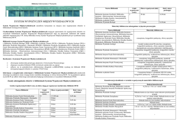 Biblioteka Uniwersytecka w Warszawie Nazwa Biblioteki SYSTEM WYPOśYCZEŃ MIĘDZYWYDZIAŁOWYCH System WypoŜyczeń Międzywydziałowych umoŜliwia korzystanie na miejscu oraz wypoŜyczanie zbiorów w bibliotekach tworzących ten System. UŜytkownikiem Systemu WypoŜyczeń Międzywydziałowych mającym uprawnienia do wypoŜyczania zbiorów we wszystkich bibliotekach Systemu WypoŜyczeń Międzywydziałowych staje się pracownik, doktorant lub student jednostki organizacyjnej UW, której biblioteka tworzy System WypoŜyczeń Międzywydziałowych po wyrobieniu karty bibliotecznej BUW. Biblioteki tworzące System WypoŜyczeń Międzywydziałowych • Biblioteka Wydziału Biologii (WB) • Biblioteka wydziału Chemii (WCH) • Biblioteka Wydziału Geologii (WG) • Biblioteka Wydziału Matematyki i Mechaniki (WMiM) • Biblioteka Wydziału Zarządzania (WZ) • Biblioteka Instytut Fizyki Doświadczalnej (IFD) • Biblioteka Instytutu Fizyki Teoretycznej (IFT) • Biblioteka Instytutu Geofizyki (IGF) • Biblioteka Instytutu Profilaktyki Społecznej i Resocjalizacji (IPSiR) • Biblioteka Dydaktyczna Wydziału Fizyki (NKF) • Biblioteka Instytutu - Obserwatorium Astronomicznego (OA) • Biblioteka Ośrodka Kultury Francuskiej (OKF) • Biblioteka Ośrodka Studiów Amerykańskich (OSA) • Biblioteka Ośrodka Studiów Brytyjskich (OSB) • Biblioteka Uniwersytecka w Warszawie (BUW) obowiązuje uŜytkownika przed jego odejściem z Uniwersytetu Warszawskiego obejmuje wszystkie biblioteki SWM, do których uŜytkownik się zapisał odbywa się za pośrednictwem elektronicznej obiegówki (e-BIEGÓWKI) wysłanej do bibliotek SWM niewypoŜyczających zbiorów w systemie VTLS/Virtua Informacje o uregulowaniu zobowiązań z bibliotekami Systemu WypoŜyczeń Międzywydziałowych uŜytkownik otrzymuje na podstawie stanu swojego konta czytelnika dostępnego ze strony domowej BUW. Na tej podstawie zgłasza się do BUW po odbiór właściwego zaświadczenia będącego rozliczeniem ze wszystkimi bibliotekami SWM. Zasady udostępniania zbiorów w bibliotekach Systemu WypoŜyczeń Międzywydziałowych Liczba wypoŜyczanych dzieł i czas, na który mogą je wypoŜyczyć uŜytkownicy bibliotek SWM Nazwa Biblioteki Biblioteka Instytut Fizyki Doświadczalnej Biblioteka Wydziału Matematyki i Mechaniki Biblioteka Instytutu Fizyki Teoretycznej Biblioteka Dydaktyczna Wydziału Fizyki Biblioteka Instytutu Profilaktyki Społecznej i Resocjalizacji Biblioteka Ośrodka Kultury Francuskiej Biblioteka Wydziału Zarządzania Biblioteka Ośrodka Studiów Brytyjskich Biblioteka Wydziału Geologii 30 dni 3x30 dni 2 7-30 dni 3x30 dni Limit wypoŜyczeń (wol.) 10 5 5 Okres wypoŜyczeń (dni) Ilość i okres prolongat 15-180 dni 30 dni 30 dni 3x30 dni 3x30 dni 3 30 dni 3x30 dni 3 2 2 30 dni 30 dni 30 dni 2 30 dni 3x14 dni 2x14 dni określane indywidualnie - Okres wypoŜyczeń (dni) Ilość i okres prolongat Materiały biblioteczne udostępniane wyłącznie prezencyjnie Nazwa biblioteki Biblioteka Instytutu Geofizyki, Biblioteka Instytutu Obserwatorium Astronomicznego, Biblioteka Instytutu Profilaktyki Społecznej i Resocjalizacji, Biblioteka Dydaktyczna Wydziału Fizyki, Biblioteka Ośrodka Studiów Amerykańskich, Biblioteka Ośrodka Studiów Brytyjskich, Biblioteka Wydziału Biologii Biblioteka Wydziału Geologii Biblioteka Wydziału Zarządzania Biblioteka Instytut Fizyki Doświadczalnej Biblioteka Wydziału Matematyki i Mechaniki Rozliczenie z Systemem WypoŜyczeń Międzywydziałowych • • • Biblioteka Instytutu Geofizyki, Biblioteka Instytutu - Obserwatorium Astronomicznego, Biblioteka Ośrodka Studiów Amerykańskich, Biblioteka wydziału Chemii Biblioteka Wydziału Biologii Limit wypoŜyczeń (wol.) 2 Biblioteka Instytutu Fizyki Teoretycznej Biblioteka Ośrodka Kultury Francuskiej Biblioteka wydziału Chemii Materiały biblioteczne czasopisma, księgozbiór podręczny, zbiory specjalne ksiąŜki wydane przed 50-oma laty, czasopisma, księgozbiór podręczny, zbiory specjalne (materiały kartograficzne oraz prace doktorskie i habilitacyjne) czasopisma, księgozbiór podręczny, księgozbiór czytelni, zbiory specjalne księgozbiór podręczny, wydawnictwa informacyjne, zbiory specjalne czasopisma, księgozbiór podręczny, materiały dydaktyczne, wydawnictwa informacyjne, zbiory specjalne czasopisma, księgozbiór podręczny, wydawnictwa informacyjne, zbiory specjalne Czasopisma naukowe, ksiąŜki wydane przed 1945 r., księgozbiór podręczny, wydawnictwa ilustrowane, zbiory specjalne Czasopisma bieŜące i z przełomu XIX XX wieku, księgozbiór podręczny, wydawnictwa informacyjne, zbiory specjalne Konsekwencje nieoddania w terminie wypoŜyczonych materiałów bibliotecznych Nazwa Biblioteki Biblioteka Wydziału Biologii, Biblioteka wydziału Chemii, Biblioteka Instytutu Profilaktyki Społecznej i Resocjalizacji Biblioteka Wydziału Geologii Biblioteka Wydziału Zarządzania Biblioteka Instytut Fizyki Doświadczalnej Biblioteka Instytutu Geofizyki Biblioteka Ośrodka Studiów Amerykańskich Biblioteka Ośrodka Studiów Brytyjskich Biblioteka Wydziału Matematyki i Mechaniki, Biblioteka Instytutu Fizyki Teoretycznej, Biblioteka Instytutu - Obserwatorium Astronomicznego, Biblioteka Dydaktyczna Wydziału Fizyki, Biblioteka Ośrodka Kultury Francuskiej Rodzaj konsekwencji 0,25zł za 1 wol. za 1 dzień zwłoki blokada konta na czas równy sumie okresów przetrzymania ksiąŜek 0,25zł za 1 wol. za 1 dzień zwłoki, blokada konta na czas ustalany indywidualnie blokada konta na czas ustalany indywidualnie blokada konta 0,50 zł za 1 wol. za 1 dzień zwłoki, blokada konta 2 zł za 1 wol. Za 1 miesiąc, blokada konta na czas ustalany indywidualnie -