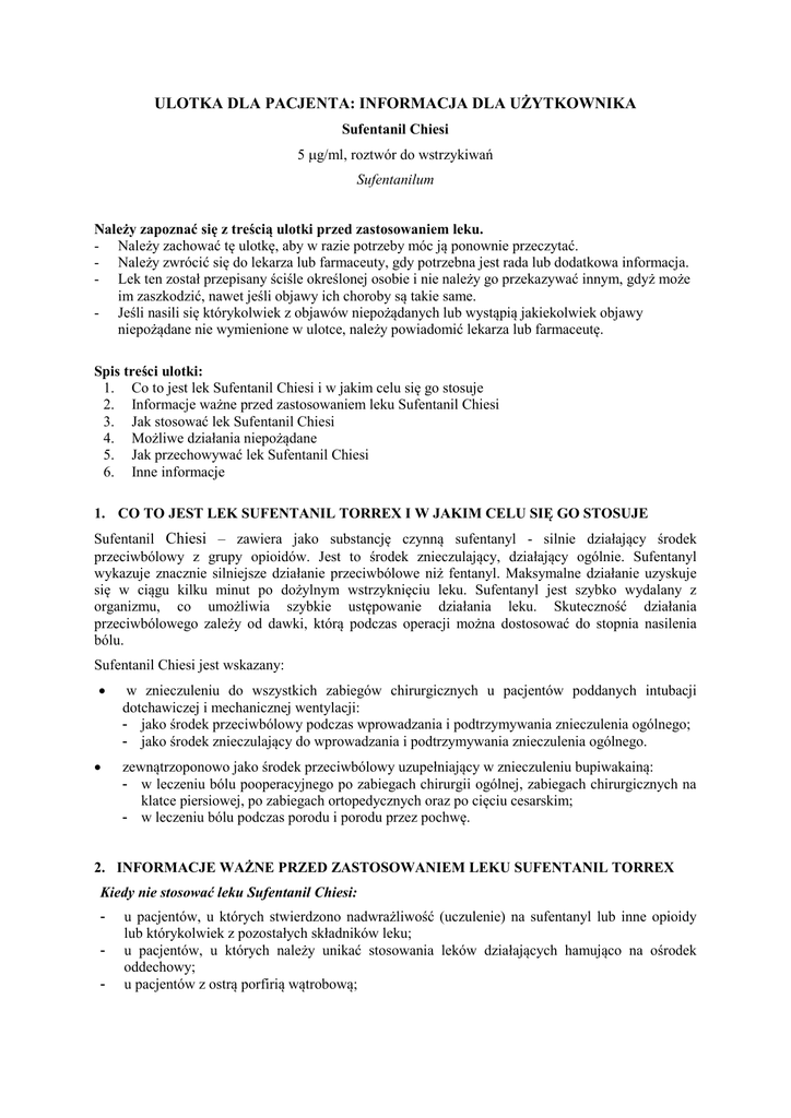 ULOTKA DLA PACJENTA: INFORMACJA DLA UŻYTKOWNIKA Sufentanil Chiesi 5 µg/ml, roztwór do wstrzykiwań Sufentanilum Należy zapoznać się z treścią ulotki przed zastosowaniem leku. - Należy zachować tę ulotkę, aby w razie potrzeby móc ją ponownie przeczytać. - Należy zwrócić się do lekarza lub farmaceuty, gdy potrzebna jest rada lub dodatkowa informacja. - Lek ten został przepisany ściśle określonej osobie i nie należy go przekazywać innym, gdyż może im zaszkodzić, nawet jeśli objawy ich choroby są takie same. - Jeśli nasili się którykolwiek z objawów niepożądanych lub wystąpią jakiekolwiek objawy niepożądane nie wymienione w ulotce, należy powiadomić lekarza lub farmaceutę. Spis treści ulotki: 1. Co to jest lek Sufentanil Chiesi i w jakim celu się go stosuje 2. Informacje ważne przed zastosowaniem leku Sufentanil Chiesi 3. Jak stosować lek Sufentanil Chiesi 4. Możliwe działania niepożądane 5. Jak przechowywać lek Sufentanil Chiesi 6. Inne informacje 1. CO TO JEST LEK SUFENTANIL TORREX I W JAKIM CELU SIĘ GO STOSUJE Sufentanil Chiesi – zawiera jako substancję czynną sufentanyl - silnie działający środek przeciwbólowy z grupy opioidów. Jest to środek znieczulający, działający ogólnie. Sufentanyl wykazuje znacznie silniejsze działanie przeciwbólowe niż fentanyl. Maksymalne działanie uzyskuje się w ciągu kilku minut po dożylnym wstrzyknięciu leku. Sufentanyl jest szybko wydalany z organizmu, co umożliwia szybkie ustępowanie działania leku. Skuteczność działania przeciwbólowego zależy od dawki, którą podczas operacji można dostosować do stopnia nasilenia bólu. Sufentanil Chiesi jest wskazany: • • w znieczuleniu do wszystkich zabiegów chirurgicznych u pacjentów poddanych intubacji dotchawiczej i mechanicznej wentylacji: - jako środek przeciwbólowy podczas wprowadzania i podtrzymywania znieczulenia ogólnego; - jako środek znieczulający do wprowadzania i podtrzymywania znieczulenia ogólnego. zewnątrzoponowo jako środek przeciwbólowy uzupełniający w znieczuleniu bupiwakainą: - w leczeniu bólu pooperacyjnego po zabiegach chirurgii ogólnej, zabiegach chirurgicznych na klatce piersiowej, po zabiegach ortopedycznych oraz po cięciu cesarskim; - w leczeniu bólu podczas porodu i porodu przez pochwę. 2. INFORMACJE WAŻNE PRZED ZASTOSOWANIEM LEKU SUFENTANIL TORREX Kiedy nie stosować leku Sufentanil Chiesi: - u pacjentów, u których stwierdzono nadwrażliwość (uczulenie) na sufentanyl lub inne opioidy lub którykolwiek z pozostałych składników leku; u pacjentów, u których należy unikać stosowania leków działających hamująco na ośrodek oddechowy; u pacjentów z ostrą porfirią wątrobową; - u pacjentów, równocześnie przyjmujących leki z grupy inhibitorów monoamino-oksydazy (MAO) lub którzy przyjmowali inhibitory MAO w ostatnich 14 dniach. Ponadto, zewnątrzoponowe stosowanie sufentanylu jest przeciwwskazane w przypadku: - ciężkiego krwotoku lub wstrząsu; - posocznicy; - zakażenia miejsca podania; - zmian w morfologii krwi; - leczenia przeciwzakrzepowego. Kiedy zachować szczególną ostrożność stosując Sufentanil Chiesi: - u pacjentów z urazem czaszkowo-mózgowym i podwyższonym ciśnieniem wewnątrzczaszkowym; u pacjentów z hipowolemią (zmniejszenie objętości krwi krążącej); u pacjentów z niewyrównaną niedoczynnością tarczycy, z chorobą płuc, u pacjentów otyłych lub uzależnionych od alkoholu. Głębokie znieczulenie ogólne po podaniu dożylnym sufentanylu przebiega z hamowaniem czynności ośrodka oddechowego, co może utrzymywać się też po operacji lub nawet wystąpić po operacji. Dlatego pacjent powinien być uważnie obserwowany po operacji. Konieczny jest też zapewniony dostęp do aparatury i leków potrzebnych do reanimacji. Po zewnątrzoponowym podaniu sufentanylu, pacjent powinien pozostawać pod obserwacją przez co najmniej 2 godziny po podaniu leku, ze względu na możliwość wystąpienia zahamowania czynności ośrodka oddechowego. Z uwagi na możliwe zmiany częstości akcji serca płodu podczas podania zewnątrzoponowego, należy monitorować częstość akcji serca. Ze względu na swoje właściwości przypominające działanie morfiny, sufentanyl może wywoływać przyzwyczajenie, szczególnie po długotrwałym stosowaniu w oddziałach intensywnej terapii. Przyzwyczajenie nie rozwinie się, jeżeli sufentanyl stosowany jest tylko do operacji jako środek znieczulający. Stosowanie leku Sufentanil Chiesi z innymi lekami Należy poinformować lekarza o wszystkich przyjmowanych ostatnio lekach, nawet tych, które wydawane są bez recepty. Dotyczy to szczególnie preparatów z grupy barbituranów, neuroleptyków, opioidów, środków do znieczulenia ogólnego i innych środków o hamującym wpływie na ośrodkowy układ nerwowy. Z reguły zaleca się przerwanie podawania inhibitorów MAO na 14 dni przed zabiegiem chirurgicznym lub znieczuleniem ogólnym. Równoczesne podawanie sufentanylu i benzodiazepin może wywołać spadek ciśnienia tętniczego krwi. Równoczesne stosowanie sufentanylu i wekuronium lub suksametonium może wywoływać spowolnienie skurczów serca. Równoczesne stosowanie erytromycyny, ketokonazolu, itrakonazolu, rytonawiru, może zahamować rozkład sufentanylu i przedłużyć jego działanie hamujące na ośrodek oddechowy. Spożycie alkoholu bezpośrednio po znieczuleniu ogólnym sufentanylem może wzmagać działanie leku na ośrodkowy układ nerwowy, z tego względu jest ono przeciwwskazane. Ciąża i karmienie piersią Przed zastosowaniem leku należy poinformować lekarza o istniejącej ciąży. Dożylne podanie sufentanylu w czasie porodu lub cięcia cesarskiego nie jest zalecane. Sufentanyl podawany zewnątrzoponowo, jako uzupełniający środek w znieczuleniu zewnątrzoponowym bupiwakainą, w dawce do 30 mikrogramów, nie wykazuje żadnego niekorzystnego wpływu na stan kobiety rodzącej, ani na wynik oceny