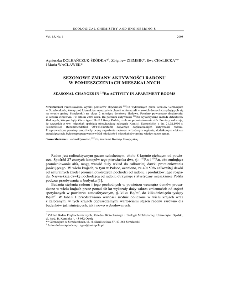 E C O LO GIC AL C H E M IS T R Y AN D E N GIN E E R IN G S Vol. 15, No. 1 2008 Agnieszka DOŁHAŃCZUK-ŚRÓDKA*1, Zbigniew ZIEMBIK*, Ewa CHALECKA** i Maria WACŁAWEK* SEZONOWE ZMIANY AKTYWNOŚCI RADONU W POMIESZCZENIACH MIESZKALNYCH SEASONAL CHANGES IN 222Rn ACTIVITY IN APARTMENT ROOMS Streszczenie: Przedstawiono wyniki pomiarów aktywności 222Rn wykonanych przez uczniów Gimnazjum w Strzeleczkach, którzy pod kierunkiem nauczyciela chemii umieszczali w swoich domach (znajdujących się na terenie gminy Strzeleczki) na okres 2 miesięcy detektory śladowe. Pomiary powtarzano dwukrotnie: w sezonie zimowym i w letnim 2007 roku. Do pomiaru aktywności 222Rn wykorzystano metodę detektorów śladowych, którymi były klisze typu LR-115 firmy Kodak, czułe na promieniowanie alfa. Pomiary wskazują, Ŝe wszystkie z ww. mieszkań spełniają obowiązujące zalecenia Komisji Europejskiej z dn. 21.02.1990 r. (Commission Recommendation 90/143/Euratom) dotyczące dopuszczalnych aktywności radonu. Przeprowadzone pomiary umoŜliwiły ocenę zagroŜenia radonem w badanym regionie, dodatkowym efektem przedsięwzięcia było rozpropagowanie wśród młodzieŜy i mieszkańców gminy wiedzy na ten temat. Słowa kluczowe: radioaktywność, 222Rn, zalecenia Komisji Europejskiej Radon jest radioaktywnym gazem szlachetnym, około 8-krotnie cięŜszym od powietrza. Spośród 27 znanych izotopów tego pierwiastka dwa, tj.: 222Rn i 220Rn, oba emitujące promieniowanie alfa, mogą wnosić duŜy wkład do całkowitej dawki promieniowania jonizującego. W wielu krajach, w tym w Polsce, oceniono, Ŝe 40÷50% całkowitej dawki od naturalnych źródeł promieniotwórczych pochodzi od radonu i produktów jego rozpadu. Największą dawkę pochodzącą od radonu otrzymuje statystyczny mieszkaniec Polski podczas przebywania w budynku [1]. Badania stęŜenia radonu i jego pochodnych w powietrzu wewnątrz domów prowadzone w wielu krajach przez ponad 40 lat wykazały duŜy zakres zmienności: od stęŜeń spotykanych w powietrzu atmosferycznym, tj. kilku Bq/m3, do kilkudziesięciu tysięcy Bq/m3. W tabeli 1 przedstawiono wartości średnie obliczone w wielu krajach wraz z zalecanymi w tych krajach dopuszczalnymi wartościami stęŜeń radonu zarówno dla budynków juŜ istniejących, jak i nowo wybudowanych. * Zakład Badań Fizykochemicznych, Katedra Biotechnologii i Biologii Molekularnej, Uniwersytet Opolski, ul. kard. B. Kominka 4, 45-032 Opole ** Gimnazjum w Strzeleczkach, ul. H. Sienkiewicza 37, 47-364 Strzeleczki 1 Autor do korespondencji: [email protected]. 62 Agnieszka Dołhańczuk-Śródka, Zbigniew Ziembik, Ewa Chalecka i Maria Wacławek Tabela 1 Wartości średnie obliczone w wielu krajach wraz z zalecanymi w tych krajach dopuszczalnymi wartościami stęŜeń radonu zarówno dla budynków juŜ istniejących, jak i nowo wybudowanych [1] Kraj Średnie stęŜenie radonu [Bq/m3] Polska 38 Findlandia 120 Niemcy 40 USA 65 Słowacja Szwecja 800 Szwajcaria 60 Wielka Brytania 28 * zalecenia Komisji Europejskiej. Zalecane dopuszczalne wartości stęŜeń radonu [Bq/m3] Istniejące budynki Nowe budynki 400 200* 800 200 150 10 500 500 800 140 800 800 400 80 Międzynarodowa Komisja Ochrony Radiologicznej podaje dwie wartości referencyjne (dla budynków mieszkalnych), powyŜej których naleŜy podjąć działania mające na celu zmniejszanie stęŜenia radonu: 400 Bq/m3 - dla domów juŜ zbudowanych oraz 200 Bq/m3 dla domów nowo wybudowanych [2]. Badania statystyczne nad źródłami radonu w powietrzu wewnętrznym budynków mieszkalnych wykazały dominującą rolę podłoŜa gruntowego. W mniejszym stopniu za stęŜenia radonu odpowiedzialne są materiały budowlane oraz woda i spalany gaz ziemny [3]. Procentowy udział źródeł radonu w powietrzu wewnątrz budynku przedstawiono w tabeli 2. Tabela 2 Źródła radonu w powietrzu wewnątrz statystycznego budynku przy załoŜeniu wymiany powietrza co godzinę [3, 4] Źródło radonu PodłoŜe gruntowe Materiały budowlane Powietrze atmosferyczne Woda Gaz ziemny % udział 77,9 12,0 9,3 0,2 0,6 Radon przenika z podłoŜa i materiałów budowlanych do wnętrza budynków, co powoduje, Ŝe jego koncentracja w zamkniętych pomieszczeniach jest o wiele większa. Wnika on do piwnic przez pęknięcia fundamentów, przez nieszczelności w osadzeniu rur wodociągowych i kanalizacyjnych oraz systemy odwadniania. Nawet małe róŜnice ciśnień między gruntem pod fundamentem a wnętrzem pomieszczeń, wywołane przez wiatry i róŜnicę temperatur wewnątrz i na zewnątrz domu, powodują, Ŝe dom „zasysa” radon z podłoŜa [5]. Metodyka pomiarów Do pomiaru aktywności 222Rn wykorzystano metodę detektorów śladowych, którymi były klisze typu LR-115 firmy Kodak, czułe na promieniowanie alfa. Cząstki alfa pozostawiają na swej drodze defekty strukturalne, które po wytrawieniu klisz w NaOH są 63 Sezonowe zmiany aktywności radonu w pomieszczeniach mieszkalnych dobrze widoczne pod mikroskopem. Przy czterdziestokrotnym powiększeniu zliczano na nich gęstość śladów. Zaletą tego pomiaru jest rejestracja wartości średniej dla okresu ekspozycji, co jest bardzo waŜne w przypadku radonu, którego stęŜenie w powietrzu jest zmienne w czasie. Wyniki pomiarów i ich analiza W pomiarach uczestniczyło 24 uczniów z Gimnazjum w Strzeleczkach, którzy pod kierunkiem nauczyciela chemii umieszczali w swoich domach (znajdujących się na terenie gminy Strzeleczki) na okres 2 miesięcy detektory śladowe. Pomiary powtarzano dwukrotnie: w sezonie zimowym i w letnim 2007 roku. Otrzymane dane zgromadzono w tabeli, w której kolumny odpowiadały aktywności 222Rn (zmienna w skali ilorazowej) oraz porze roku i rodzajowi pomieszczenia (zmienne nominalne). „Pora roku” była zmienną o 2 poziomach („Lato” i „Zima”), a „rodzaj pomieszczenia” zawierał 3 poziomy („K” - kuchnia, „P” - piwnica i „Ł” - łazienka). Otrzymane wyniki pomiarów i zaleŜności pomiędzy nimi 