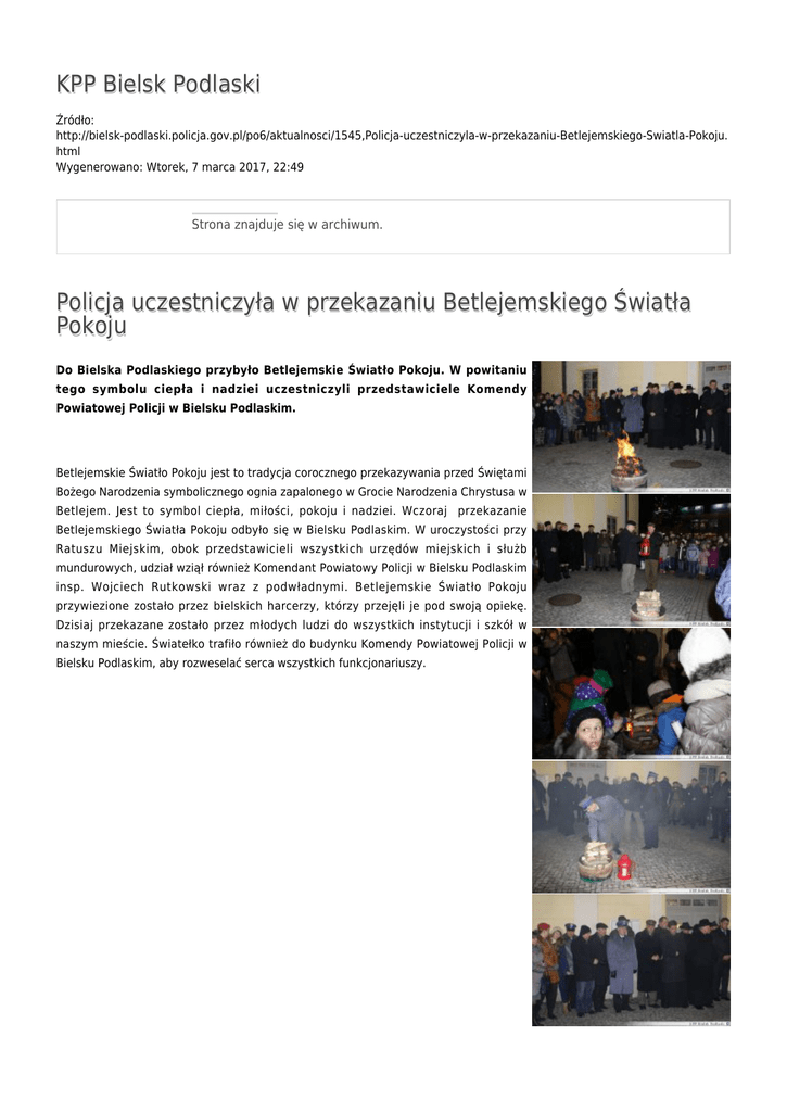 KPP Bielsk Podlaski Źródło: http://bielsk-podlaski.policja.gov.pl/po6/aktualnosci/1545,Policja-uczestniczyla-w-przekazaniu-Betlejemskiego-Swiatla-Pokoju. html Wygenerowano: Wtorek, 7 marca 2017, 22:49 Strona znajduje się w archiwum. Policja uczestniczyła w przekazaniu Betlejemskiego Światła Pokoju Do Bielska Podlaskiego przybyło Betlejemskie Światło Pokoju. W powitaniu tego symbolu ciepła i nadziei uczestniczyli przedstawiciele Komendy Powiatowej Policji w Bielsku Podlaskim. Betlejemskie Światło Pokoju jest to tradycja corocznego przekazywania przed Świętami Bożego Narodzenia symbolicznego ognia zapalonego w Grocie Narodzenia Chrystusa w Betlejem. Jest to symbol ciepła, miłości, pokoju i nadziei. Wczoraj przekazanie Betlejemskiego Światła Pokoju odbyło się w Bielsku Podlaskim. W uroczystości przy Ratuszu Miejskim, obok przedstawicieli wszystkich urzędów miejskich i służb mundurowych, udział wziął również Komendant Powiatowy Policji w Bielsku Podlaskim insp. Wojciech Rutkowski wraz z podwładnymi. Betlejemskie Światło Pokoju przywiezione zostało przez bielskich harcerzy, którzy przejęli je pod swoją opiekę. Dzisiaj przekazane zostało przez młodych ludzi do wszystkich instytucji i szkół w naszym mieście. Światełko trafiło również do budynku Komendy Powiatowej Policji w Bielsku Podlaskim, aby rozweselać serca wszystkich funkcjonariuszy. Ocena: 0/5 (0) Tweetnij