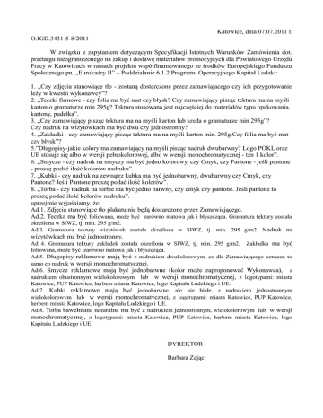 Katowice, dnia 07.07.2011 r. O.IGD.3431-5-8/2011 W związku z zapytaniem dotyczącym Specyfikacji Istotnych Warunków Zamówienia dot. przetargu nieograniczonego na zakup i dostawę materiałów promocyjnych dla Powiatowego Urzędu Pracy w Katowicach w ramach projektu współfinansowanego ze środków Europejskiego Funduszu Społecznego pn. „Eurokadry II” – Poddziałanie 6.1.2 Programu Operacyjnego Kapitał Ludzki: 1. „Czy zdjęcia stanowiące tło - zostaną dostarczone przez zamawiajacego czy ich przygotowanie leży w kwestii wykonawcy”? 2. „Teczki firmowe - czy folia ma być mat czy błysk? Czy zamawiający pisząc tektura ma na myśli karton o gramaturze min 295g? Tektura stosowana jest najczęściej do materiałów typu opakowania, kartony, pudełka”. 3. „Czy zamawiający pisząc tektura ma na myśli karton lub kreda o gramaturze min 295g”? Czy nadruk na wizytówkach ma być dwu czy jednostronny? 4. „Zakładki - czy zamawiający pisząc tektura ma na myśli karton min. 295g.Czy folia ma być mat czy błysk”? 5.”Długopisy-jakie kolory ma zamawiający na myśli pisząc nadruk dwubarwny? Logo POKL oraz UE stosuje się albo w wersji pełnokolorowej, albo w wersji monochromatycznej - tzn 1 kolor”. 6. „Smycze - czy nadruk na smyczy ma być jedno kolorowy, czy Cmyk, czy Pantone - jeśli pantone - proszę podać ilość kolorów nadruku”. 7. „Kubki - czy nadruk na zewnątrz kubka ma być jednobarwny, dwubarwny czy Cmyk, czy Pantone? Jeśli Pantone proszę podać ilość kolorów”. 8. „Torba - czy nadruk na torbie ma być jedno barwny, czy cmyk czy pantone. Jesli pantone to proszę podać ilość kolorów nadruku”. uprzejmie wyjaśniamy, że: Ad.1. Zdjęcia stanowiące tło plakatu nie będą dostarczone przez Zamawiającego. Ad.2. Teczka ma być foliowana, może być zarówno matowa jak i błyszcząca. Gramatura tektury została określona w SIWZ, tj. min. 295 g/m2. Ad.3. Gramatura tektury wizytówek została określona w SIWZ, tj. min. 295 g/m2. N adruk na wizytówkach ma być jednostronny. Ad 4. Gramatura tektury zakładek została określona w SIWZ, tj. min. 295 g/m2. Zakładka ma być foliowana, może być zarówno matowa jak i błyszcząca. Ad.5. Długopisy reklamowe mają być z nadrukiem dwukolorowym, co dla Zamawiającego oznacza to samo co nadruk w wersji monochromatycznej. Ad.6. Smycze reklamowe mają być jednobarwne (kolor może zaproponować Wykonawca), z nadrukiem obustronnym wielokolorowym lub w wersji monochromatycznej, z logotypami: miasta Katowice, PUP Katowice, herbem miasta Katowice, logo Kapitału Ludzkiego i UE. Ad.7. Kubki reklamowe mają być jednobarwne, ale nie białe, z nadrukiem jednostronnym wielokolorowym lub w wersji monochromatycznej, z logotypami: miasta Katowice, PUP Katowice, herbem miasta Katowice, logo Kapitału Ludzkiego i UE. Ad.8. Torba bawełniana naturalna ma być z nadrukiem jednostronnym, wielokolorowym lub w wersji monochromatycznej, z logotypami: miasta Katowice, PUP Katowice, herbem miasta Katowice, logo Kapitału Ludzkiego i UE. DYREKTOR Barbara Zając