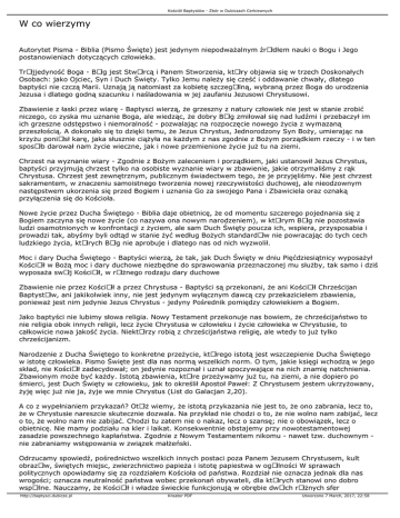 Kościół Baptystów - Zbór w Dubiczach Cerkiewnych W co wierzymy Autorytet Pisma - Biblia (Pismo Święte) jest jedynym niepodważalnym źrÃłdłem nauki o Bogu i Jego postanowieniach dotyczących człowieka. TrÃłjjedyność Boga - BÃłg jest StwÃłrcą i Panem Stworzenia, ktÃłry objawia się w trzech Doskonałych Osobach: jako Ojciec, Syn i Duch Święty. Tylko Jemu należy się cześć i oddawanie chwały, dlatego baptyści nie czczą Marii. Uznają ją natomiast za kobietę szczegÃłlną, wybraną przez Boga do urodzenia Jezusa i dlatego godną szacunku i naśladowania w jej zaufaniu Jezusowi Chrystusowi. Zbawienie z łaski przez wiarę - Baptysci wierzą, że grzeszny z natury człowiek nie jest w stanie zrobić niczego, co zyska mu uznanie Boga, ale wiedząc, że dobry BÃłg zmiłował się nad ludźmi i przebaczył im ich grzeszne odstępstwo i niemoralność - pozwalając na rozpoczęcie nowego życia z wymazaną przeszłością. A dokonało się to dzięki temu, że Jezus Chrystus, Jednorodzony Syn Boży, umierając na krzyżu poniÃłsł karę, jaka słusznie ciążyła na każdym z nas zgodnie z Bożym porządkiem rzeczy - i w ten sposÃłb darował nam życie wieczne, jak i nowe przemienione życie już tu na ziemi. Chrzest na wyznanie wiary - Zgodnie z Bożym zaleceniem i porządkiem, jaki ustanowił Jezus Chrystus, baptyści przyjmują chrzest tylko na osobiste wyznanie wiary w zbawienie, jakie otrzymaliśmy z rąk Chrystusa. Chrzest jest zewnętrznym, publicznym świadectwem tego, że je przyjęliśmy. Nie jest chrzest sakramentem, w znaczeniu samoistnego tworzenia nowej rzeczywistości duchowej, ale nieodzownym następstwem ukorzenia się przed Bogiem i uznania Go za swojego Pana i Zbawiciela oraz oznaką przyłączenia się do Kościoła. Nowe życie przez Ducha Świętego - Biblia daje obietnicę, że od momentu szczerego pojednania się z Bogiem zaczyna się nowe życie (co nazywa ona nowym narodzeniem), w ktÃłrym BÃłg nie pozostawia ludzi osamotnionych w konfrontacji z życiem, ale sam Duch Święty poucza ich, wspiera, przysposabia i prowadzi tak, abyśmy byli odtąd w stanie żyć według Bożych standardÃłw nie powracając do tych cech ludzkiego życia, ktÃłrych BÃłg nie aprobuje i dlatego nas od nich wyzwolił. Moc i dary Ducha Świętego - Baptyści wierzą, że tak, jak Duch Święty w dniu Pięćdziesiątnicy wyposażył KościÃłł w Bożą moc i dary duchowe niezbędne do sprawowania przeznaczonej mu służby, tak samo i dziś wyposaża swÃłj KościÃłł, w rÃłżnego rodzaju dary duchowe Zbawienie nie przez KościÃłł a przez Chrystusa - Baptyści są przekonani, że ani KościÃłł Chrześcijan BaptystÃłw, ani jakikolwiek inny, nie jest jedynym wyłącznym dawcą czy przekazicielem zbawienia, ponieważ jest nim jedynie Jezus Chrystus - jedyny Pośrednik pomiędzy człowiekiem a Bogiem. Jako baptyści nie lubimy słowa religia. Nowy Testament przekonuje nas bowiem, że chrześcijaństwo to nie religia obok innych religii, lecz życie Chrystusa w człowieku i życie człowieka w Chrystusie, to całkowicie nowa jakość życia. NiektÃłrzy robią z chrześcijaństwa religię, ale wtedy to już tylko chrześcijanizm. Narodzenie z Ducha Świętego to konkretne przeżycie, ktÃłrego istotą jest wszczepienie Ducha Świętego w istotę człowieka. Pismo Święte jest dla nas normą wszelkich norm. O tym, jakie księgi wchodzą w jego skład, nie KościÃłł zadecydował; on jedynie rozpoznał i uznał spoczywające na nich znamię natchnienia. Zbawionym może być każdy. Istotą zbawienia, ktÃłre przeżywamy już tu, na ziemi, a nie dopiero po śmierci, jest Duch Święty w człowieku, jak to określił Apostoł Paweł: Z Chrystusem jestem ukrzyżowany, żyję więc już nie ja, żyje we mnie Chrystus (List do Galacjan 2,20). A co z wypełnianiem przykazań? OtÃłż wiemy, że istotą przykazania nie jest to, że ono zabrania, lecz to, że w Chrystusie nareszcie skutecznie dozwala. Na przykład nie chodzi o to, że nie wolno nam zabijać, lecz o to, że wolno nam nie zabijać. Chodzi tu zatem nie o nakaz, lecz o szansę; nie o obowiązek, lecz o obietnicę. Nie mamy podziału na kler i laikat. Konsekwentnie obstajemy przy nowotestamentowej zasadzie powszechnego kapłaństwa. Zgodnie z Nowym Testamentem nikomu - nawet tzw. duchownym nie zabraniamy wstępowania w związek małżeński. Odrzucamy spowiedź, pośrednictwo wszelkich innych postaci poza Panem Jezusem Chrystusem, kult obrazÃłw, świętych miejsc, zwierzchnictwo papieża i istotę papiestwa w ogÃłlności W sprawach politycznych opowiadamy się za rozdziałem Kościoła od państwa. Rozdział nie oznacza jednak dla nas wrogości; oznacza neutralność państwa wobec przekonań obywateli, dla ktÃłrych stanowi ono dobro wspÃłlne. Nauczamy, że KościÃłł i władze świeckie funkcjonują w obrębie dwÃłch rÃłżnych sfer http://baptysci.dubicze.pl Kreator PDF Utworzono 7 March, 2017, 22:58 Kościół Baptystów - Zbór w Dubiczach Cerkiewnych rzeczywistości: KościÃłł jest w świecie, lecz nie należy do świata; władze świeckie należą do świata jako wyraz jego zorganizowania. Z tej racji KościÃłł winien oddziaływać na władze świeckie, podobnie zresztą jak i na całą społeczność świata, wszelkimi, zgodnymi z jego naturą, sposobami. Władze świeckie zaś, choć mogą korzystać z posług właściwych członkom Kościoła i rozliczać ich jako obywateli, nie powinny rościć sobie praw do wpływania na nauczanie, ustrÃłj i misję Kościoła. Jak zawsze opowiadamy się za poszanowaniem wolności osobistej człowieka. Nikogo nie prześladowaliśmy, choć nas prześladowano, przyczyniliśmy się do zniesienia niewolnictwa, odrzucamy rasizm (pastor Martin Luter King, laureat nagrody Nobla, przepłacił to życiem), zwiastując ewangelię walczymy z przestępczością i niemoralnością (jeden z największych ewangelistÃłw naszego stulec