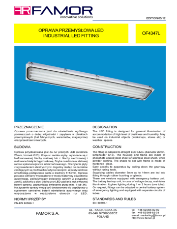 EDITION 05/12 OPRAWA PRZEMYSŁOWA LED INDUSTRIAL LED FITTING OF4347L PRZEZNACZENIE DESIGNATION Oprawa przeznaczona jest do oświetlania ogólnego pomieszczeń o dużej wilgotności i zapyleniu w obiektach przemysłowych (hal fabrycznych, warsztatów, magazynów) oraz przestrzeni otwartych. The LED fitting is designed for general illumination of accommodation of high level of dustiness and humidity. May be used on industrial objects (workshops, stores etc) or weather spaces. BUDOWA CONSTRUCTION Oprawa przystosowana jest do rur prostych LED (średnica 26mm, trzonek G13). Korpus i ramka szyby wykonane są z fosforanowanej blachy stalowej lub z blachy nierdzewnej i malowane białą farbą proszkową. Szyba osadzona w stalowej ramce wykonana jest ze szkła hartowanego. Odchylenie płyty z wyposażeniem elektrycznym i dogodny dostęp do zacisków zasilających są możliwe bez użycia narzędzi. Wpusty kablowe umożliwiają podłączenie kabla o średnicy 6÷14mm. Oprawa posiada odmiany wyposażone w moduł bateryjny oświetlenia awaryjnego, podtrzymujący świecenie oprawy w przypadku zaniku zasilania z sieci (jedna zrur LED zasilana jest z własnej baterii oprawy, zapewniając świecenie przez min. 1 lub 3h). Na życzenie oprawy mogą być dostosowane do współpracy z systemem centralnej baterii oświetlenia awaryjnego oraz wyposażone w rozdzielone obwody rur LED. The fitting is adapted to straight LED tubes (diameter 26mm, lampholder G13). The housing and frame are made of phosphate coated steel sheet or stainless steel sheet, white powder coating. The shade to set with frame is made of hardened glass. Easy access to apparatus by pulling down the gear-tray without using tools. Supplying cables diameter 6mm up to 14mm are led into fitting through rubber bushing or glands. There are versions equipped with emergency battery unit. The battery backup unit, in case of voltage decay, maintains illumination. It gives lighting during 1 or 3 hours (one tube). On request, fittings can be adapted to central battery system of emergency lighting and equipped with separate circuits of tubes. NORMY I PRZEPISY STANDARDS AND RULES PN-EN 60598-1 EN 60598-1 FAMOR S.A. UL. KASZUBSKA 25 85-048 BYDGOSZCZ POLAND tel. +48-52/366-82-02 fax +48-52/366-82-03 e-mail: [email protected] http://www.famor.pl OF4347L Rysunki gabarytowe / Dimensioned drawings Wykres KRS/ Light distribution diagram cd/klm 2x, 3x, 4x20W 2x, 3x, 4x22W Mocowanie / Fixing A=600mm IP65 cos > 0,95 J F I L Ilość i moc źródeł światła Typ oprawy OF4347/ 2 20 - 2x18÷20W OF4347/ 3 20 - 3x18÷20W OF4347/ 4 20 - 4x18÷20W Rodzaj trzonka i długość rury LED Sprawność świetlna G13 l=1200mm Masa (kg) AX A1 A3 13‚0 14‚0 14‚0 15‚0 15‚0 16‚0 17‚0 18‚0 18‚0 19‚0 19‚0 20‚0 AX A1 A3 0‚95 OF4347/ 2 22 - 2x22W OF4347/ 3 22 - 3x22W OF4347/ 4 22 - 4x22W Reference number Light source power UWAGA Dostawa bez rur LED. Zalecane rury LED - H3T8 ... f-my SOLLS. Zakresy temperatur otoczenia: -25°C ÷ +45°C dla opraw bez modułu awar. - kod "AX" 0°C ÷ +45°C dla opraw z moduem awaryjnym - kod "A1" i "A3" Oprawa przystosowana do rur LED zasilanych z obu końców. Zasilanie rur LED z jednego końca - na życzenie. G13 l=1500mm Lampholder type and LED tube length Light output ratio Mass (kg) NOTE LED tubes not included. Recommended LED tubes H3T8 ... SOLLS. Ambient temperature range: -25°C ÷ +45°C for fitting without battery backup - code "AX" 0°C ÷ +45°C for fitting with battery backup - code "A1 and "A3" The fitting is adapted for LED tubes both sides powered. Adaptation for one side supply LED tubes - on request. SPECYFIKACJA ZAMÓWIENIA ORDER REQUIREMENTS Poniższy kod jest przewidziany dla pomocy w prawidłowym wyborze wyposażenia. Utwórz numer zamówieniowy oprawy poprzez wstawienie kodu każdego kompenentu w odpowiednie okno. The following code is designed to help in selection of the correct fitting. Build up the reference number by inserting the code for each component into the appropriate box.