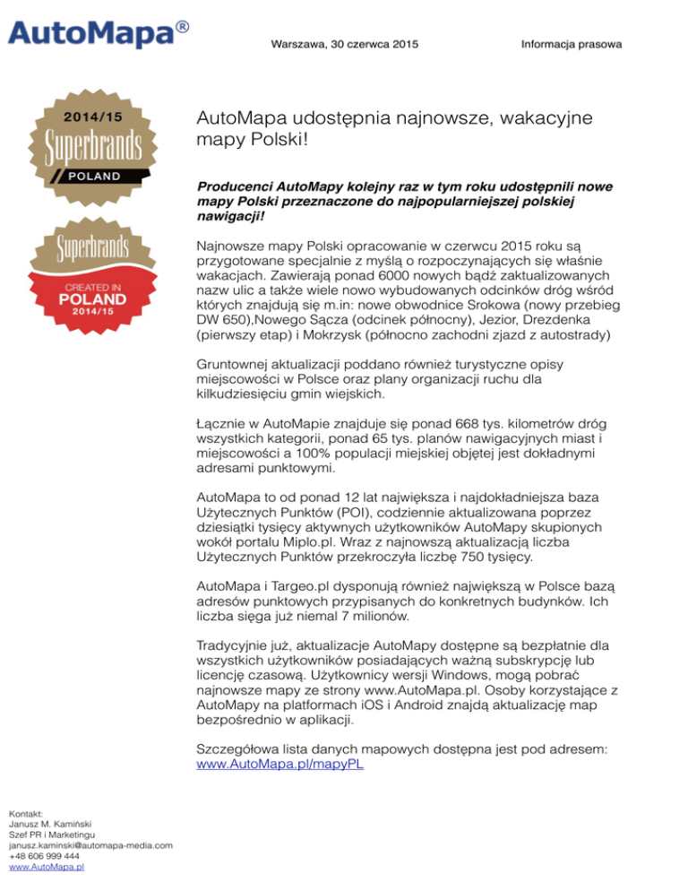 Warszawa, 30 czerwca 2015 Informacja prasowa AutoMapa udostępnia najnowsze, wakacyjne mapy Polski! Producenci AutoMapy kolejny raz w tym roku udostępnili nowe mapy Polski przeznaczone do najpopularniejszej polskiej nawigacji! Najnowsze mapy Polski opracowanie w czerwcu 2015 roku są przygotowane specjalnie z myślą o rozpoczynających się właśnie wakacjach. Zawierają ponad 6000 nowych bądź zaktualizowanych nazw ulic a także wiele nowo wybudowanych odcinków dróg wśród których znajdują się m.in: nowe obwodnice Srokowa (nowy przebieg DW 650),Nowego Sącza (odcinek północny), Jezior, Drezdenka (pierwszy etap) i Mokrzysk (północno zachodni zjazd z autostrady) Gruntownej aktualizacji poddano również turystyczne opisy miejscowości w Polsce oraz plany organizacji ruchu dla kilkudziesięciu gmin wiejskich. Łącznie w AutoMapie znajduje się ponad 668 tys. kilometrów dróg wszystkich kategorii, ponad 65 tys. planów nawigacyjnych miast i miejscowości a 100% populacji miejskiej objętej jest dokładnymi adresami punktowymi. AutoMapa to od ponad 12 lat największa i najdokładniejsza baza Użytecznych Punktów (POI), codziennie aktualizowana poprzez dziesiątki tysięcy aktywnych użytkowników AutoMapy skupionych wokół portalu Miplo.pl. Wraz z najnowszą aktualizacją liczba Użytecznych Punktów przekroczyła liczbę 750 tysięcy. AutoMapa i Targeo.pl dysponują również największą w Polsce bazą adresów punktowych przypisanych do konkretnych budynków. Ich liczba sięga już niemal 7 milionów. Tradycyjnie już, aktualizacje AutoMapy dostępne są bezpłatnie dla wszystkich użytkowników posiadających ważną subskrypcję lub licencję czasową. Użytkownicy wersji Windows, mogą pobrać najnowsze mapy ze strony www.AutoMapa.pl. Osoby korzystające z AutoMapy na platformach iOS i Android znajdą aktualizację map bezpośrednio w aplikacji. Szczegółowa lista danych mapowych dostępna jest pod adresem: www.AutoMapa.pl/mapyPL Kontakt: Janusz M. Kamiński Szef PR i Marketingu [email protected] +48 606 999 444 www.AutoMapa.pl