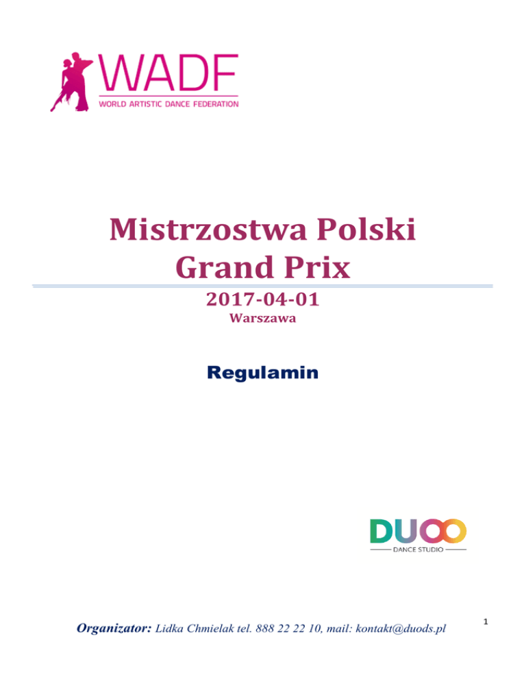 Mistrzostwa Polski Grand Prix 2017-04-01 Warszawa Regulamin Organizator: Lidka Chmielak tel. 888 22 22 10, mail: [email protected] 1 REGULAMIN 1. ORGANIZATOR: Lidia Chmielak - Duoo Dance Studio 2. TERMIN i MIEJSCE: 01.04.17 , Start - godz. 10.00 Rezydencja Zalewskich, Parzniew, ul. 36 P.P. Legii Akademickiej 10, 05-804 Pruszków 3. CELE TURNIEJU: a) b) c) d) Popularyzacji tańca nowoczesnego, jako formy aktywnego wypoczynku. Wymiany doświadczeń pomiędzy tancerzami i instruktorami. Konfrontacji umiejętności tanecznych poszczególnych zawodników i zespołów. Wyłonienia Mistrzów Polski na rok 2017 w poszczególnych konkurencjach tanecznych, z uwzględnieniem kategorii wiekowych. 4. RAMOWY PROGRAM TURNIEJU: Zostanie przesłany po zamknięciu list startowych, opublikowany na profilu wydarzenia na fb Duoo Dance Studio oraz stronie: http://www.wadf.pl a) Informacje i materiały do pobrania: http://www.duods.pl/konkurencje_taneczne_MP_Warszawa.pdf http://www.duods.pl/regulamin_wadf.pdf http://www.duods.pl/karta_zgloszenia_wadf.pdf http://www.duods.pl/zestaw_obiadowy.pdf 5. KATEGORIE TANECZNE : - osobny plik - Konkurencje taneczne MP Warszawa 6. INNE : a) Każdy uczestnik może być członkiem tylko jednej mini-formacji w każdej kategorii tanecznej b) Każdy uczestnik może być członkiem tylko jednej formacji w każdej kategorii tanecznej c) Muzyka powinna być przesłana na adres mailowy wraz ze zgłoszeniem oraz dodatkowo dostarczona przed pokazem na opisanym nośniku CD/USB. Prosimy o wcześniejsze sprawdzenie nagrania u akustyka Uwaga! Uczestnicy turnieju MP i GP nie muszą posiadać licencji WADF !!! Wszyscy tancerze zobowiązani są do używania obuwia tanecznego - niedozwolone jest używanie obuwia, które może zniszczyć, zarysować podłoże 2 Instruktor nie może brać udziału w prezentacjach tanecznych - O przynależności do danej kategorii wiekowej we wszystkich kategoriach decyduje rok urodzenia najstarszego uczestnika Organizator może dokonać zmian w kategoriach (połączyć je lub rozdzielić lub dokonać innych zmian) oraz wprowadzić eliminacje lub półfinały ze względu na zbyt dużą lub zbyt małą ilość zgłoszeń Zawodnicy powinni posiadać dokument tożsamości potwierdzający ich wiek i okazać go na życzenie Sędziego Głównego Zespoły zobowiązane są do przygotowania nagrań dobrej jakości – opisana płyta CD lub USB. Możliwość podłączenia innego nośnika należy skonsultować wcześniej telefonicznie/mailowo 7. WARUNKI UCZESTNICTWA: a) Przesłanie zgłoszenia oraz dokonanie opłaty startowej w terminie do dnia 17.03.2017 r. na konto: 84 1050 1012 1000 0092 3370 0401 koniecznie z opisem np. opłata startowa WADF – nazwa zespołu b) W przypadku rezygnacji z udziału w turnieju, organizator nie zwraca opłat 8. OPŁATA STARTOWA W WYSOKOŚCI : 30 zł od osoby - udział 1 kategorii 20 zł od osoby - udział w kolejnych kategoriach 15 zł od osoby - bilet wstępu w charakterze widza (1 instruktor, 1 opiekun i dzieci do lat 10- wstęp bezpłatny) - Bilety wstępu można zakupić jednocześnie ze zgłaszaniem uczestników bądź też na miejscu, o ile jeszcze, organizator będzie dysponował wolnymi miejscami na widowni - W dniu konkursu nie ma możliwości zgłaszania tancerzy !!! Uwaga! Z uwagi na ograniczoną liczbę miejsc, organizator zastrzega sobie prawo do wcześniejszego zamknięcia zgłoszeń, po przekroczeniu limitu obligującego do przeprowadzenia projektu w ciągu jednego dnia. 9. INNE WAŻNE INFORMACJE: a) Uczestnicy zobowiązani są do przybycia i zarejestrowania się na terenie obiektu co najmniej na 1 godz. przed występem b) Wymiary parkietu min. 12m x 14m c) W trakcie imprezy działać będzie punkt medyczny 3 d) W trakcie turnieju istnieje możliwość skorzystania z obiadu, przy zgłoszeniu prosimy o ustalenie ilości posiłków, wybór zestawu obiadowego oraz o osobną wpłatę za posiłki - w tytule: nazwisko lub nazwa formacji (jak na zgłoszeniu)…. (ilość) obiadów - KOSZT 1 PEŁNEGO OBIADU = 19 zł e) Na terenie obiektu, podczas całej imprezy będą dostępne stanowiska: fryzjer i make up - koszt skorzystania z usług po stronie uczestników f) Zainteresowanych noclegiem informujemy, na terenie Rezydencji Zalewskich istnieje możliwość rezerwacji pokoi we własnym zakresie bądź też poprzez organizatora - koszty ponosi uczestnik g) Zainteresowanych otrzymaniem faktury za opłatę startową, prosimy o wcześniejsze podanie danych niezbędnych do wystawienia dokumentu h) Uczestnicy przyjeżdżają oraz ubezpieczają się na własny koszt lub instytucji delegującej i) Organizator nie ponosi odpowiedzialności za rzeczy pozostawione w szatniach i na Sali j) Opiekunowie odnośnym poświadczeniem na karcie zgłoszeń potwierdzają brak przeciwwskazań lekarskich do udziału w turnieju, zgłoszonych tancerzy k) Organizator zastrzega sobie prawo rejestracji video oraz fotografowania turnieju w celach popularyzatorskich l) Uczestnicy wyrażają zgodę na przetwarzanie swoich danych osobowych i wykorzystanie ich do celów marketingowych przez organizatora m) Uczestnicy zobowiązani są do bezwzględnego przestrzegania przepisów bhp i p.poż. obowiązujących w hali n) Wszelkie sprawy sporne rozpatruje Organizator turnieju w porozumieniu z Sędzią Głównym o) Organizator zastrzega sobie prawo wprowadzenia niezbędnych korekt programu w zależności od sytuacji. Decyzje Organizatora są nieodwołalne. 14. NAGRODY: a) Organizatorzy zapewniają dla wszystkich instruktorów, zespołów „podziękowania za udział” b) Dla finalistów MP za zajęcie I, II, III miejsca – medale, puchary c) Dla finalistów MP za zajęcie I - VI miejsca – dyplomy d) Grand Prix dla najlepszego zespołu w Turnieju w każdej kategorii tanecznej (HIP HOP / Urban Street/ Disco Dance / Urban Pop/ Show Dance) – puchar, dyplom. Wszelkie dodatkowe informacje można uzyskać pod numerem telefon: + 48 888 22 22 10 (pon-pt; 12.00-20.00) lub mai