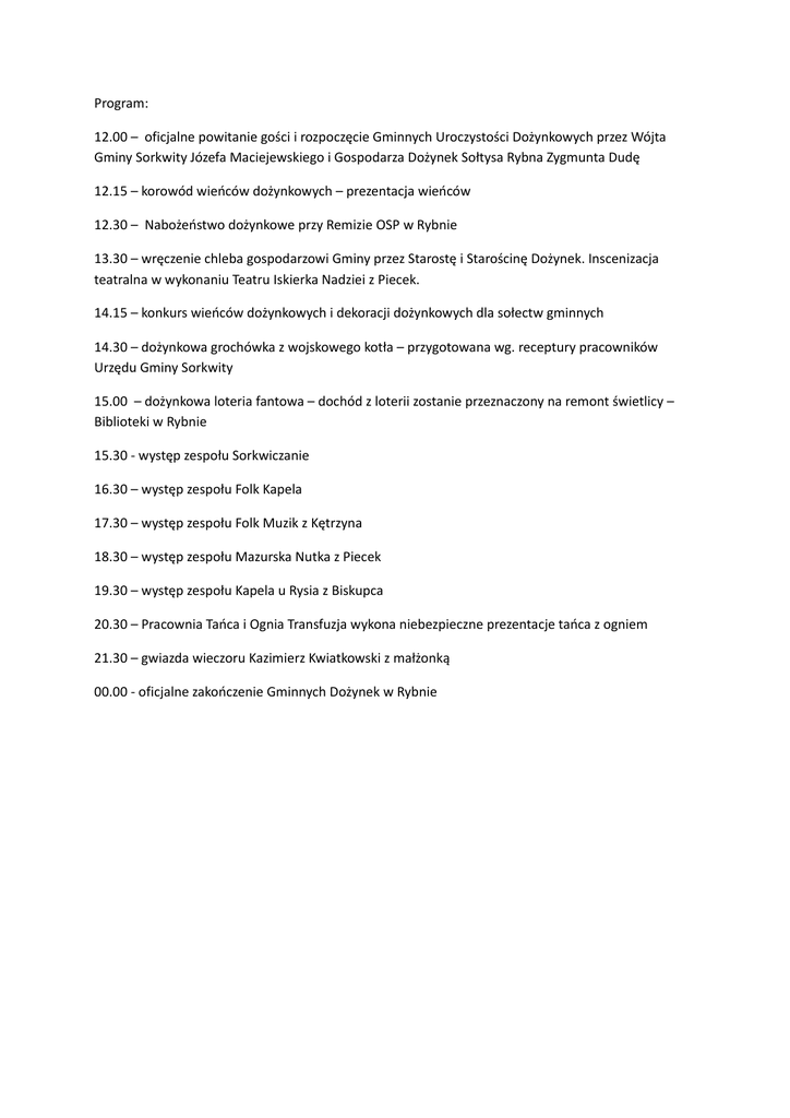 Program: 12.00 – oficjalne powitanie gości i rozpoczęcie Gminnych Uroczystości Dożynkowych przez Wójta Gminy Sorkwity Józefa Maciejewskiego i Gospodarza Dożynek Sołtysa Rybna Zygmunta Dudę 12.15 – korowód wieńców dożynkowych – prezentacja wieńców 12.30 – Nabożeństwo dożynkowe przy Remizie OSP w Rybnie 13.30 – wręczenie chleba gospodarzowi Gminy przez Starostę i Starościnę Dożynek. Inscenizacja teatralna w wykonaniu Teatru Iskierka Nadziei z Piecek. 14.15 – konkurs wieńców dożynkowych i dekoracji dożynkowych dla sołectw gminnych 14.30 – dożynkowa grochówka z wojskowego kotła – przygotowana wg. receptury pracowników Urzędu Gminy Sorkwity 15.00 – dożynkowa loteria fantowa – dochód z loterii zostanie przeznaczony na remont świetlicy – Biblioteki w Rybnie 15.30 - występ zespołu Sorkwiczanie 16.30 – występ zespołu Folk Kapela 17.30 – występ zespołu Folk Muzik z Kętrzyna 18.30 – występ zespołu Mazurska Nutka z Piecek 19.30 – występ zespołu Kapela u Rysia z Biskupca 20.30 – Pracownia Tańca i Ognia Transfuzja wykona niebezpieczne prezentacje tańca z ogniem 21.30 – gwiazda wieczoru Kazimierz Kwiatkowski z małżonką 00.00 - oficjalne zakończenie Gminnych Dożynek w Rybnie