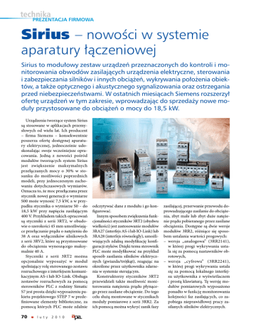 technika PREZENTACJA FIRMOWA Sirius – nowości w systemie aparatury łączeniowej Sirius to modułowy zestaw urządzeń przeznaczonych do kontroli i monitorowania obwodów zasilających urządzenia elektryczne, sterowania i zabezpieczania silników i innych obciążeń, wykrywania położenia obiektów, a także optycznego i akustycznego sygnalizowania oraz ostrzegania przed niebezpieczeństwami. W ostatnich miesiącach Siemens rozszerzył ofertę urządzeń w tym zakresie, wprowadzając do sprzedaży nowe moduły przystosowane do obciążeń o mocy do 18,5 kW. Urządzenia tworzące system Sirius są stosowane w aplikacjach przemysłowych od wielu lat. Ich producent – firma Siemens – konsekwentnie poszerza ofertę dostępnej aparatury elektrycznej, jednocześnie udoskonalając swoje wcześniejsze opracowania. Jedną z nowości pośród modułów tworzących system Sirius jest zwiększenie maksymalnych przełączanych mocy o 30% w stosunku do możliwości poprzednich modeli, przy jednoczesnym zachowaniu dotychczasowych wymiarów. Oznacza to, że moc przełączana przez stycznik nowej generacji o wymiarze S00 może wynosić 7,5 kW, a w przypadku stycznika o wymiarze S0 – do 18,5 kW przy napięciu zasilającym 400 V. Przykładem takich opracowań są styczniki z serii 3RT2, w obudowie o szerokości 45 mm umożliwiające przełączanie prądu o natężeniu do 38 A oraz wyłączników silnikowych z serii 3RV2, które są przystosowane do obciążenia wynoszącego maksymalnie 40 A . Styczniki z serii 3RT2 można opcjonalnie wyposażyć w moduł spełniający rolę sterowanego zestawu rozruchowego z interfejsem komunikacyjnym AS-i lub IO-Link. Obsługa zestawów rozruchowych za pomocą sterowników PLC z rodziny Simatic S7 jest prosta dzięki wyposażeniu pakietu projektowego STEP 7 w predefiniowane elementy biblioteczne, za pomocą których PLC może zdalnie 70 lu t y 20 1 0 odczytywać dane z modułu i go konfigurować. Innym sposobem zwiększenia funkcjonalności styczników 3RT2 (obydwu wielkości) jest zastosowanie modułów 3RA27 (interfejs AS-i lub IO-Link) lub 3RA28 (interfejs równoległy), umożliwiających zdalną modyfikację konfiguracji styków. Dzięki temu sterownik PLC może modyfikować na przykład sposób zasilania silników elektrycznych (gwiazda/trójkąt), reagując na określone przez użytkownika zdarzenia w systemie sterującym. Konstruktorzy styczników 3RT2 przewidzieli także możliwość monitorowania natężenia prądu płynącego przez zasilane obciążenie. Do tego celu służą montowane w stycznikach moduły pomiarowe z serii 3RR2. Za ich pomocą można wykryć zanik fazy zasilającej, przerwanie przewodu doprowadzającego zasilanie do obciążenia, zbyt małe lub zbyt duże natężenie prądu pobieranego przez zasilane obciążenia. Dostępne są dwie wersje modułów 3RR2, różniące się sposobem ustalania wartości progowych: –– wersja „analogowa” (3RR2141), w której progi wykrywania ustala się za pomocą nastawników obrotowych, –– wersja „cyfrowa” (3RR2241), w której progi wykrywania ustala się za pomocą lokalnego interfejsu użytkownika z wyświetlaczem i prostą klawiaturą. Tę wersję modułów pomiarowych wyposażono ponadto w funkcję monitorowania kolejności faz zasilających, co zapobiega nieprawidłowej pracy zasilanych silników elektrycznych. technika PREZENTACJA FIRMOWA Kolejną nowością w systemie Sirius odular są moduły umożliwiające buM dowanie konfigurowalnych systemów zasilania odbiorów, przede wszystkim silników elektrycznych. Przykładem takich rozwiązań są m.in. systemy 3RV29 lub 3RA6. Od strony montażowej są one identyczne: w specjalnym systemie szynowym zatrzaskiwany jest moduł zestawu rozruchowego lub rozrusznik kompaktowy z zaciskami do wyboru - śrubowymi, sprężynowymi lub oczkowymi. Dzięki możliwości elastycznego doboru poszczególnych elementów, użytkownik może wybrać optymalną dla swojej aplikacji konfigurację, co nie tylko zwiększa niezawodność działania zabezpieczenia, ale zmniejsza także jego koszt. Ważną w aplikacjach przemysłowych cechą systemów 3RV29 oraz 3RA6 jest możliwość zastosowania stabilizowanych mechanicznie zacisków sprężynowych, które doskonale nadają się do stosowania w aplikacjach, w których występują silne drgania lub udary mechaniczne. Podsumowanie Przedstawione w artykule rozwiązania nie stanowią radykalnego przełomu w gamie modułów systemu Sirius, ale zwiększają jego możliwości i elastyczność, dzięki czemu większa niż dotychczas liczba użytkowników będzie mogła dostosować do swoich wymagań optymalną konfigurację systemu zasilającego. Na koniec warto przypomnieć, że wszystkie moduły wchodzące w skład systemu Sirius mają wymagane w aplikacjach przemysłowych certyfikaty U L, CSA oraz IEC. Andrzej C ichocki Siemens Sp. z o.o. Sektor I ndustry IA CE ul. Żupnicza 11 03-821 W arszawa tel. 022 870 91 13 [email protected] www.siemens.pl/sirius