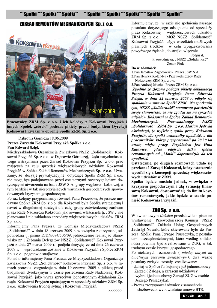 ** Spółki *** Spółki *** Spółki** ** Spółki *** Spółki *** Spółki***** Spółki *** Spółki** ZAKŁAD REMONTÓW MECHANICZNYCH Sp. z o.o. Informujemy, Ŝe w razie nie spełnienia naszego postulatu dotyczącego odstąpienia od sprzedaŜy przez Koksownię większościowych udziałów ZRM Sp. z o.o. , MOZ NSZZ ,,Solidarność” Koksowni Przyjaźń uŜyje wszelkich moŜliwych prawnych środków w celu wyegzekwowania powyŜszego Ŝądania, do strajku włącznie. Podpisał, Przewodniczący NSZZ ,,Solidarność” Zenon Fiuk Do wiadomości: 1.Pan Jarosław Zagórowski- Prezes JSW S.A. 2.Pan Henryk Kolender - Przewodniczący Rady Nadzorczej ZRM Sp. z o.o. 3.Pan Andrzej Mucha- Prezes ZRM Sp. z o.o. Pracownicy ZRM Sp. z o.o. i ich koledzy z Koksowni Przyjaźń i innych Spółek ,,córek” podczas pikiety przed budynkiem Dyrekcji Koksowni Przyjaźń w obronie Spółki ZRM Sp. z o.o. Dąbrowa Górnicza 18.06.2009 Prezes Zarządu Koksowni Przyjaźń Spółka z o.o. Pan Edward Szlęk Międzyzakładowa Organizacja Związkowa NSZZ ,,Solidarność” Koksowni Przyjaźń Sp. z o.o. w Dąbrowie Górniczej, Ŝąda natychmiastowego wstrzymania przez Zarząd Koksowni Przyjaźń Sp. z o.o. prac mających na celu sprzedaŜ większościowych udziałów Koksowni Przyjaźń w Spółce Zakład Remontów Mechanicznych Sp. z o.o. UwaŜamy, Ŝe decyzje prywatyzacyjne dotyczące Spółki ZRM Sp. z o.o. nie mogą być podejmowane przed ostatecznymi rozstrzygnięciami dotyczącymi utworzenia na bazie JSW S.A. grupy węglowo –koksowej, a tym bardziej w tak niesprzyjających warunkach gospodarczych spowodowanych kryzysem gospodarczym. Po raz kolejny przypominamy równieŜ Panu Prezesowi, Ŝe jeszcze niedawno Spółka ZRM Sp. z o.o. dla Koksowni była Spółką strategiczną i nawet w długoletniej strategii dla całej grupy zatwierdzonej zarówno przez Radę Nadzorcza Koksowni jak równieŜ właściciela tj. JSW , nie planowano i nie zakładano sprzedaŜy większościowych udziałów ZRM Sp. z o.o. . Informujemy Pana Prezesa, Ŝe Komisja Międzyzakładowa NSZZ ,,Solidarność” w dniu 18 czerwca 2009 r. w związku z otrzymaną odpowiedzią tj. pismo D/DN/074/506/09, jednocześnie realizując Stanowisko nr 1 Zebrania Delegatów NSZZ ,,Solidarność” Koksowni Przyjaźń z dnia 27 marca 2009 r. podjeła decyzję, Ŝe od dnia 26 czerwca 2009 r. wprowadzone zostanie w Koksowni Przyjaźń i Spółce ZRM Sp. z o.o. pogotowie strajkowe. Ponadto informujemy Pana Prezesa, Ŝe Międzyzakładowa Organizacja Związkowa NSZZ ,,Solidarność” Koksowni Przyjaźń Sp. z o.o. w ramach protestu zorganizuje w dniu 19 czerwca 2009 r. pikietę przed budynkiem dyrekcyjnym w czasie posiedzenia Rady Nadzorczej Koksowni Przyjaźń, jako wyraz sprzeciwu jednostronnym działaniom Zarządu Koksowni Przyjaźń upatrującym w sprzedaŜy udziałów ZRM Sp. z o.o. uzdrowienia trudnej sytuacji Koksowni Przyjaźń. >>>>>>> Zgodnie ze złoŜoną podczas pikiety deklamacją Prezesa Koksowni Przyjaźń Pana Edwarda Szlęka, w dniu 22 czerwca 2009 r. odbyło się spotkanie w sprawie Spółki ZRM . Na spotkaniu tym, NSZZ ,,Solidarność” stanowczo potwierdził swoje stanowisko, Ŝe nie zgadza się na sprzedaŜ udziałów Koksowni w Spółce Zakład Remontów Mechanicznych. Przewodniczący NSZZ ,,Solidarność” ZRM Sp. z o.o. Marian Jędryka oświadczył, Ŝe wyjście z rynku pracy Koksowni Przyjaźń, dla spółki oznaczałby upadłość, a dla pracowników, którzy przepracowali po 20,30 lat utratę miejsc pracy. Przykładem jest Huta Katowice, gdzie odejście kilku spółek remontowych od ,,Matki” doprowadziło do ich upadłości. Ostatecznie, po długich rozmowach udało się przekonać Zarząd Koksowni, który ostatecznie wycofał się z koncepcji sprzedaŜy większościowych udziałów w ZRM. Spółka będzie musiała jednak, w związku z kryzysem gospodarczym i złą sytuacją finansową Koksowni, dostosować się do limitu kosztów remontowych, jakie będzie w stanie ponieść Koksownia Przyjaźń. ZUG Sp. z o.o. W kwietniowym Koksiku przedstawiłem pisemne wystawienie Przewodniczącej Komisji NSZZ ,,Solidarność” Zakładu Usług Gospodarczych Jadwigi Nowak, które skierowane było do Prezesa Spółki Pana Jerzego Prusaczyka, z postulatami oszczędnościowymi, które według solidarności powinny być zrealizowane w ZUG, w tak trudnym czasie kryzysu gospodarczego. Po niełatwych rozmowach ( miedzy innymi na burzliwym zebraniu związkowym), dwa waŜne postulaty związku zostały zrealizowane: - dzisiaj w Spółce funkcjonuje juŜ jednoosobowy Zarząd ( Załoga, a zarazem udziałowcy wybrali jednoosobowy Zarząd ZUG w osobie Jerzego Prusaczyka). - Prezes zrezygnował równieŜ z samochodu słuŜbowego, wypowiadając umowę BTS. Koksik str. 3